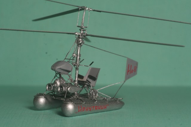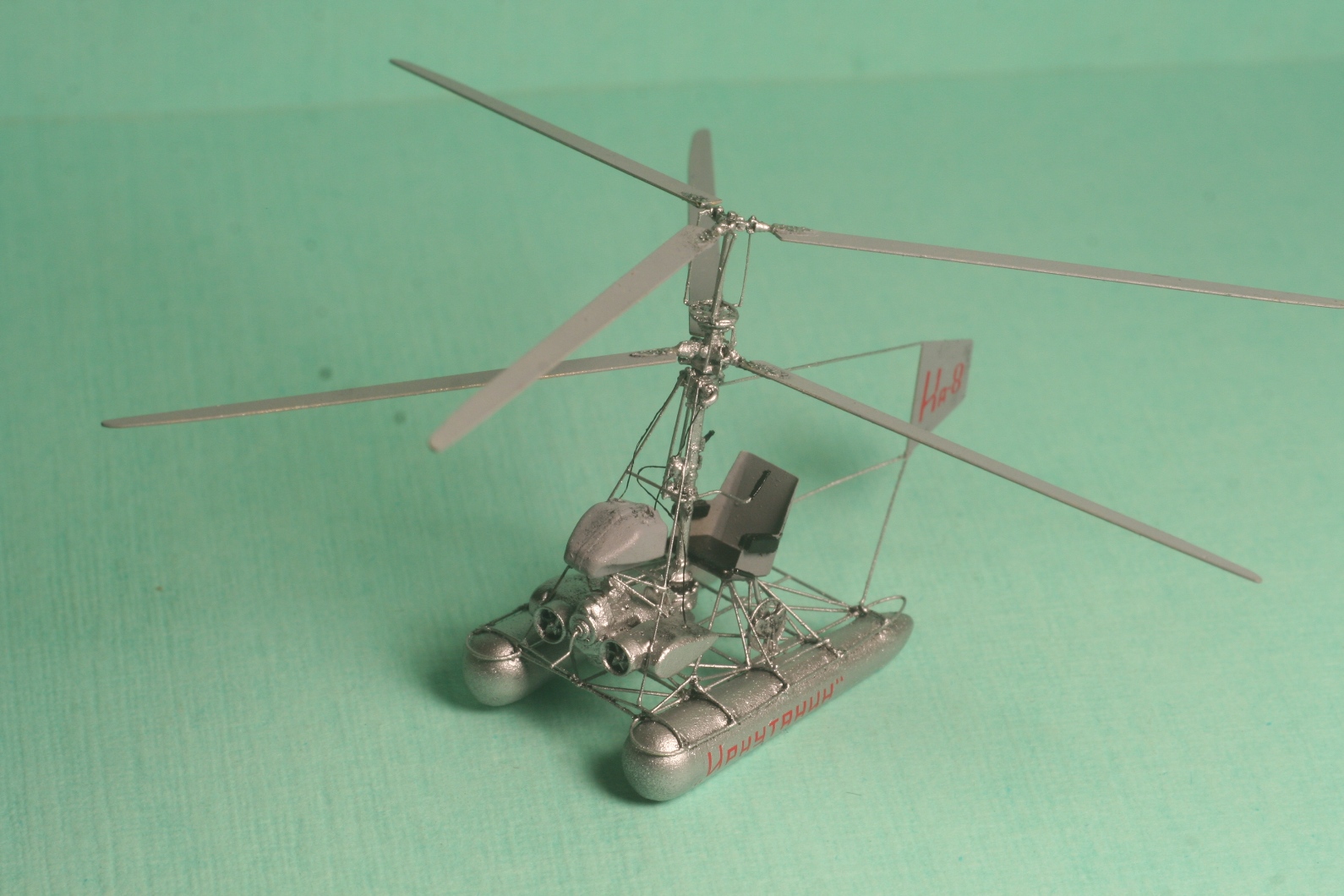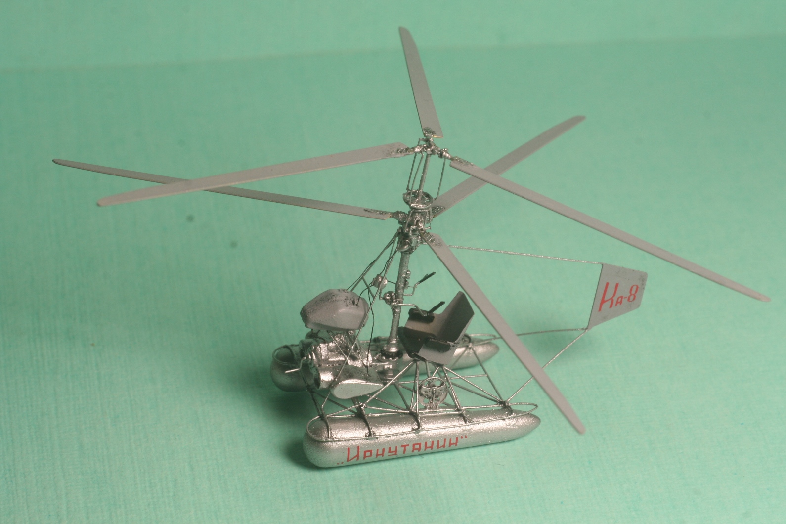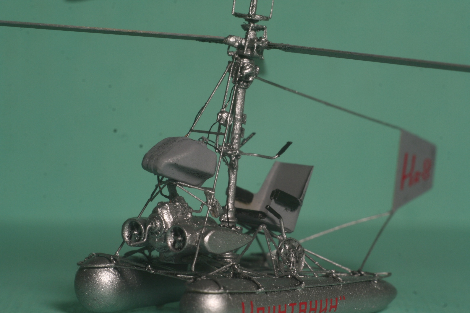 <<...Наконец, первый вертолет Ка-8 был собран и установлен на небольшой постамент. Выглядел он очень красиво. На легкой стальной ферме, покоящейся на двух серебристых баллонах, стоял двигатель с центральным редуктором...>>
