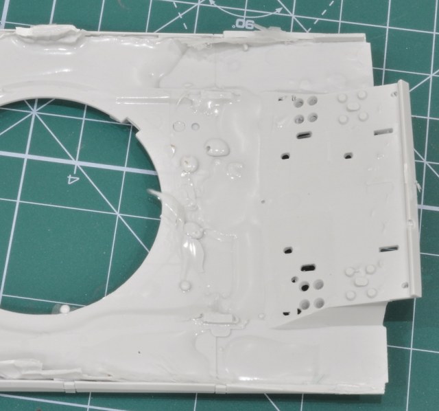 Вот только у каждой медали есть обратная сторона, а она как оказалось так далека от идеала, что просто даже не знаю что сказать. Сплошные наплывы, провалы, волны и какие-то вспучившиеся пеньки, с пузырьками, просто лунный ландшафт, в общем, работы по выравниванию и подгонки под ванну корпуса Т-72 просто за край нужно как обычно запасаться терпением.