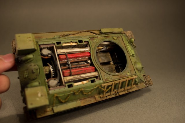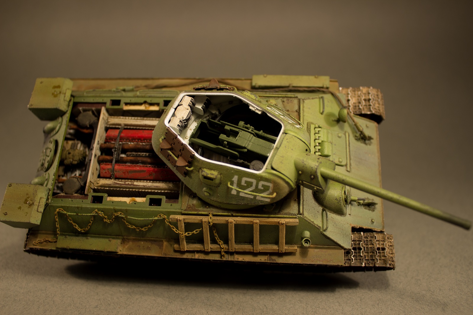 Первый ответ - нет, съемны только крышки. Второй ответ - из-за того что не совсем гладко некоторые катки ходят. Извините не заметил). Ходовую пришлось пачкать из-за щелей образовавшихся после сборки. Модель красилась частями сначала кишочки потом оболочка.