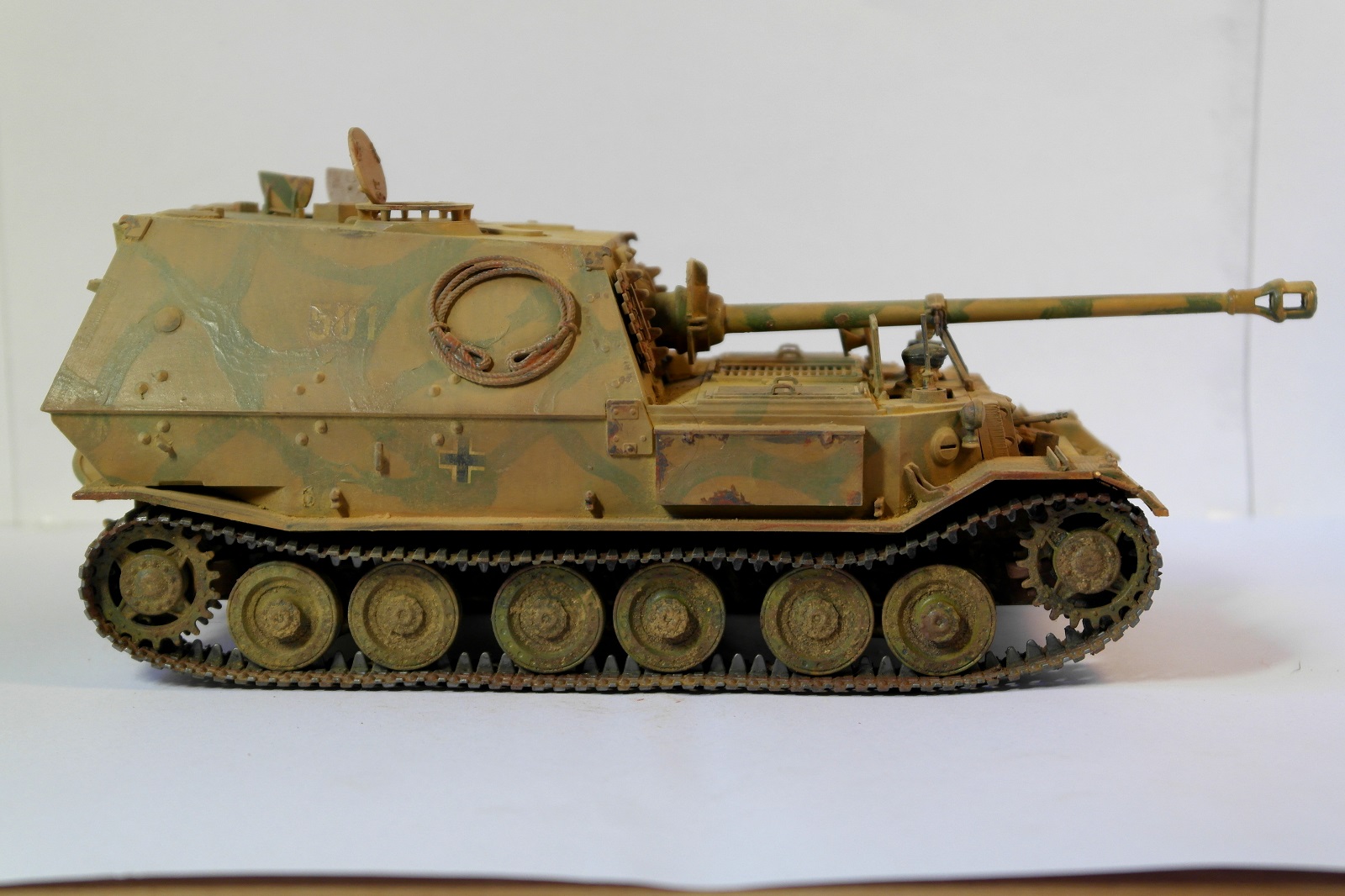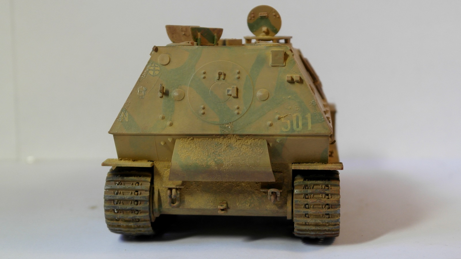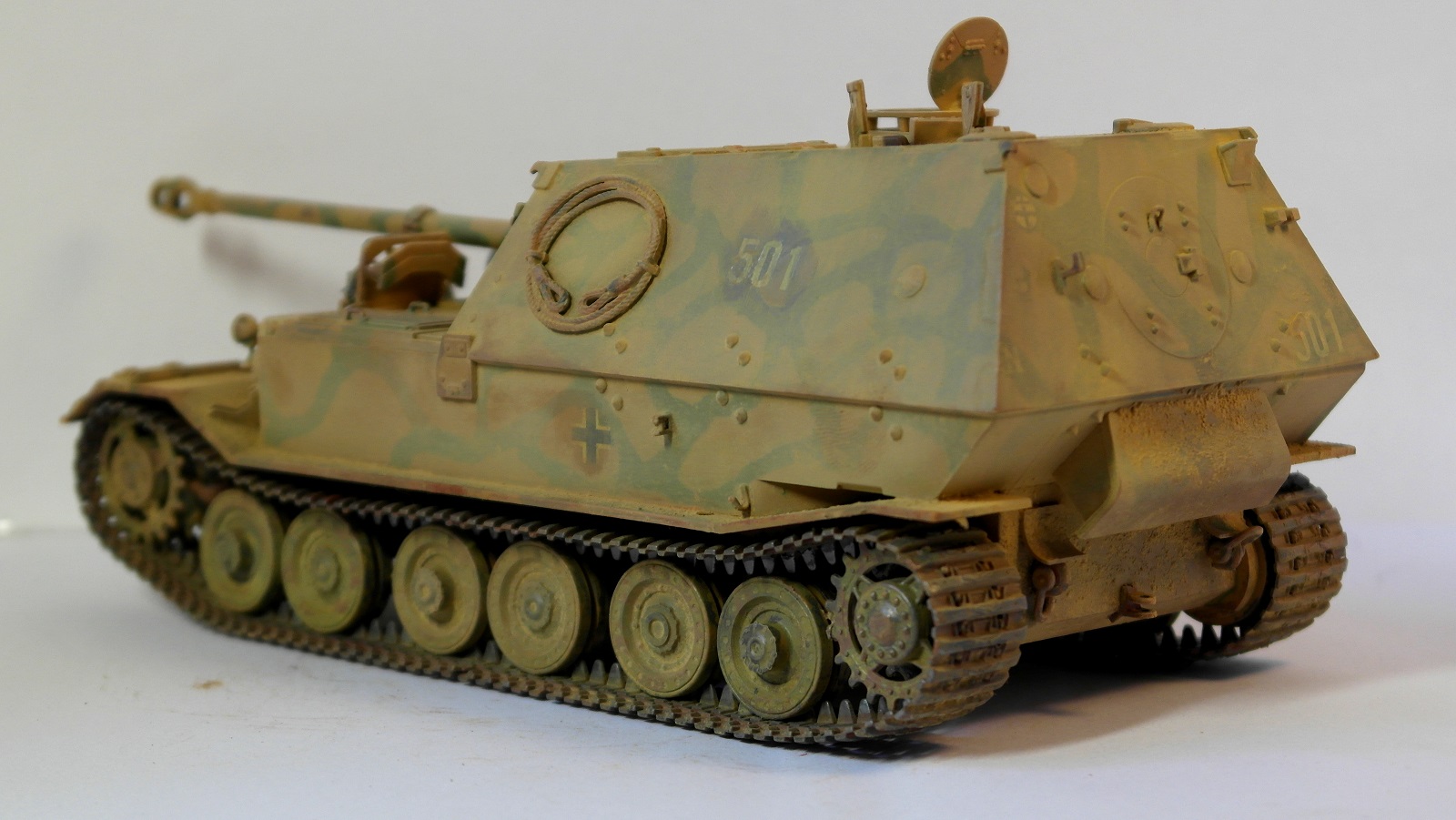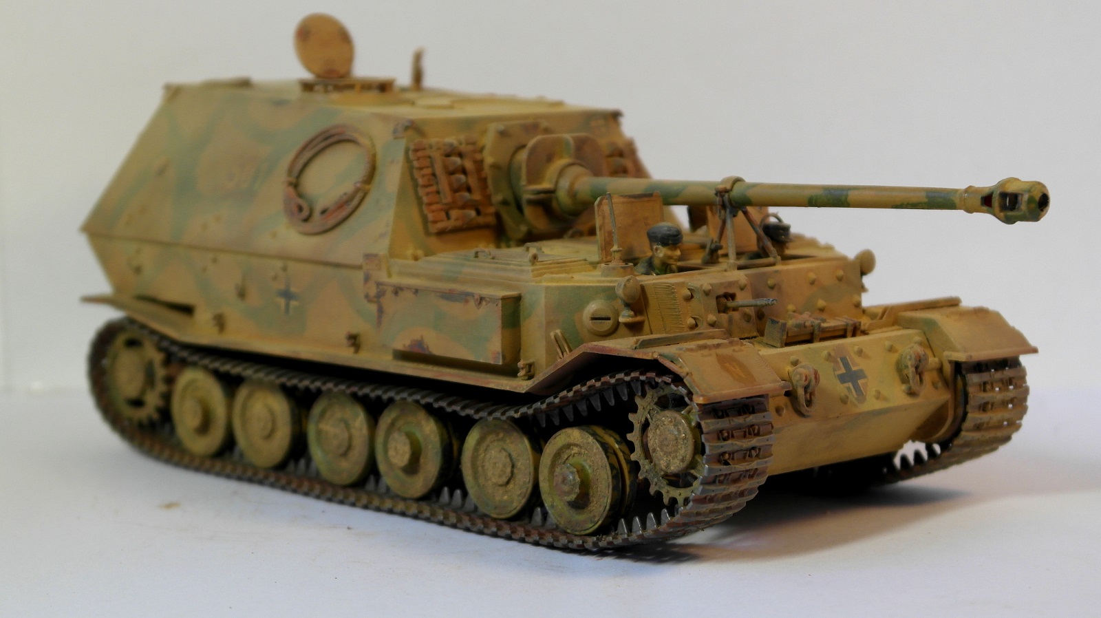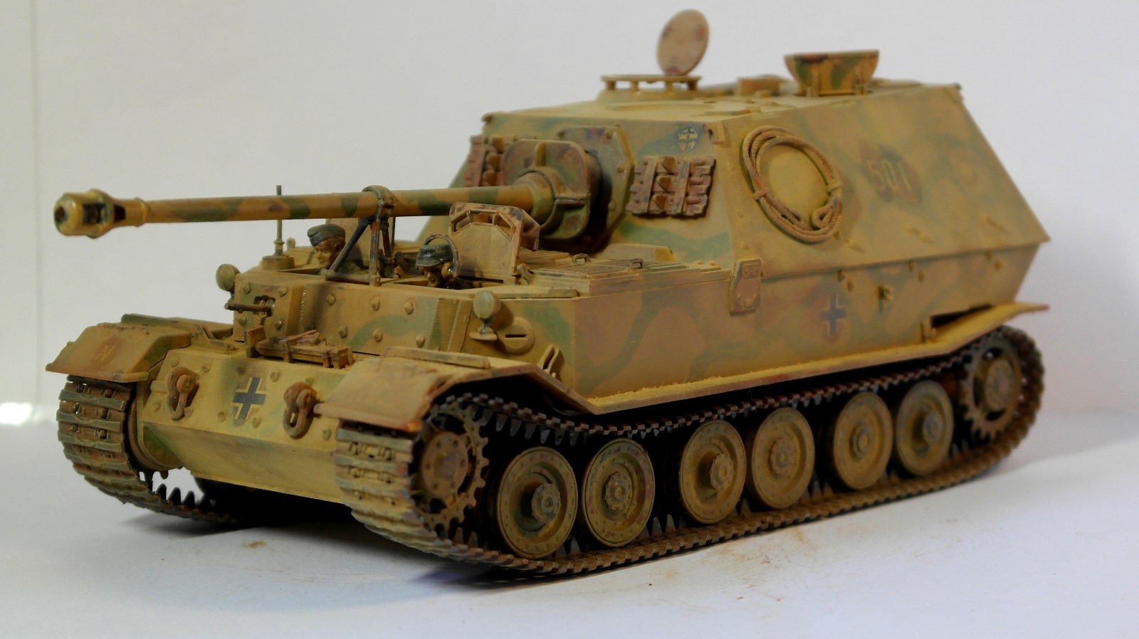 ИМХО смывку надо бы...Если она и есть то совершенно неконтрастная, не подчеркивает выступающие детали. Крест на лобовой броне приклеен криво. Про закрашенные фары сказали, не сказали про незачищенный литьевой шов на правой. Желательно добавить фото сверху. Можно добавить блеска на зубьях звездочки и гребнях траков.