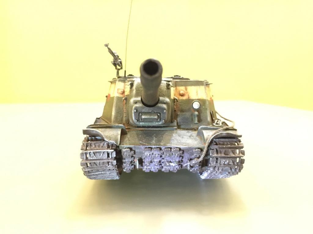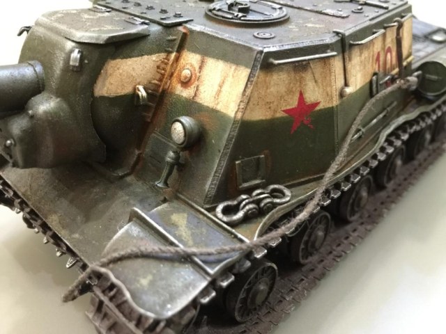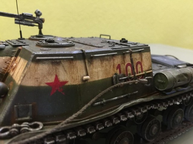 Смывка Тамиевская. Декаль "100" взял от когда-то собранного Мауса. Подтеки и ржавичу делал Миговской химией. Пигменты "дорожная пыль" были от Мастер-Пигмента. Плохо получились буксировочные тросы. Честно говоря, я поленился использоват стальной трос (хотя такой и был в наличии) и использовал веревки. Поэтому смотрятся они не как стальные буксировочные тросы, а как автобуксировка.