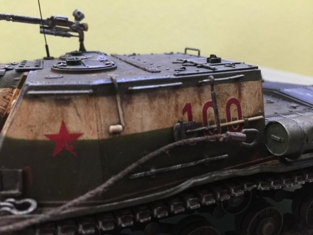 Траки одеты с обеих сторон по-разному. Траки идут через один: гребень-пустой, а запасные почему-то все с гребнем. Тросы так не должны легко лежать на броне, у них есть штатное место на корме и соответствующие крепления. Про полки сказали, но я повторюсь: их толщина должна быть гораздо меньше, чем показываете вы. Не видно проводки к фаре и звуковому сигналу.