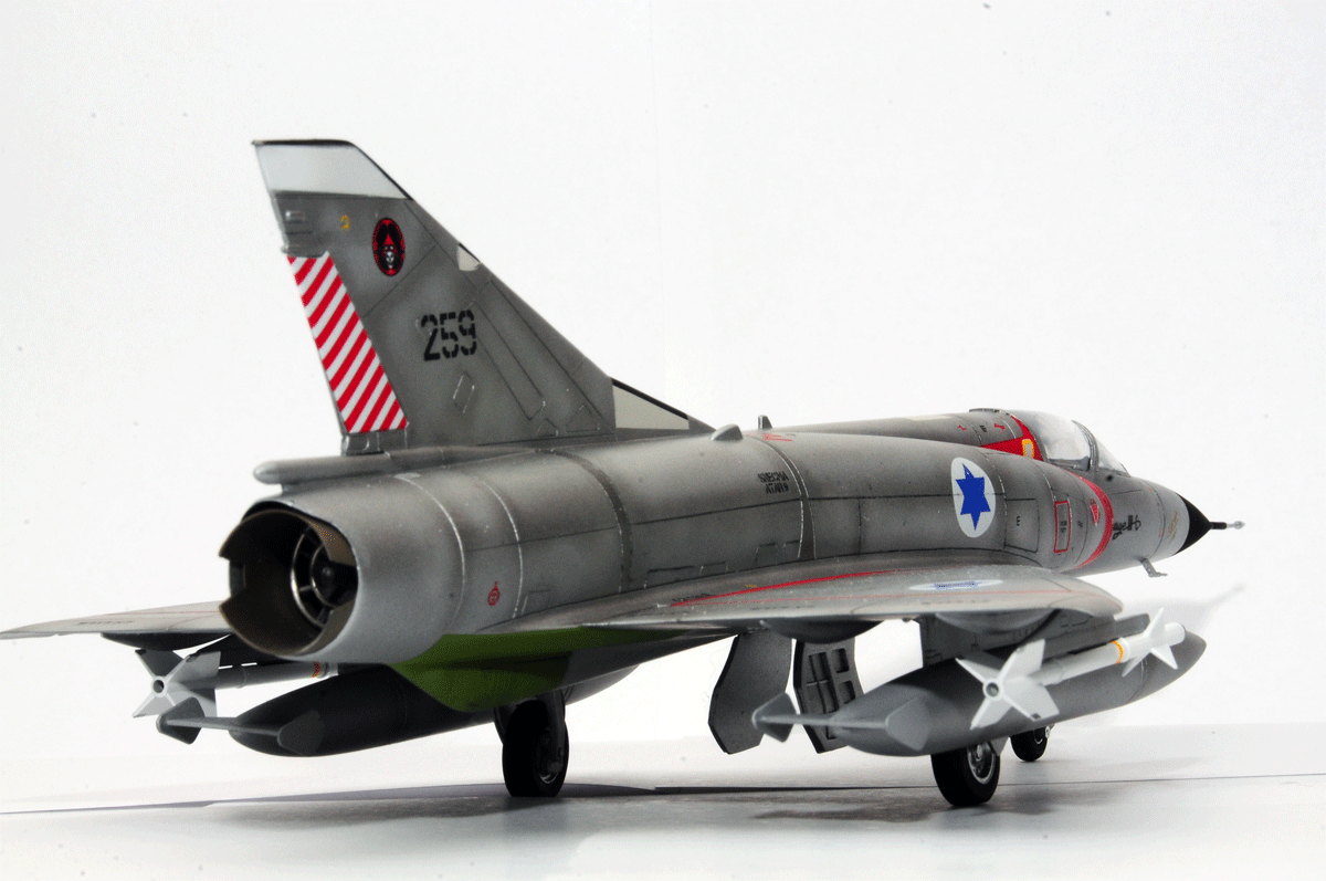 Здравствуйте,друзья!Закончил модель Миража израильских ВВС из первой эскадрильи.Борт известный,на нём в разное время,разными пилотами было сбито 13 машин противника.Серьёзно бился 7 октября 1973г,был восстановлен и вернулся в строй в 1974г.После снятия миражей с вооружения израильских ВВС,был продан в Аргентину,им после Фолклендского конфликта как раз потребовались машины,что бы пополнить парк.В 2003 вернулся в Израиль.Вот некоторые из побед.