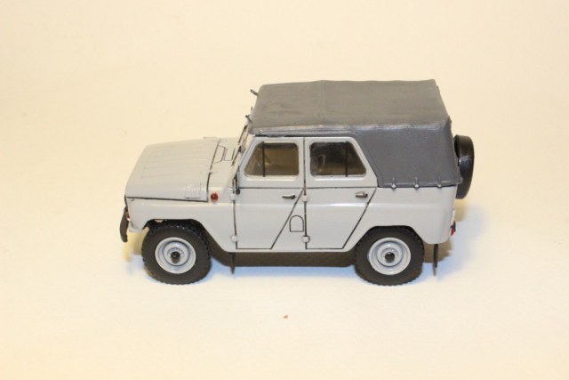 Габариты спереди заменены на разделенные нового типа; сделаны жабры на капоте; установлены дублеры поворта за капотом; дворники перенесены вниз; обозначены детали сверху на лобовом для установки лобового стекла в откинутом положении, чтобы не разбилось; зеркала нового типа; сзади так же заменены фонари на новый тип, обозначен задний ход и подсветка номера; запасное колесо обозначено кожухом с логотипом УАЗа; номера с реального автомобиля такой же модификации; тент покрашен темным серым; в салоне металлические части в цвет машины; на донышке немного обозначены агрегаты.