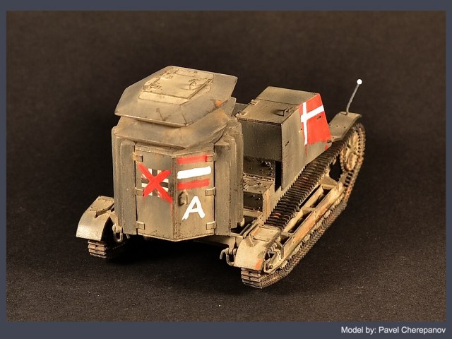 Модель была окрашена частями - сама танкетка в светло-серый цвет, поскольку по моим предположениям их окрашивали из запасов краски Люфтваффе. А более поздняя конверсия с установкой гармошки сопровождалось окраской ее в более темный серый цвет, полоски камуфляжа немного заметны на фото. Датчане закрасили кресты и нанесли свои обозначения на танкетку, я имитировал их как с помощью трафарета, так и кистью, с грубыми мазками и подтеками краски. Тонировка с использованием моих стандартных методов.