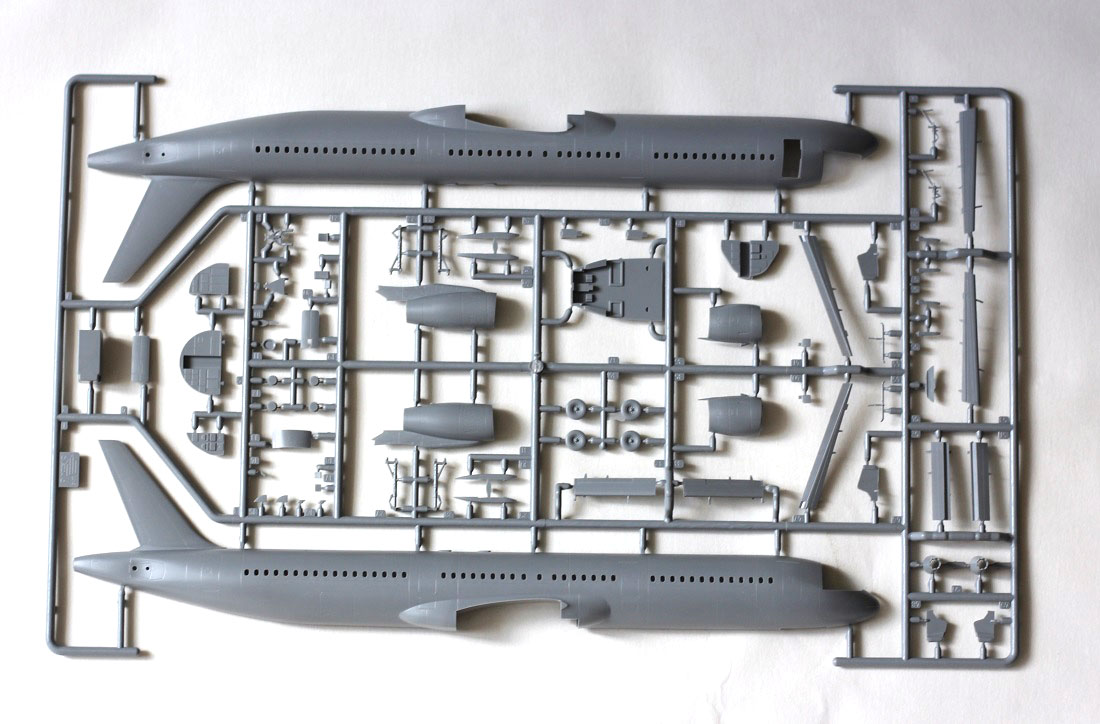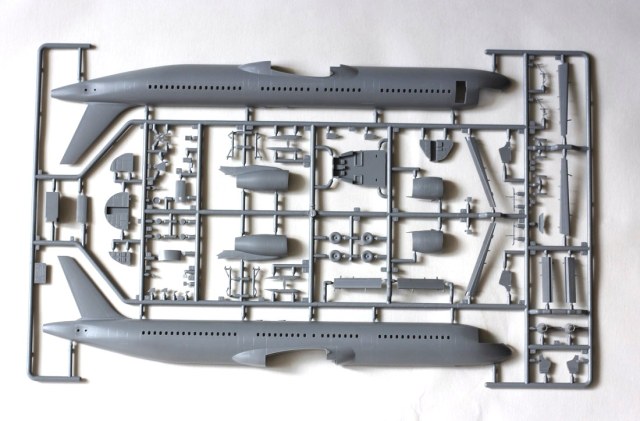 Два из трех основных литников идентичны А320. Третй литник с фюзеляжем и отличающимися деталями оперения. Исправлена форма иллюминаторов. Как на 320м два варианта двигателей и шасси.