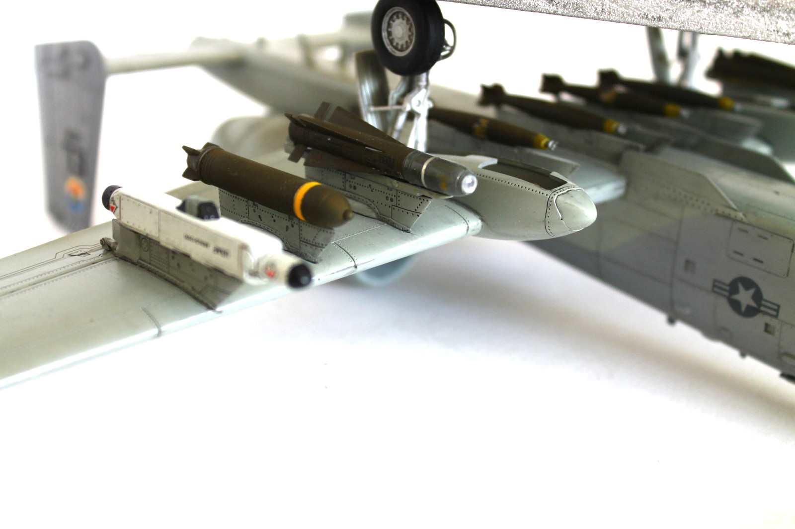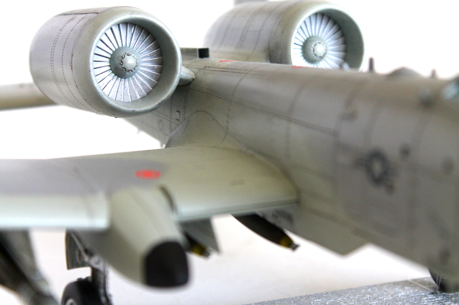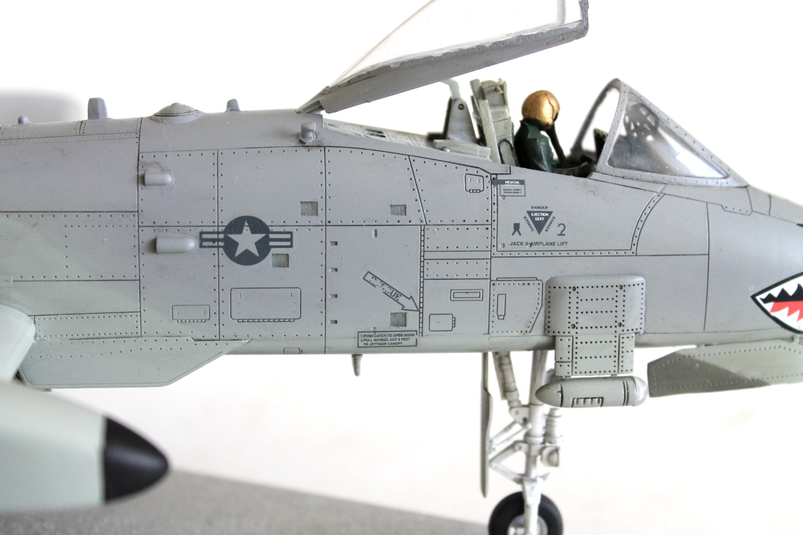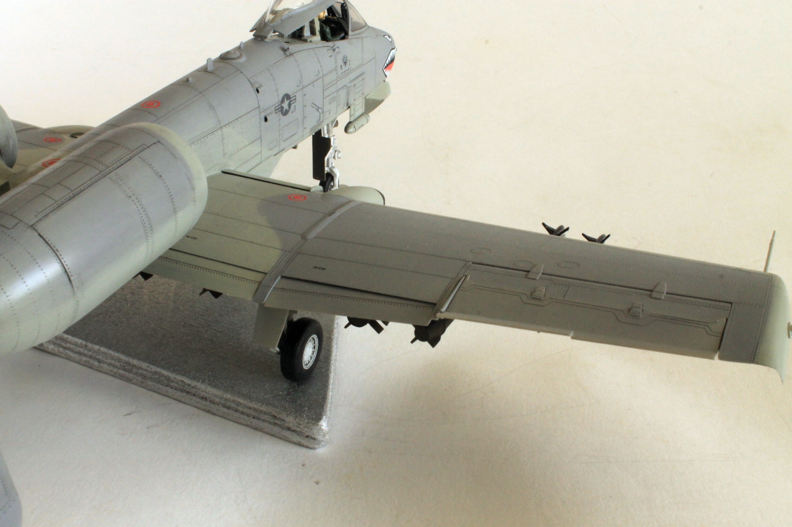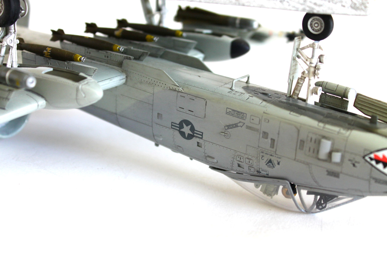 Помимо переплета фонаря, о котором вы сами сказали, внутреннюю часть остекления, желательно было, покрасить в черный или в темно-серый цвет интерьера кабины. Достаточно броски на мой взгляд выполненный накрас черным на правом крыле, следы толкателя с внешней стороны на лючке лесенки пилота, швы на обоих соплах движков, на левом крыле неаккуратно вклеен элемент элерона крыла, швы на стойках, складки деки и не плотное прилегание - оскала на носу, местами скрывающаяся расшивка и клепка.