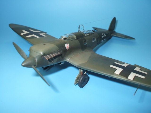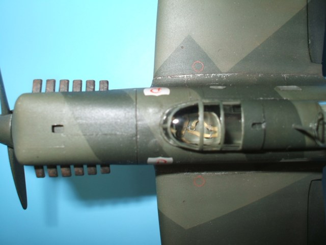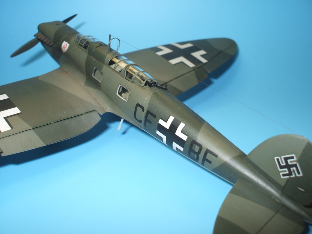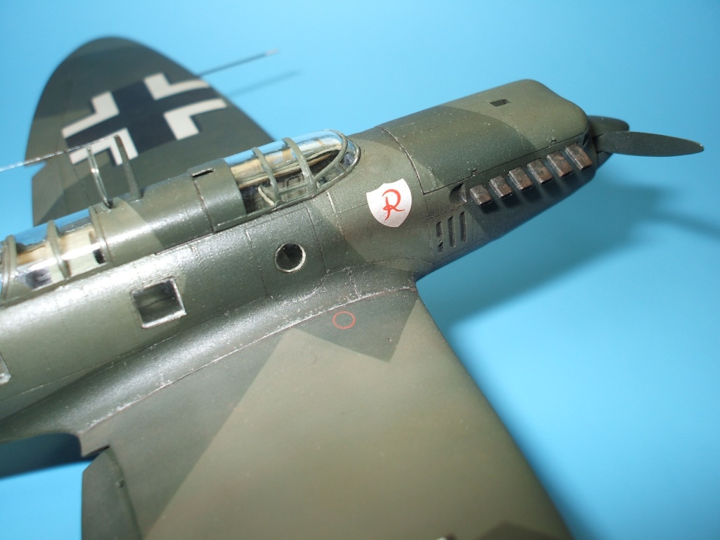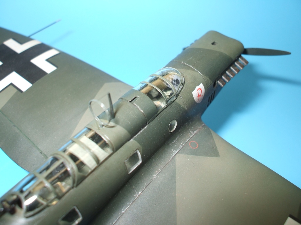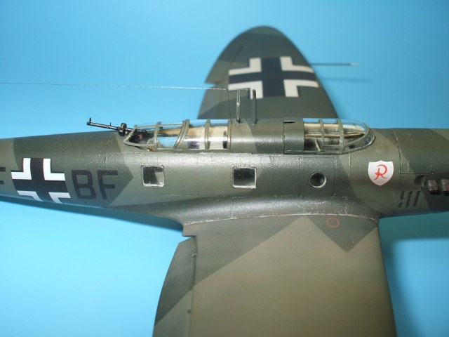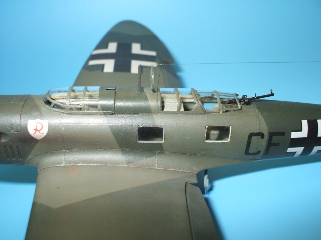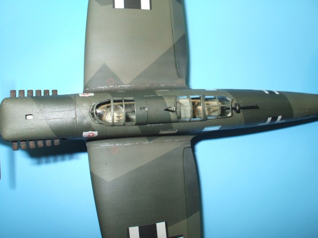 Но это все не про Не 70. Модель была приобретена сразу же после появления её в Одессе и «теория о ранних отливках» сработала. Сборка данного кита действительно доставила море удовольствия! Весе собиралось практически «на щелчок», подгонка деталей просто замечательная, шпаклевки – минимум и то в крайних случаях по необходимости. Единственное что, в процессе сборки модели фюзеляж в определенных местах лишился клепа и по этому пришлось подобрать зубчатое колесико с подходящим шагом и сделать новую накатку для восстановления клепки(такой мелкой я еще не пользовался!). Доработки были произвебены минимальные : металлическая мачта антенны и ПВД, антенна РПК из тонкой проволоки, доработан пулемет MG-15, сделаны АНО, рассверлены выхлопные патрубки . Нарекание вызывает инструкция, хоть внутрянка и бедная, но по некоторым позициям что куда лепить … – как говориться « без полбанки не разберешься» Изначально хотел несколько доработать пилотский простор и место стрелка-радиста довольно не мелкими недостающими деталями, но что то мне не внушило доверие остекление из набора, по этому решил отделаться привязными ремнями из сигаретной фольги с проволочными пряжками. Собрал планер со всеми «потрохами», перед установкой фонари промазал футурой с внутренней стороны и приклеил на положенные места… и, о чудо, через эти стекляшки стало что то видно! Картина изменилась в корне, когда после снятия масок я промазал футурой и внешнюю сторону остекления. Зато боковое остекление как говориться «с играло злую шутку». Не самым удачным решением разработчика(В. Мучичко) было сделать вклейку бокового остекления «клином». А во всем остальном модель на пятерку!