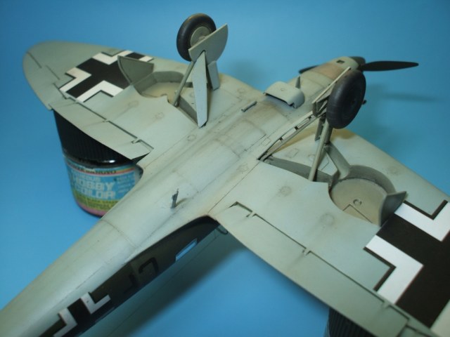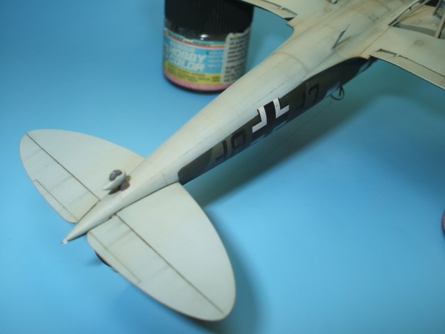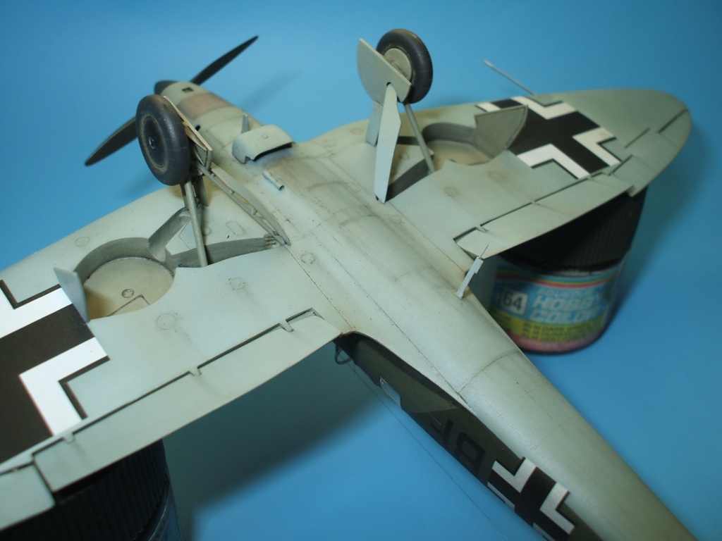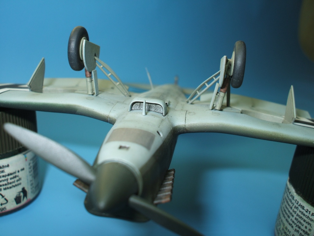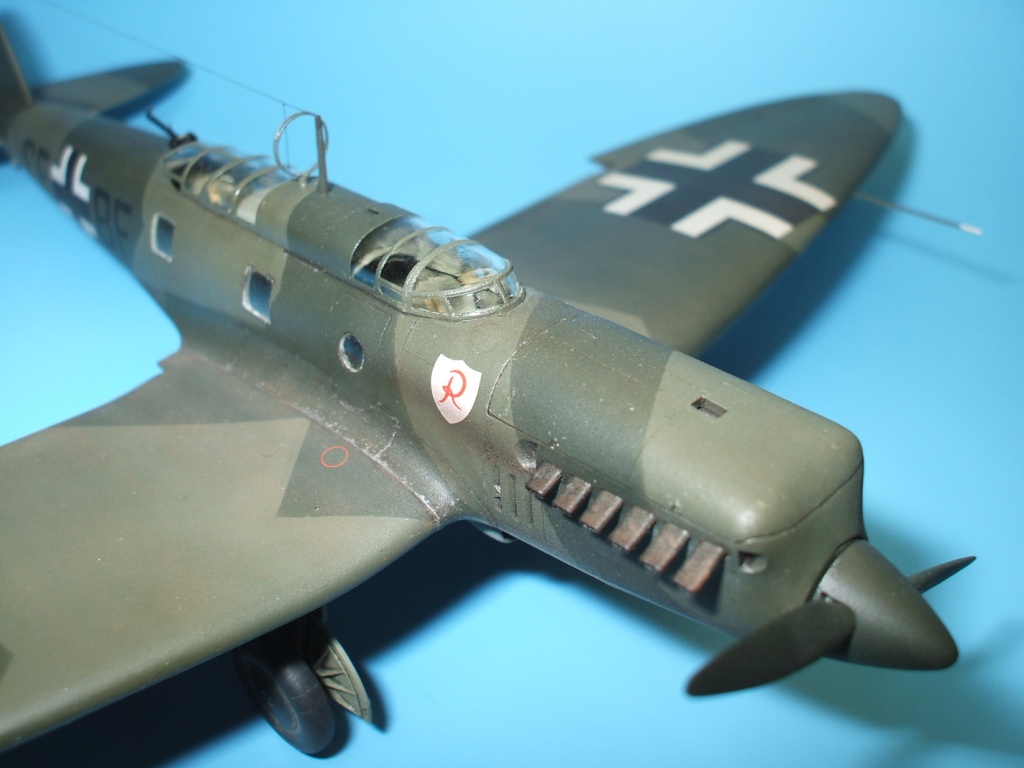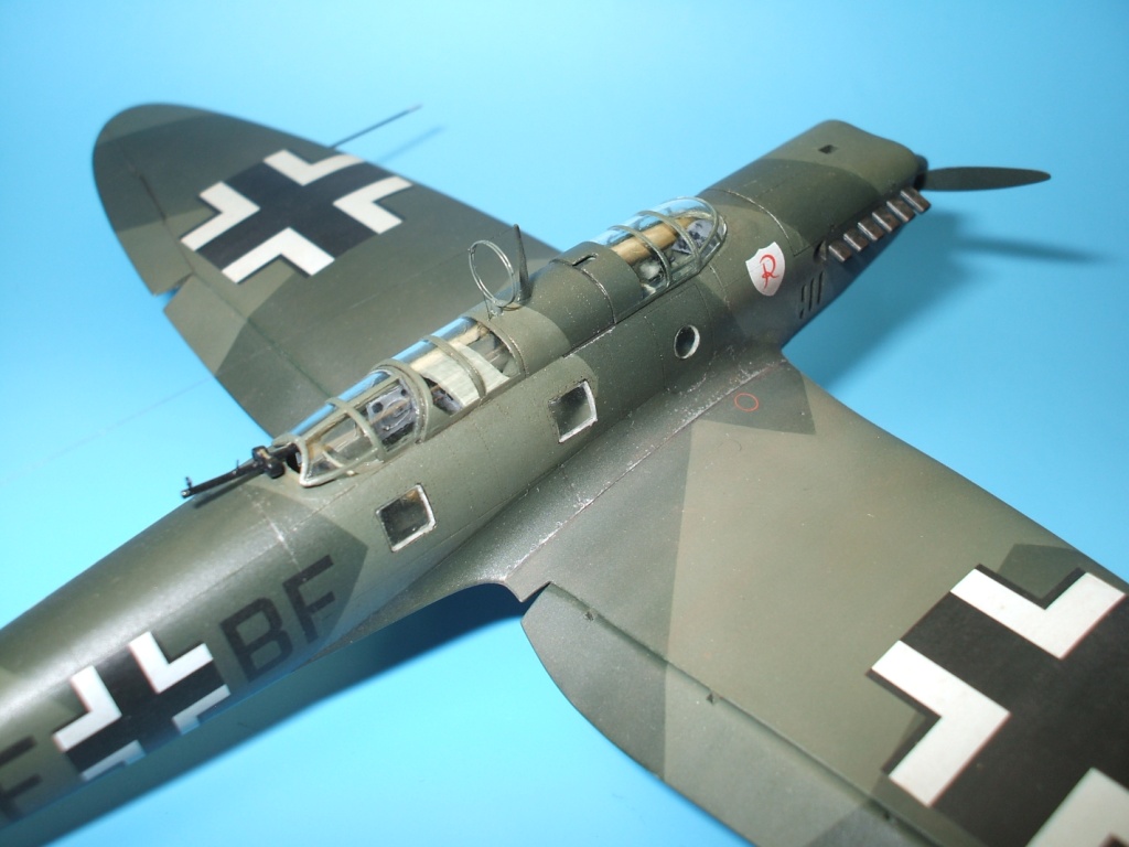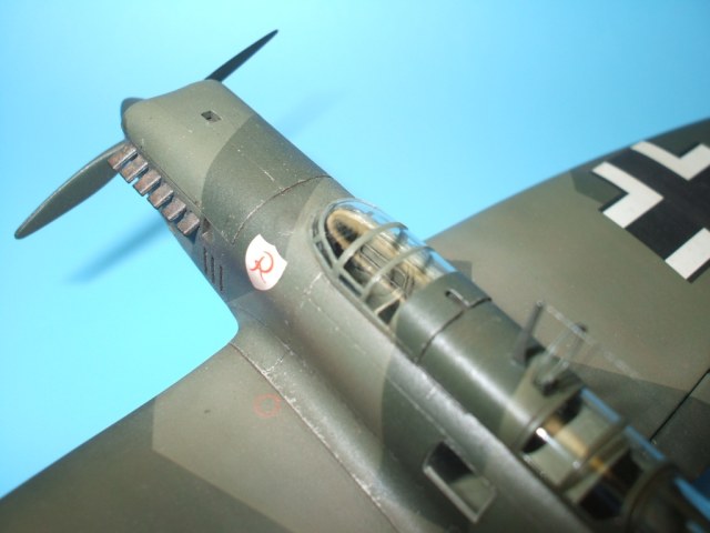 Но это все не про Не 70. Модель была приобретена сразу же после появления её в Одессе и «теория о ранних отливках» сработала. Сборка данного кита действительно доставила море удовольствия! Весе собиралось практически «на щелчок», подгонка деталей просто замечательная, шпаклевки – минимум и то в крайних случаях по необходимости. Единственное что, в процессе сборки модели фюзеляж в определенных местах лишился клепа и по этому пришлось подобрать зубчатое колесико с подходящим шагом и сделать новую накатку для восстановления клепки(такой мелкой я еще не пользовался!). Доработки были произвебены минимальные : металлическая мачта антенны и ПВД, антенна РПК из тонкой проволоки, доработан пулемет MG-15, сделаны АНО, рассверлены выхлопные патрубки . Нарекание вызывает инструкция, хоть внутрянка и бедная, но по некоторым позициям что куда лепить … – как говориться « без полбанки не разберешься» Изначально хотел несколько доработать пилотский простор и место стрелка-радиста довольно не мелкими недостающими деталями, но что то мне не внушило доверие остекление из набора, по этому решил отделаться привязными ремнями из сигаретной фольги с проволочными пряжками. Собрал планер со всеми «потрохами», перед установкой фонари промазал футурой с внутренней стороны и приклеил на положенные места… и, о чудо, через эти стекляшки стало что то видно! Картина изменилась в корне, когда после снятия масок я промазал футурой и внешнюю сторону остекления. Зато боковое остекление как говориться «с играло злую шутку». Не самым удачным решением разработчика(В. Мучичко) было сделать вклейку бокового остекления «клином». А во всем остальном модель на пятерку!