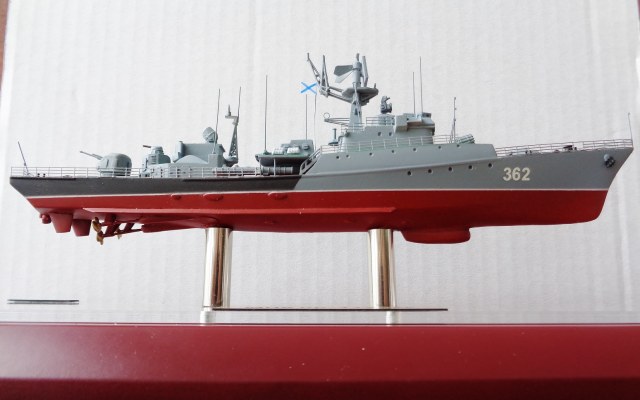 Модель пока не является конкретным "Снежногорском" или скажем "Александровцем", а нанесённый мной бортовой 362 просто навеян светлыми воспоминаниями о легендарной советской цене известного напитка и чисто случайно совпал с "Усть-Лабинском". Впрочем, для приведения кораблика к ЛЮБОМУ прототипу понадобится 2-3 часа, не более - немного изменить мостики и / или установить дополнительно установки постановки пассивных помех. В советском и современном русском флоте служили под 8 десятков "чистых" 1124 и "Эмок", и почти каждый имел какие-то свои особенности.