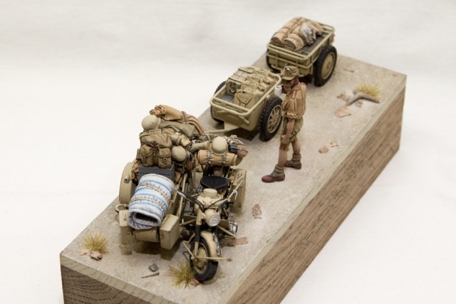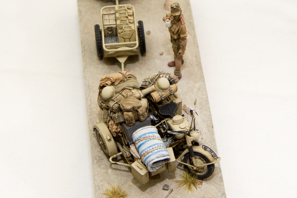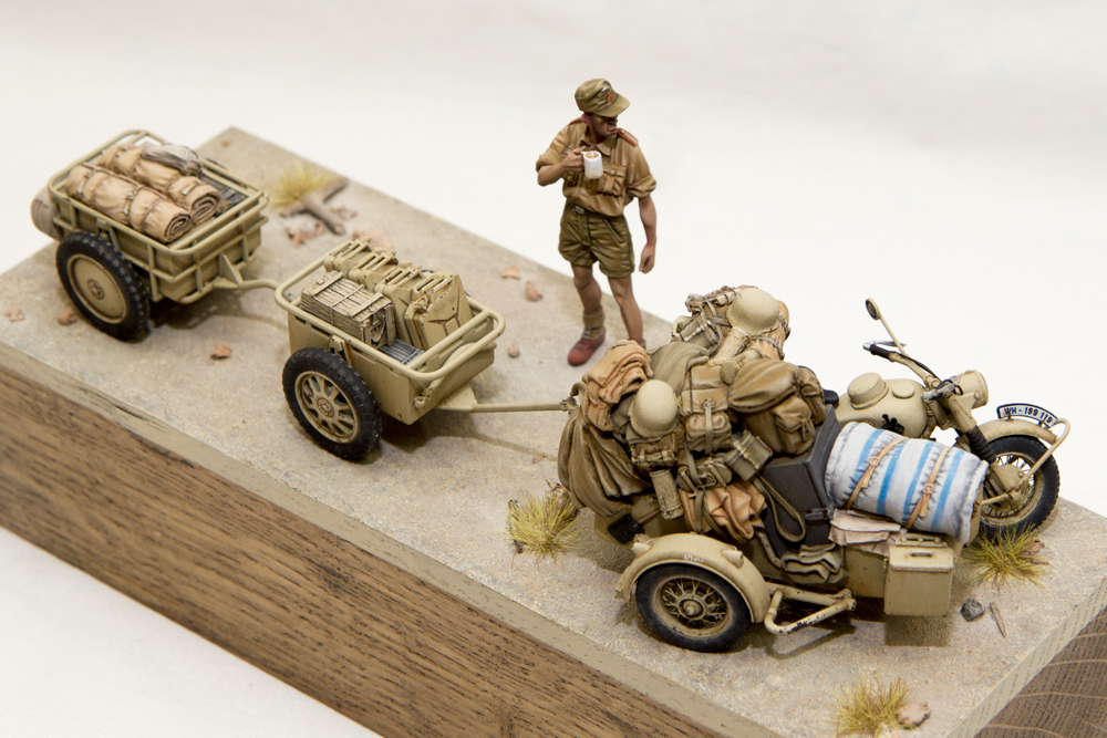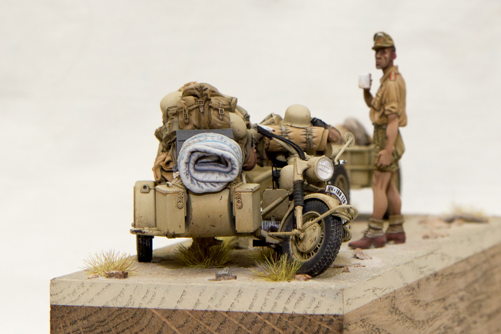 Эту виньетку задумал достаточно давно, но все никак не получалось сначала приобрести сам мотоцикл (L3510), потом долго искал фигурку (MK35 F180). Набор с люлькой и хламом от Black Dog (T35011) ждал своего часа года три.