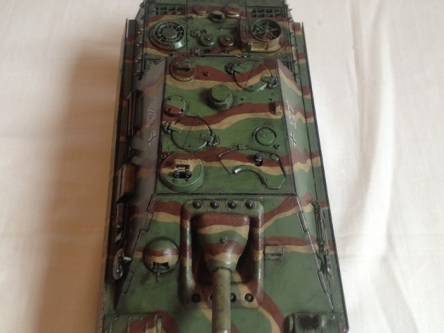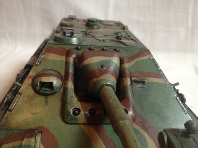 Здравствуйте, представляю вашему вниманию, модель Немецкой "Ягдпантеры" от фирмы Tamiya, это моя первая модель "не от Звезды", сразу скажу, что качество понравилось, все отлично стыкуется, даже не применял шпатлёвку, модель "из коробки", добавил только вырезанный и вышкуренный из литников для фонаря от другой модели - стекло водителя-механика, вообще я не танкист, собираю авиацию и танки никогда не собирал, если не считать танки, собранные лет 12 назад, которые были просто склеены, для игры в солдатики, без покраски, без всего: "Эх, помню я свой первый ТИГР!)". Поэтому, я половину "комплектующих танка" не знаю как кличат. А пришел я к этой самоходке просто: "Я хочу Ягдпантеру!" (ну вы знаете, как это бывает :) ), собрал где-то за месяц, помимо этой модели, есть строящийся авиация, которая застряла в постройке, лежит уже лет 5 - Т-90с, который я все не начинаю, считая что, недостаточно мастерства набрал, ну в общем когда-нибудь дострою! По модели: Краски Tamiya, некоторые цвета смешивал, окрас кистью, сколы - губкой, впервые применял смывку, тоже интересная история: зашел по пути в магазин моделей и у меня по просту не хватило денег, на смывку от Tamiya, а с пустыми руками уходить не хотелось, тут продавщица сказала: "Вот есть ZIP-овская копоть!", я с радостью купил, мужчина в это время выбирающий модель, подслушав, попросил тоже копоть, на что ему ответили: "Копоть уже забрали.", ругался он в общем потом :). Модель, после покраски была очень яркая и чистая, даже новые - так не выглядят, поэтому эта же копоть послужила немножко - фильтром, получилось - не плохо! Не рискнул добавить ржавчины. Чего я боялся в строительстве, так это того - как красить траки! В итоге немножко полазив на форумах, купил себе XF-10 flat brown и с металлической, в несколько слоев, покрасил, тоже добавил смывки, с металлическими "потертостями" слегка переборщил. Получилась в итоге, вот такая модель, исторической привязки нет, нашел картинку с окраской в интернете, в цвет не попал, имея лишь фото с одного борта, в других местах импровизировал. Из своих косяков - потерял люк от перископа, модель переезжала в процессе постройки. Прощу вас - замечания, мне еще Т-90 строить!