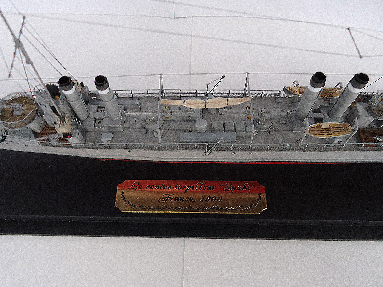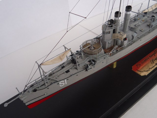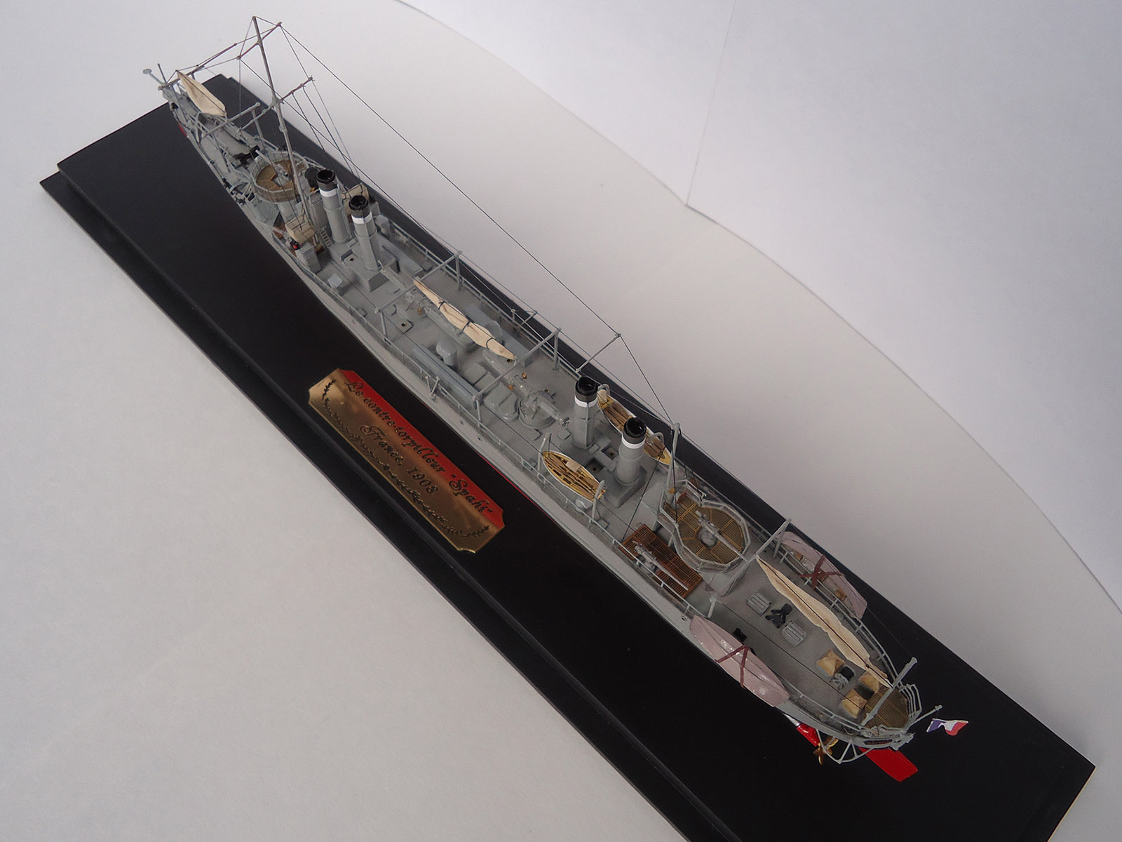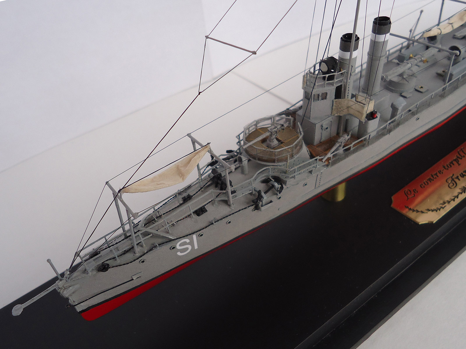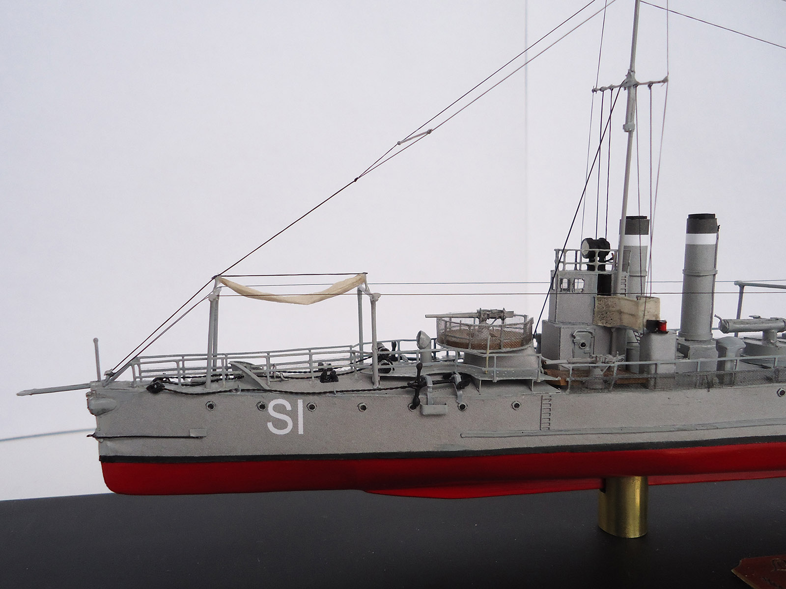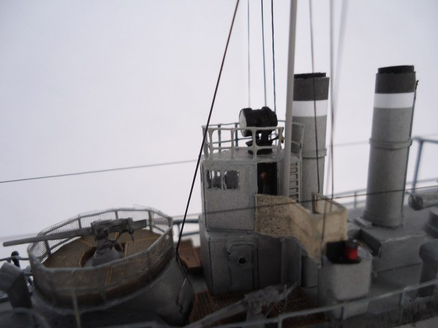 Из того, что бросилось в глаза: неровно приклеенная и отклеившаяся сетка на ограждении орудия и неаккуратно окрашенные леера на рубке и торпедный аппарат.