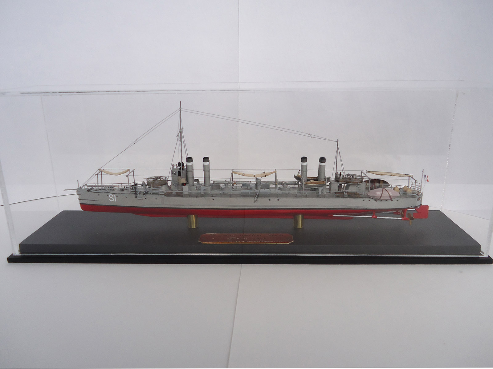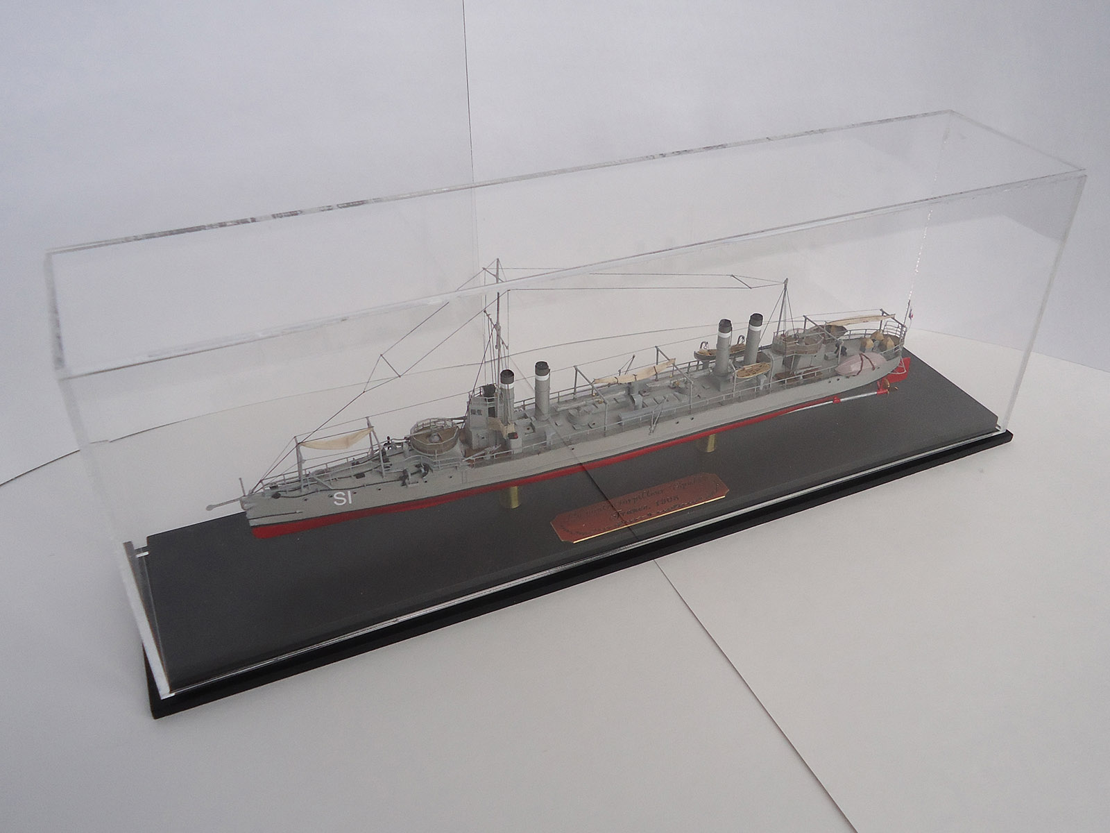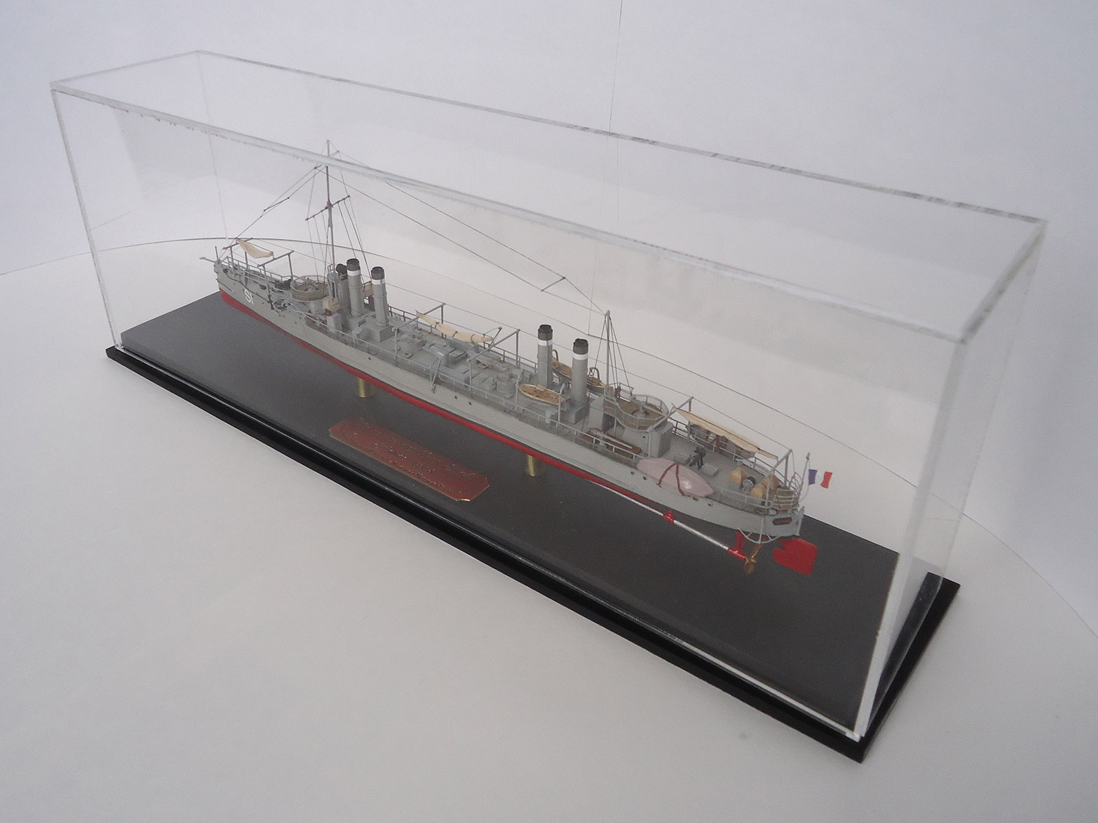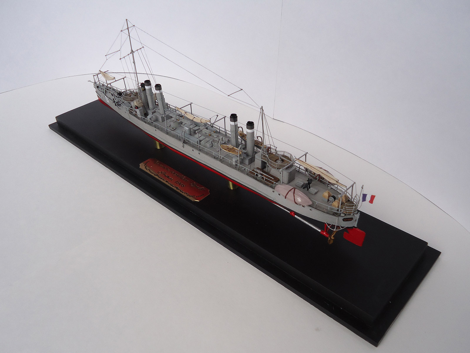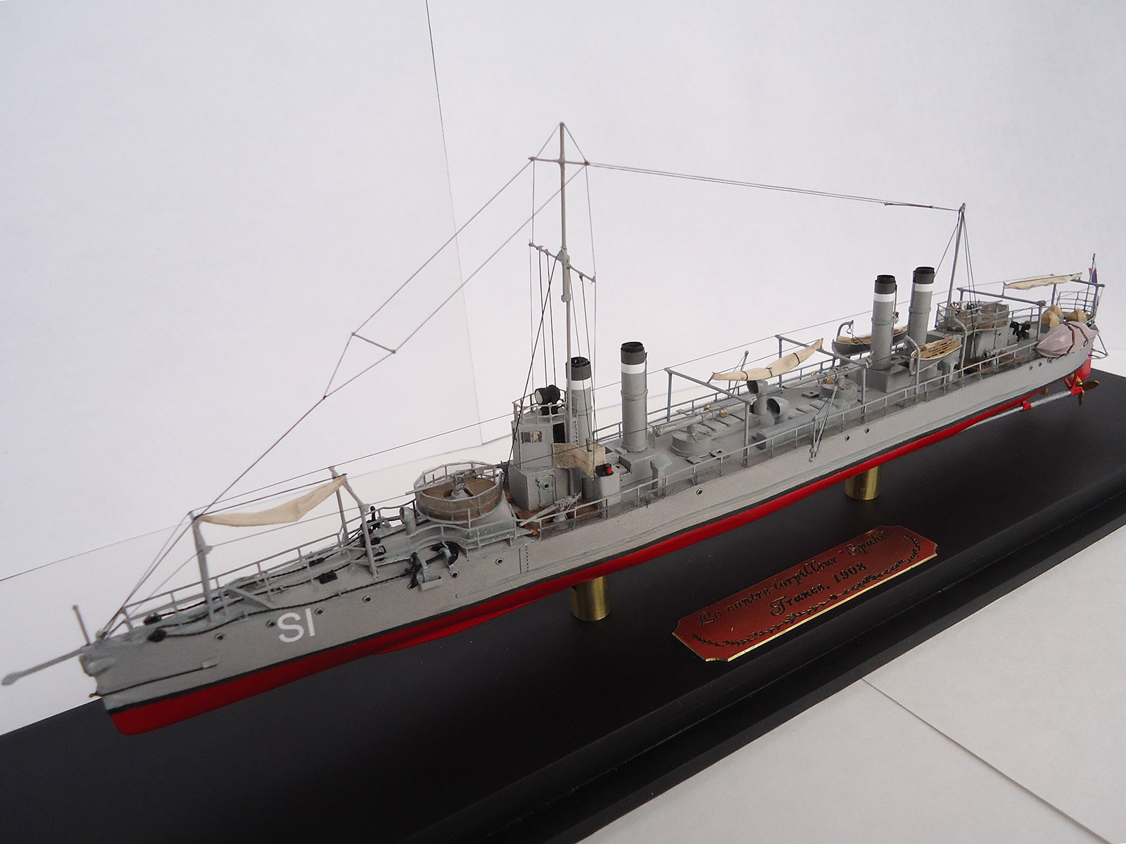 Из того, что бросилось в глаза: неровно приклеенная и отклеившаяся сетка на ограждении орудия и неаккуратно окрашенные леера на рубке и торпедный аппарат.