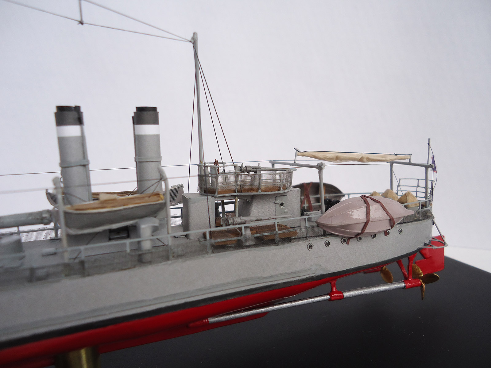 - винт исправить не смог без сдирания чистовой обшивки борта и полной покраски. Вероятно он появился, когда я перекрутил палубу для придания ей карапасности. В итоге я его просто замаскировал расположением таблички, мелкими деталями на корме, леерами с сеткой. Хотел еще сделать развернутые тенты, но не понял точно, как они крепились к тросам.