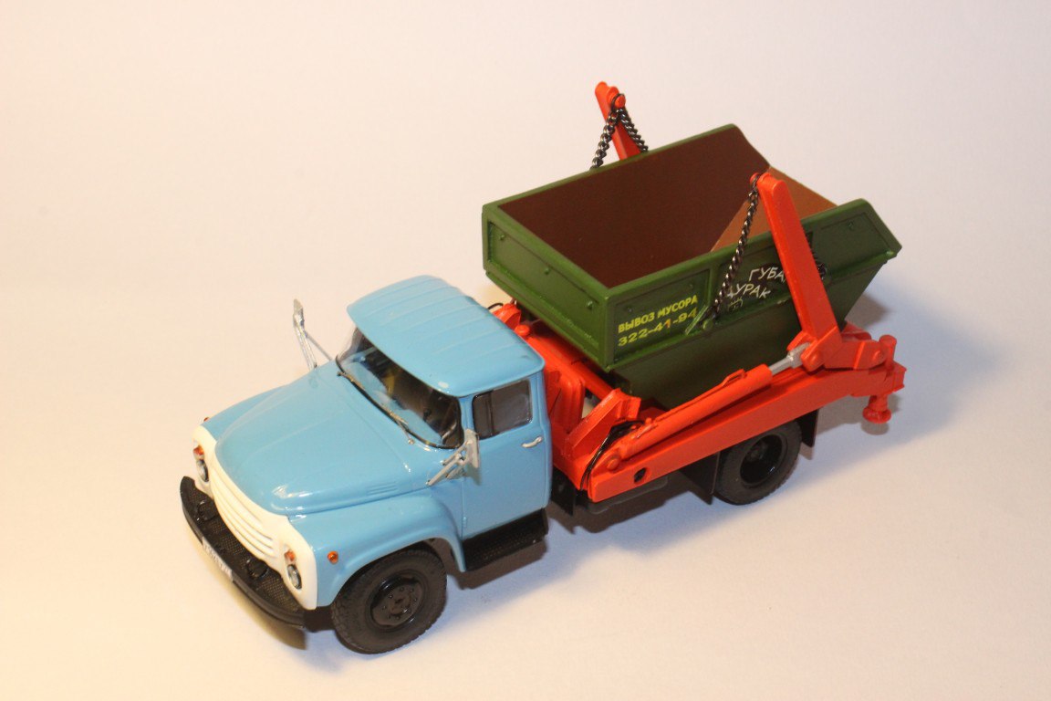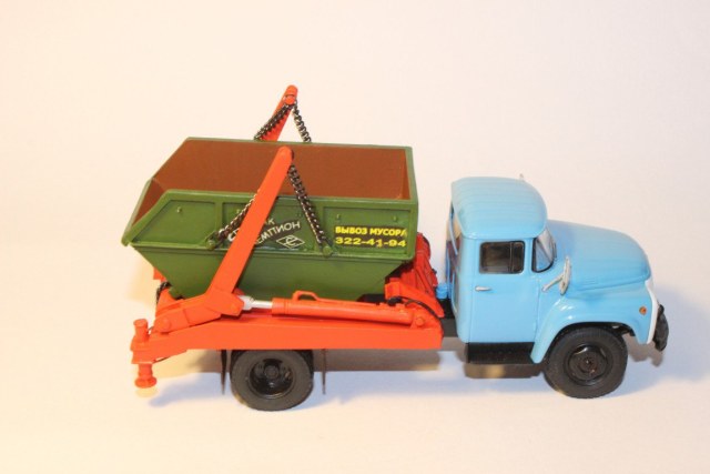 По установке: сама платформа и кран - собраны и покрашены в ярко-оранжевый цвет; шланги для цилиндров крана и стационарных лап, рычаги, брызговики - черные; бак срезан и немного поднят, чтобы горловина вошла в отверстие платформы; сзади срезан фаркоп; установлена фара для подсветки ночью; запасное колесо и его кронштейн ставить не стал - при осмотре реальных автомобилей, его в монтаже не увидел; навешаны цепи сверху и сзади; установлены реальные номера московского региона; сам бункер окрашен в распространенный цвет снаружи и коричневую антикорозийку внутри; ну и для его оживления интересные декальки в виде рекламки для подачи автомобиля для вывоза мусора, детская обзываловка и определение приверженцев футбольной команды в данном районе.