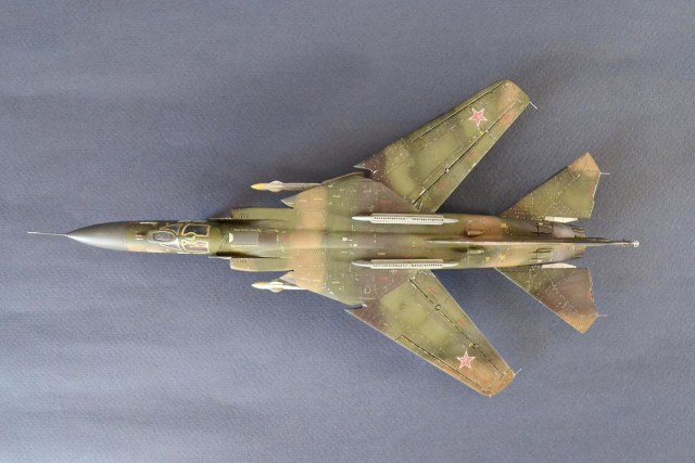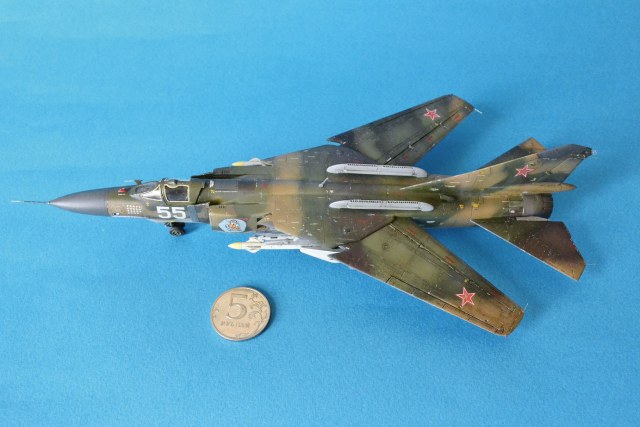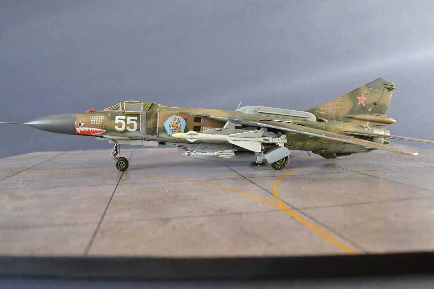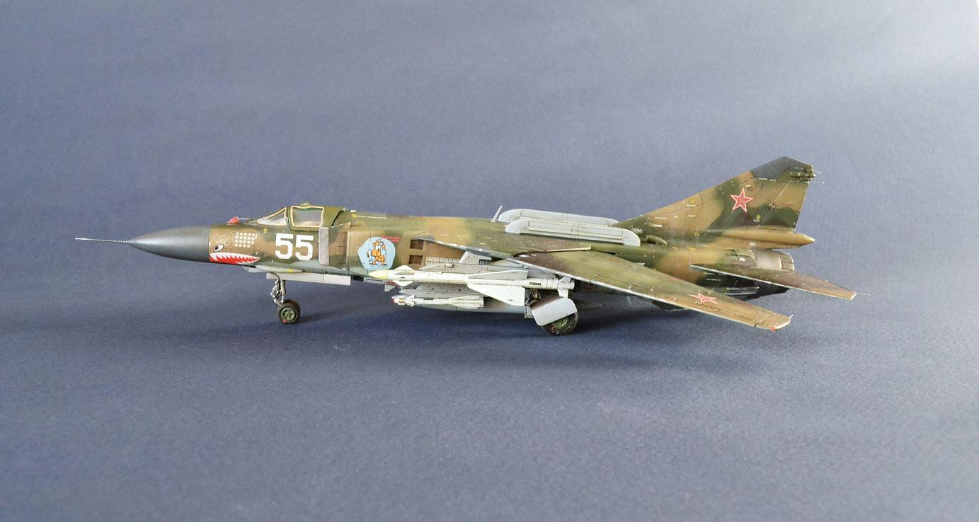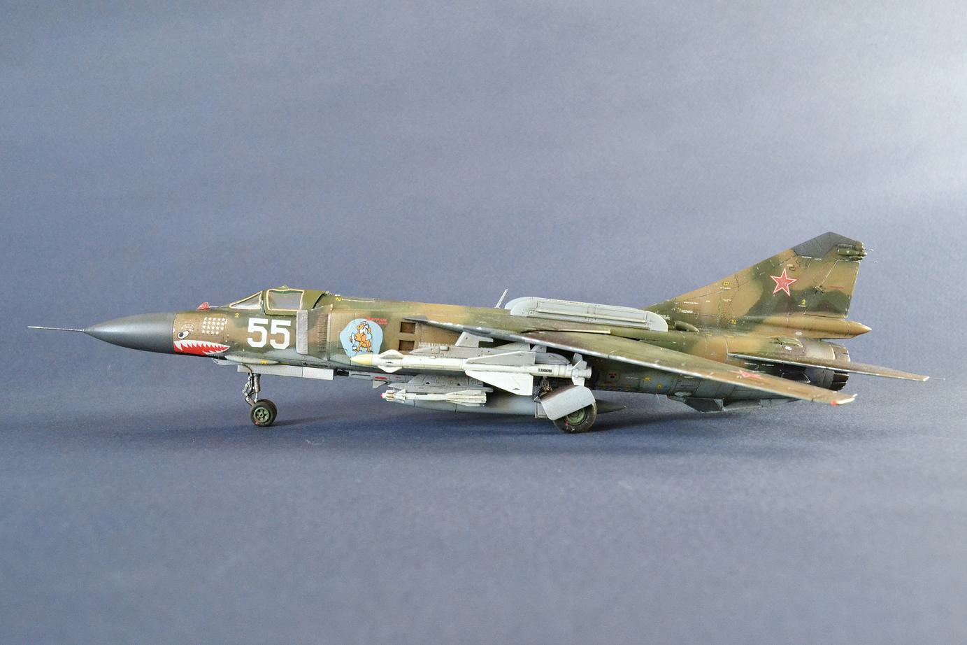Рассказывать о самой машине нет смысла - всем она известна и написано о ней тоже немало. Скажу только одно, что МИГ-23МЛД широко применялся в войне в Афганистане. И характерно отличался от других модификаций более высоким внешним видом (почти горизонтальный). За счет установки других передней и основных стоек шасси. И наличием 2-х надфюзеляжных блоков отстрела тепловых ракет - БВП 50-60.