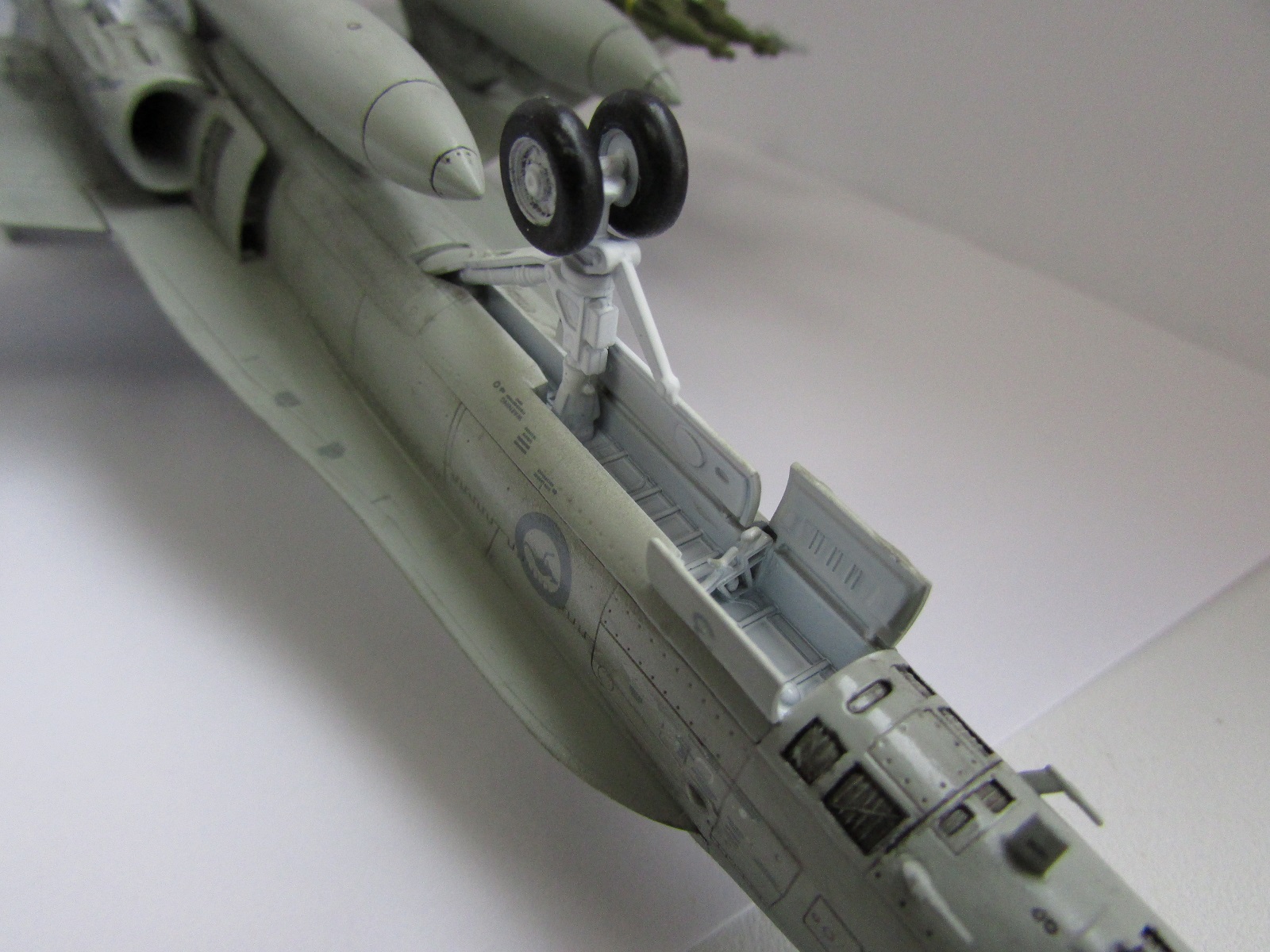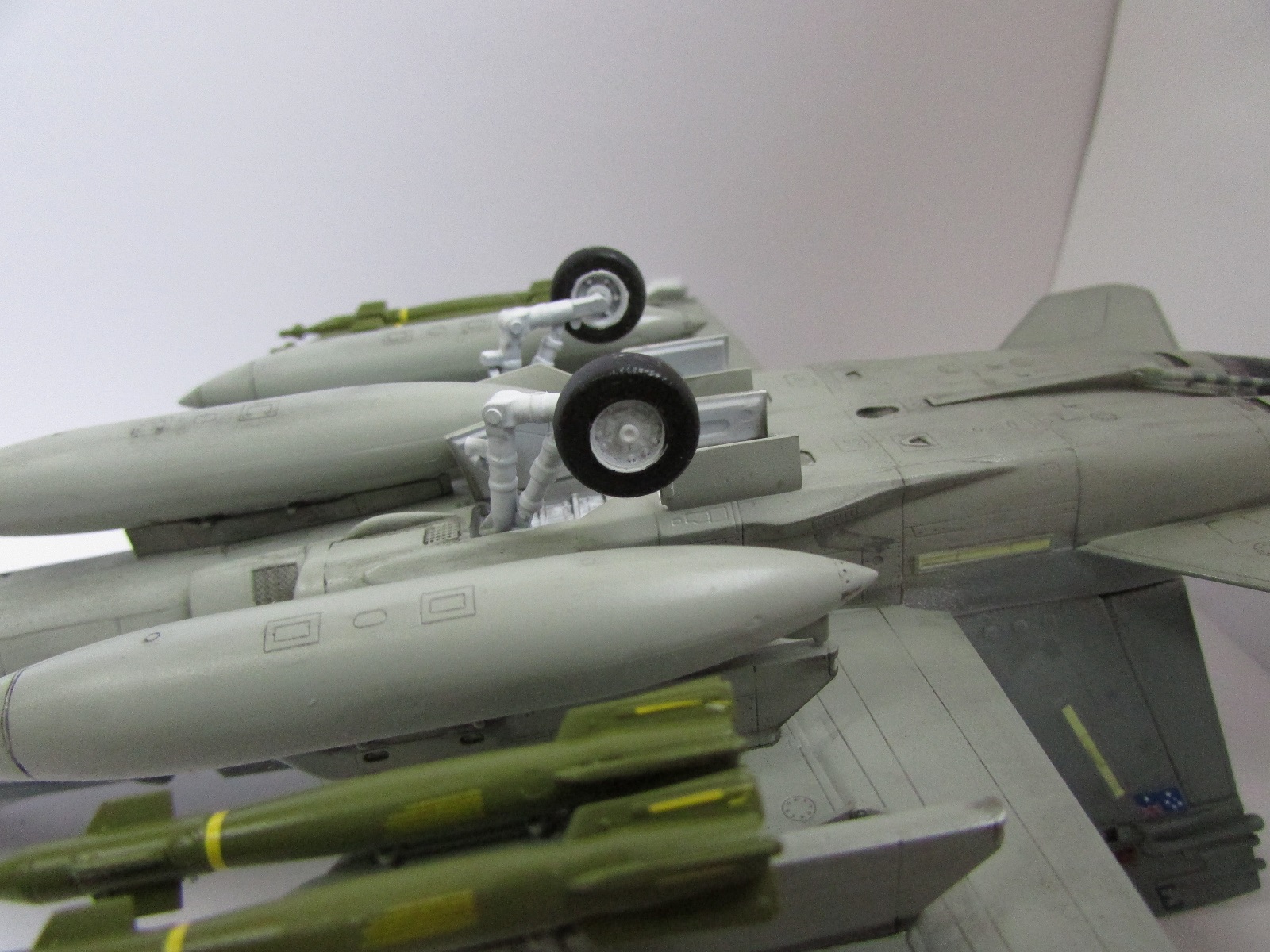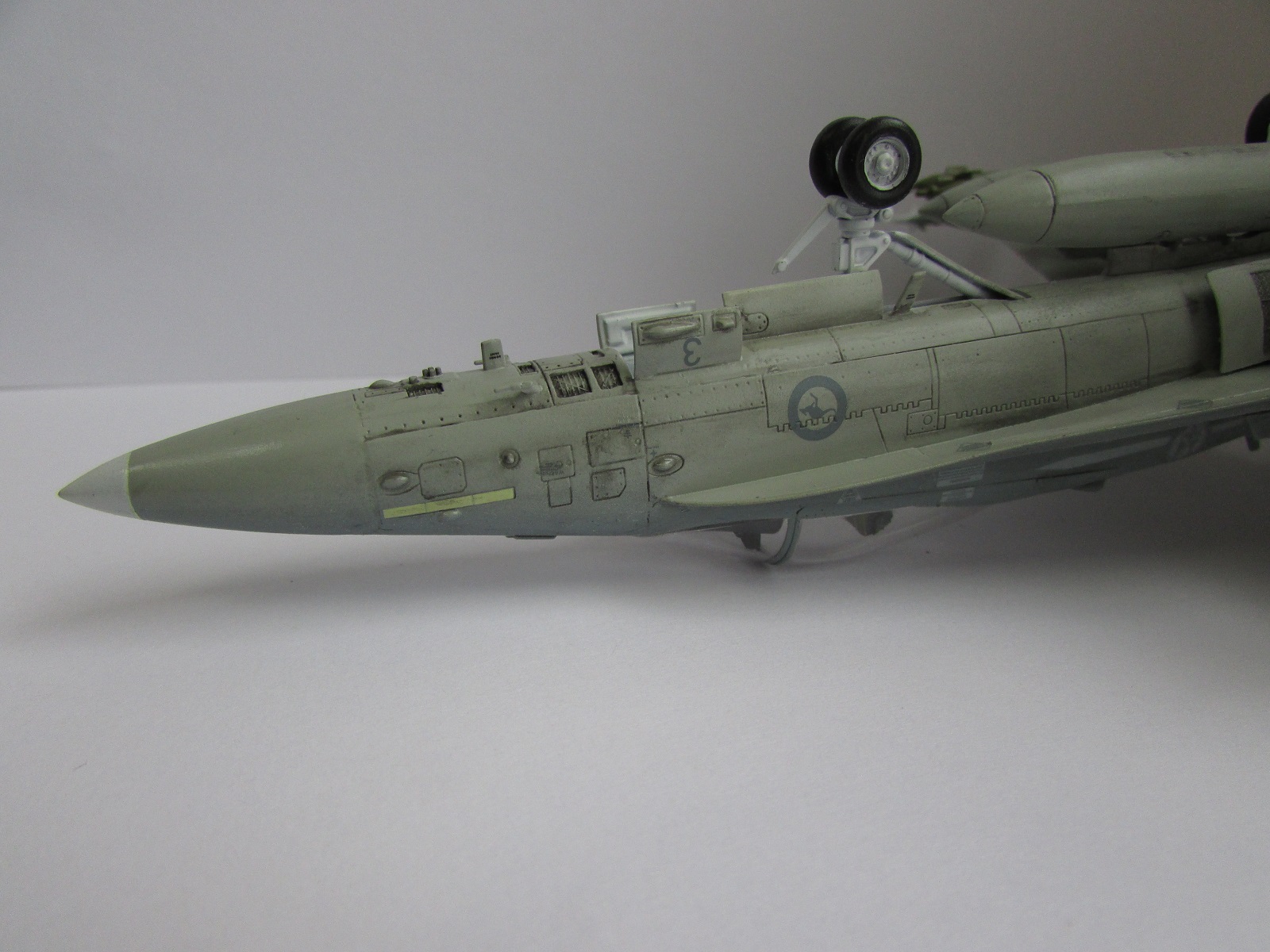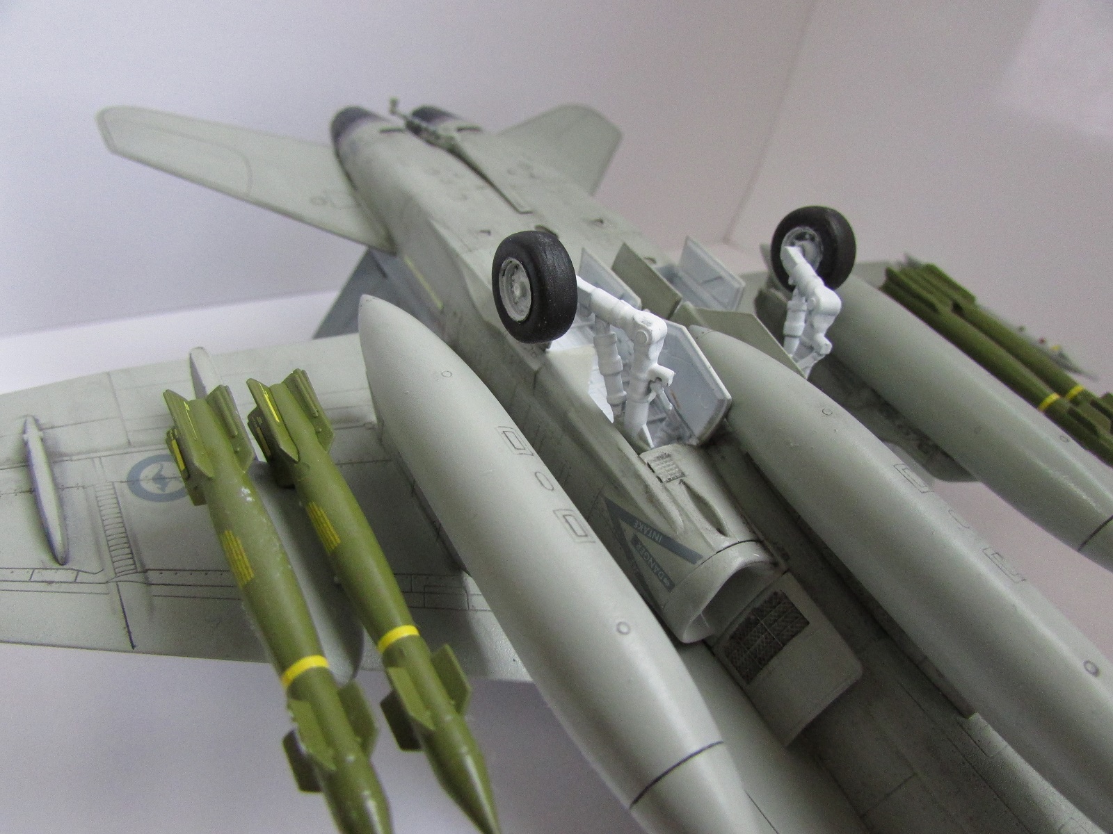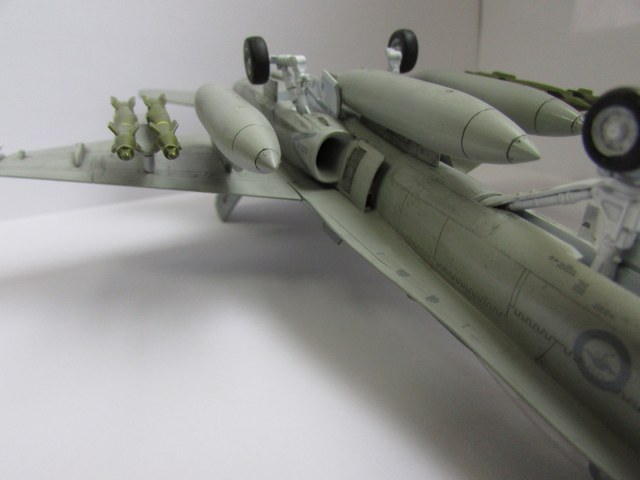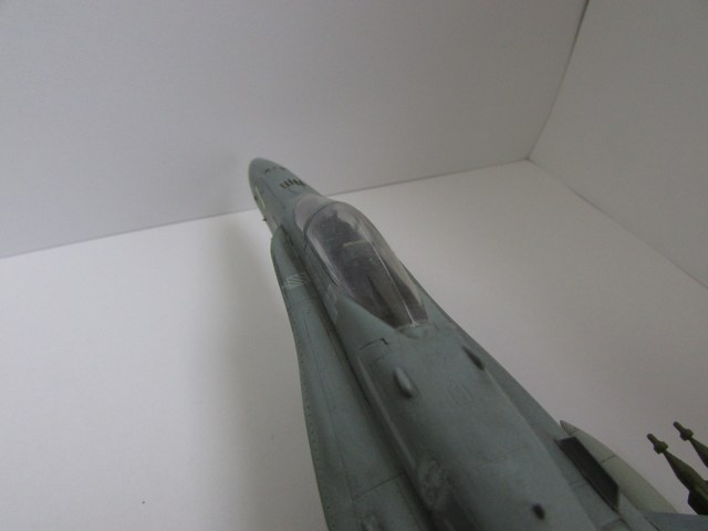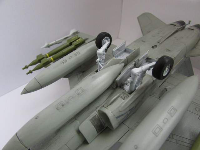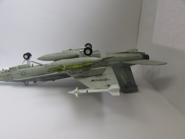 Хорошая модель. Из недочетов это необходимлсть добавить смывки в ниши шасси и сами шасси. Самолет бывалый, а вот ниши и шасси девственно чистые. То же касается и вооружения. Не хватает объема. Ракеты на законцовках как-то вниз смотрят. Не знаю, должно ли быть так? И на колесе одной из основных стоек просматривается отпечаток пальца. Но в целом красивая модель красивого самолета.