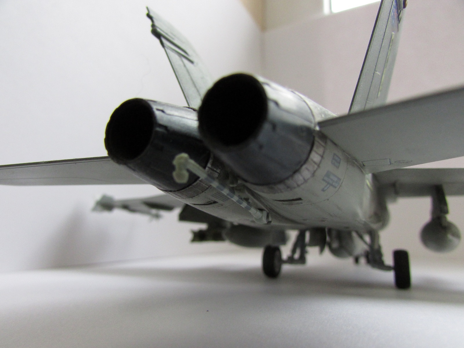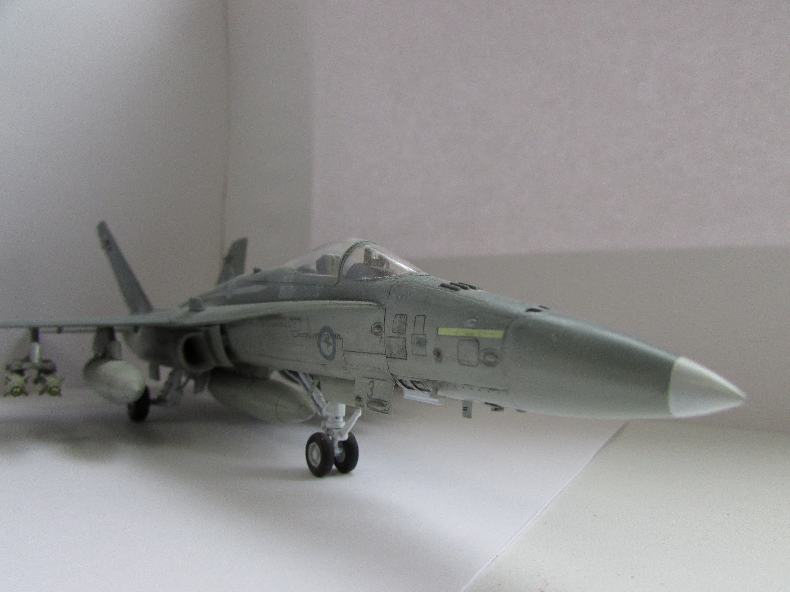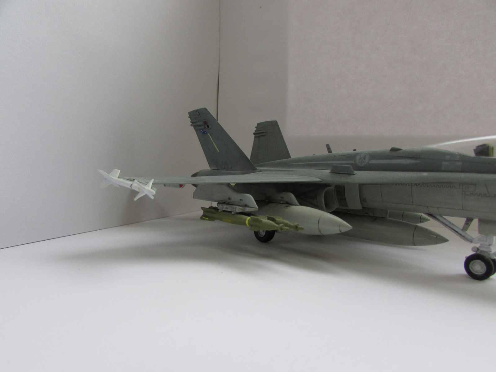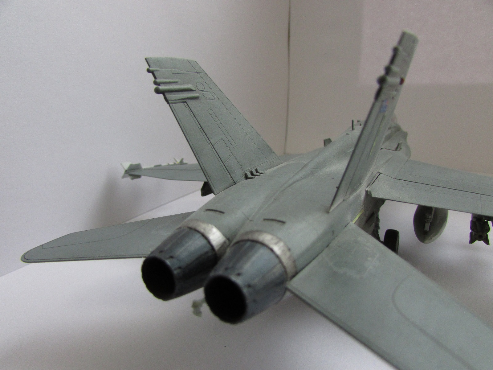 Модель сфотографирована со всех ракурсов это плюс. Хорнет мне очень нравится, и я сам мечтаю собрать такую машину. Тепеь про недочететы: нехватает смывки низ шасси и самих шасси. Фото мне показались темноваты. А в целом самтлет понравился. Успехов!