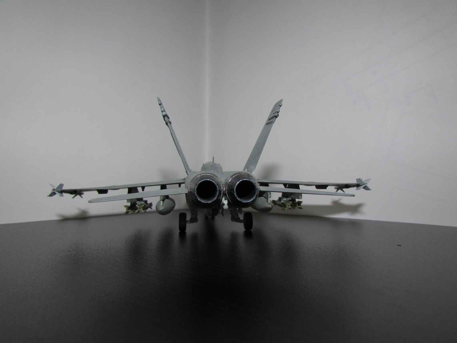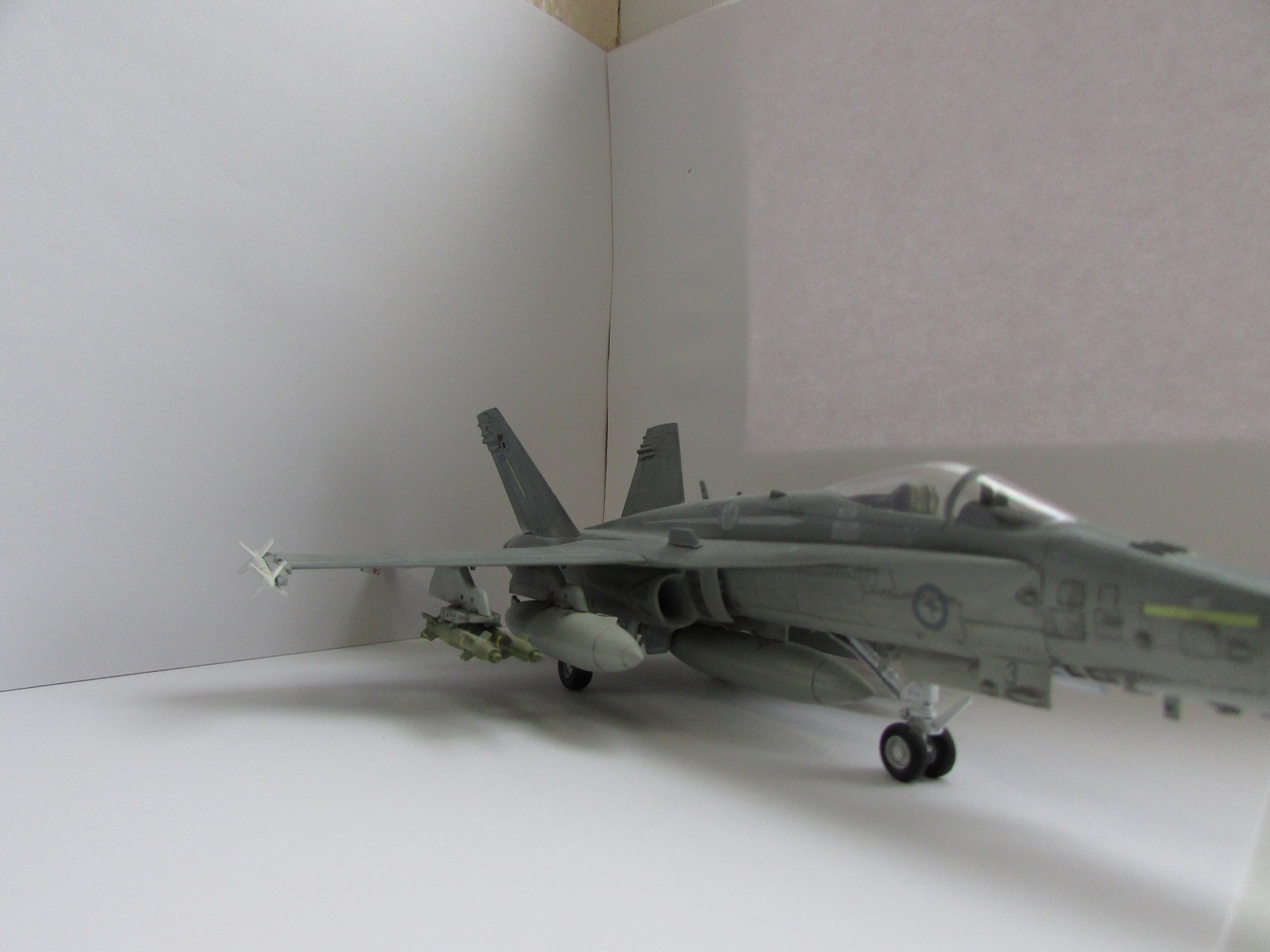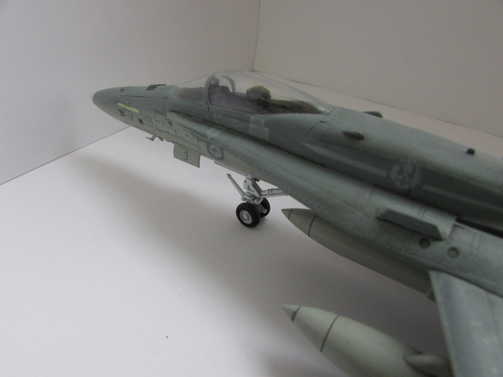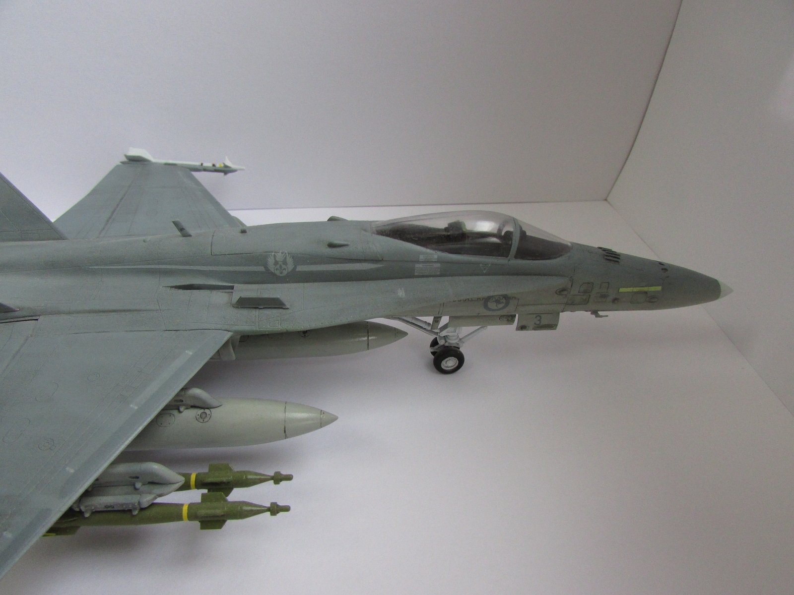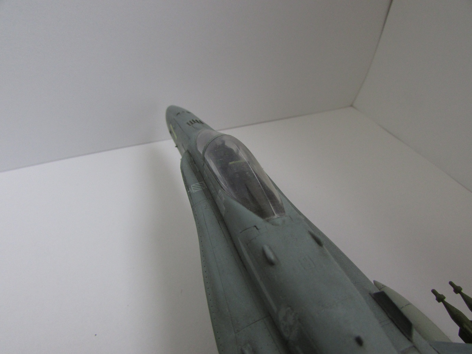 Модель сфотографирована со всех ракурсов это плюс. Хорнет мне очень нравится, и я сам мечтаю собрать такую машину. Тепеь про недочететы: нехватает смывки низ шасси и самих шасси. Фото мне показались темноваты. А в целом самтлет понравился. Успехов!