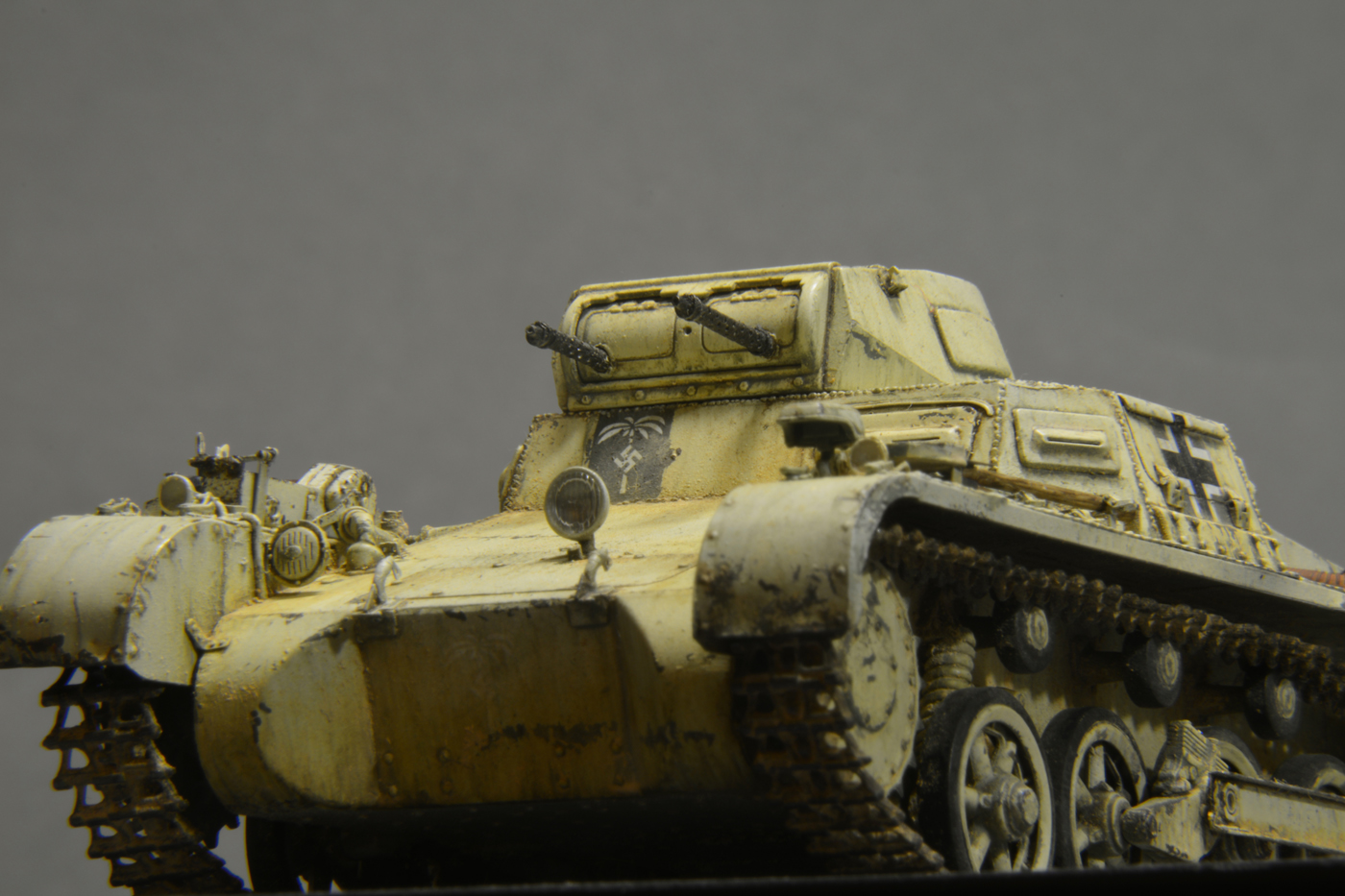 По покраске: нанес серую базу от тамии, сверху чипинг и уже африканский желтый, сделал сколы до базового серого и местами полноценные до метала.