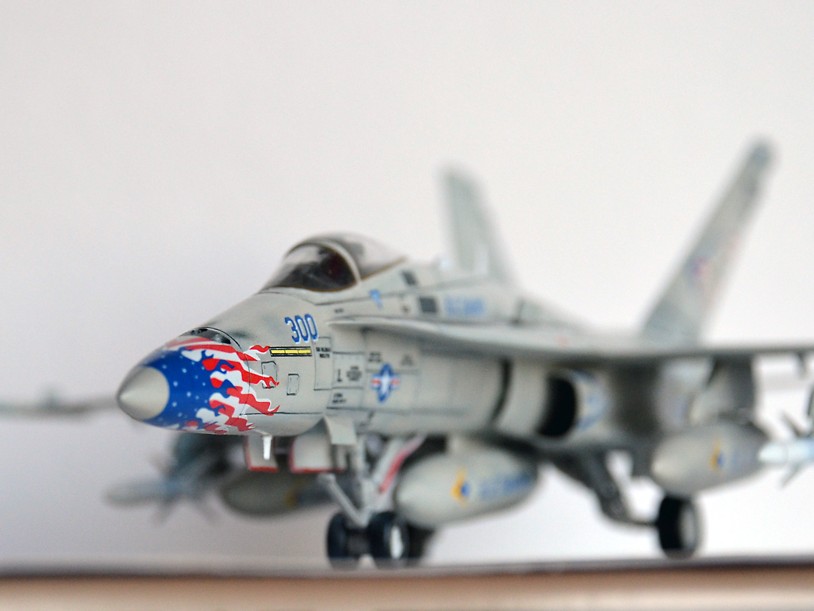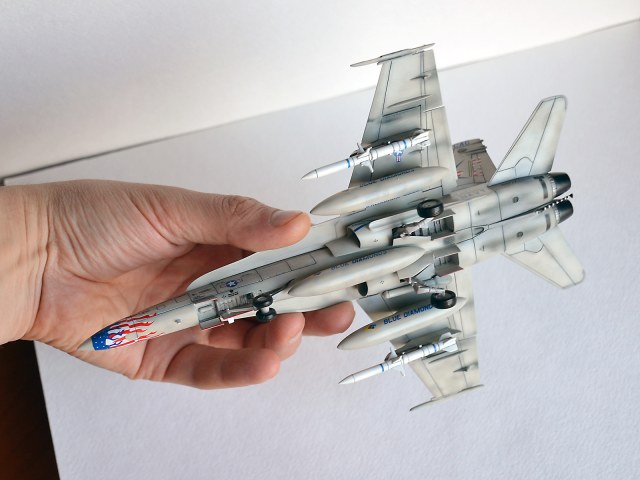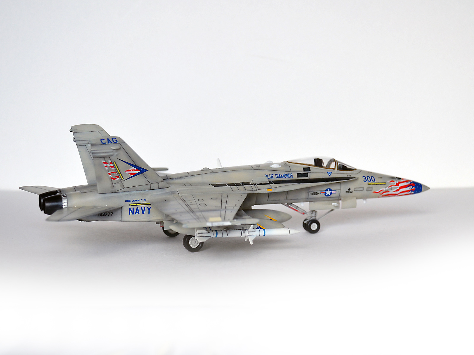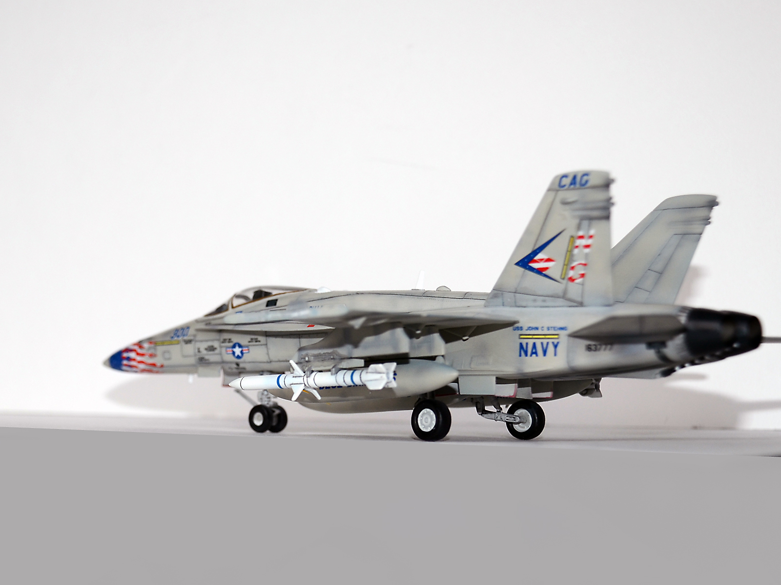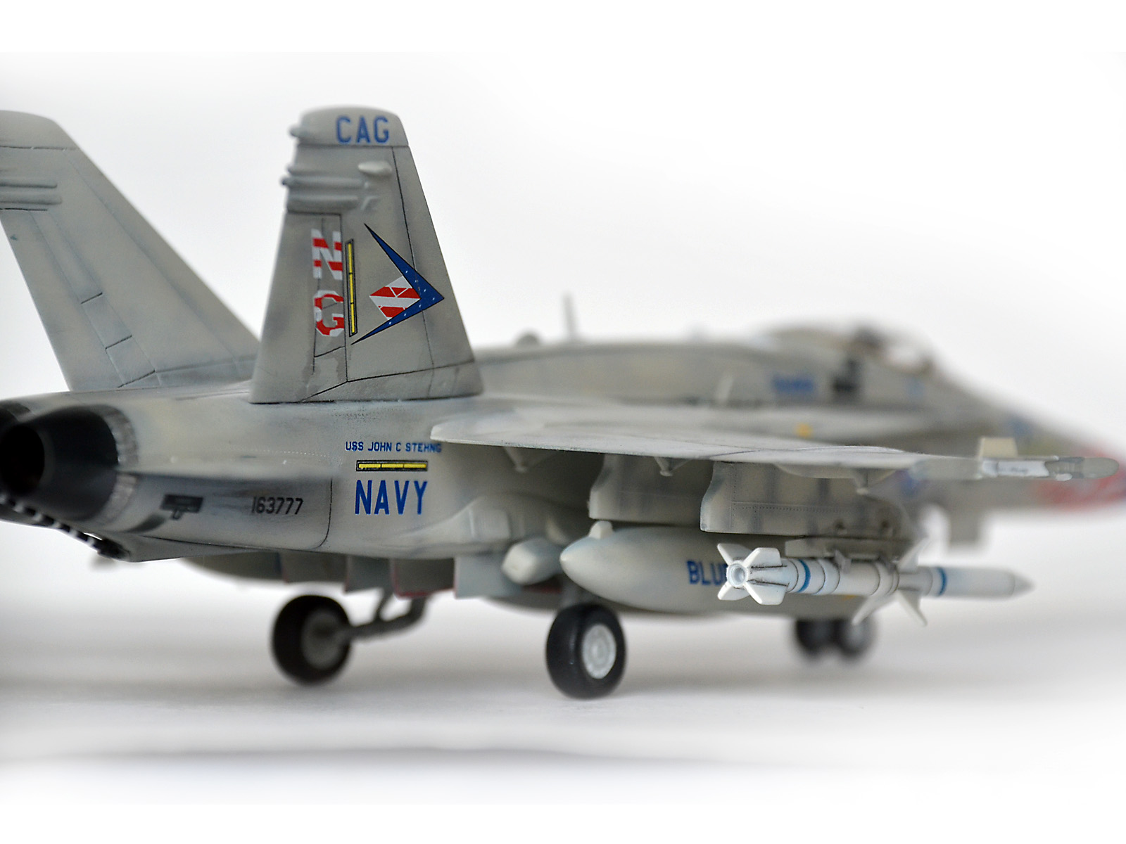 К чему это всё? Оригинал в стандартном, двухцветном камуфляже и это видно даже на фотографии, особенно если знать где проходит граница цветов. Есть стандартная схема камуфляжа для F/A-18, не считая всяких агрессоров и топ ганов, а так-же "экспериментальных" камуфляжей. Нет у американцев никакой темно-серой и просто серой схемы. Есть выгоревшие машины, машины которые подкрашиваются во время похода и так далее, но в целом схема стандартная.