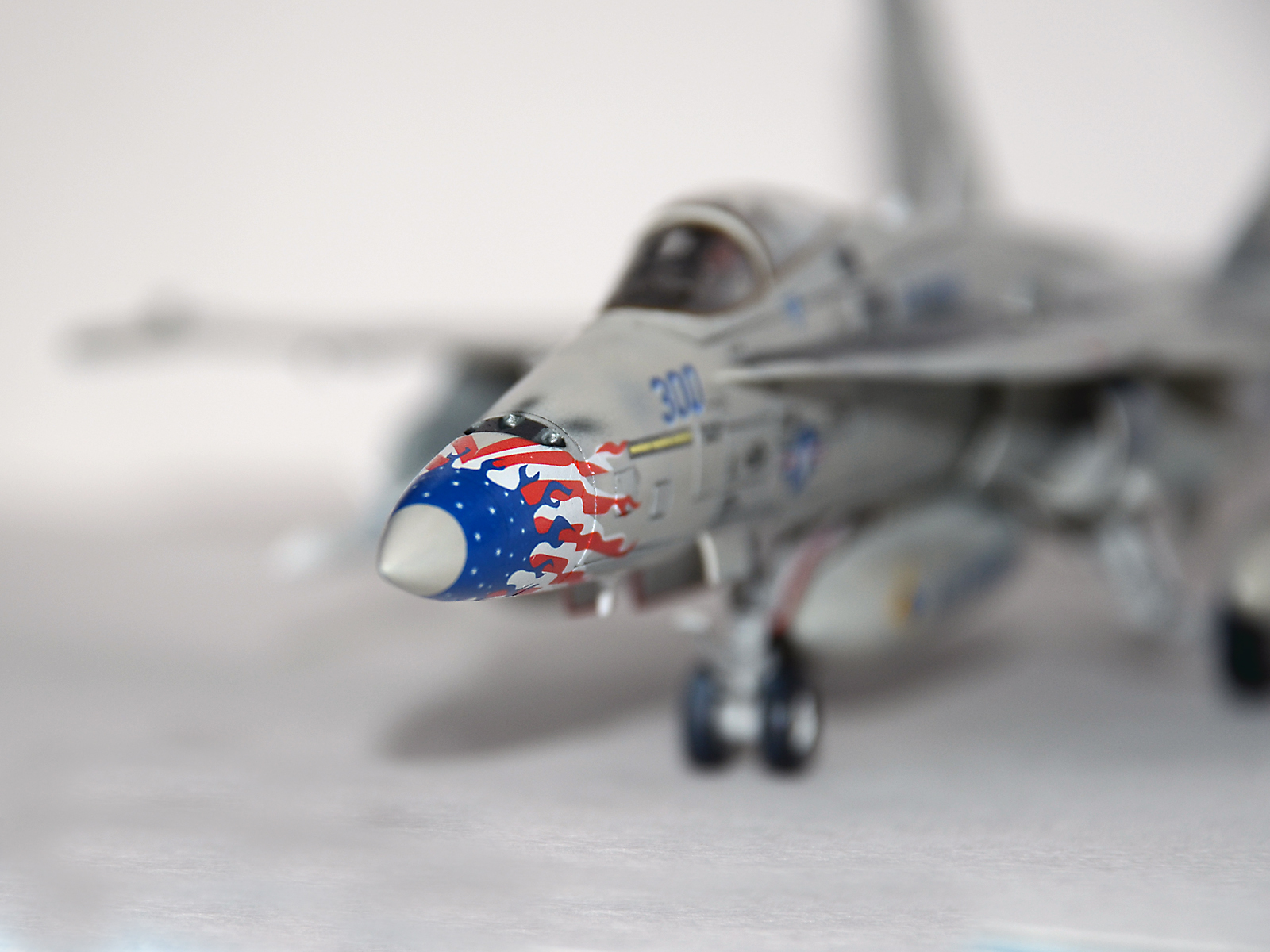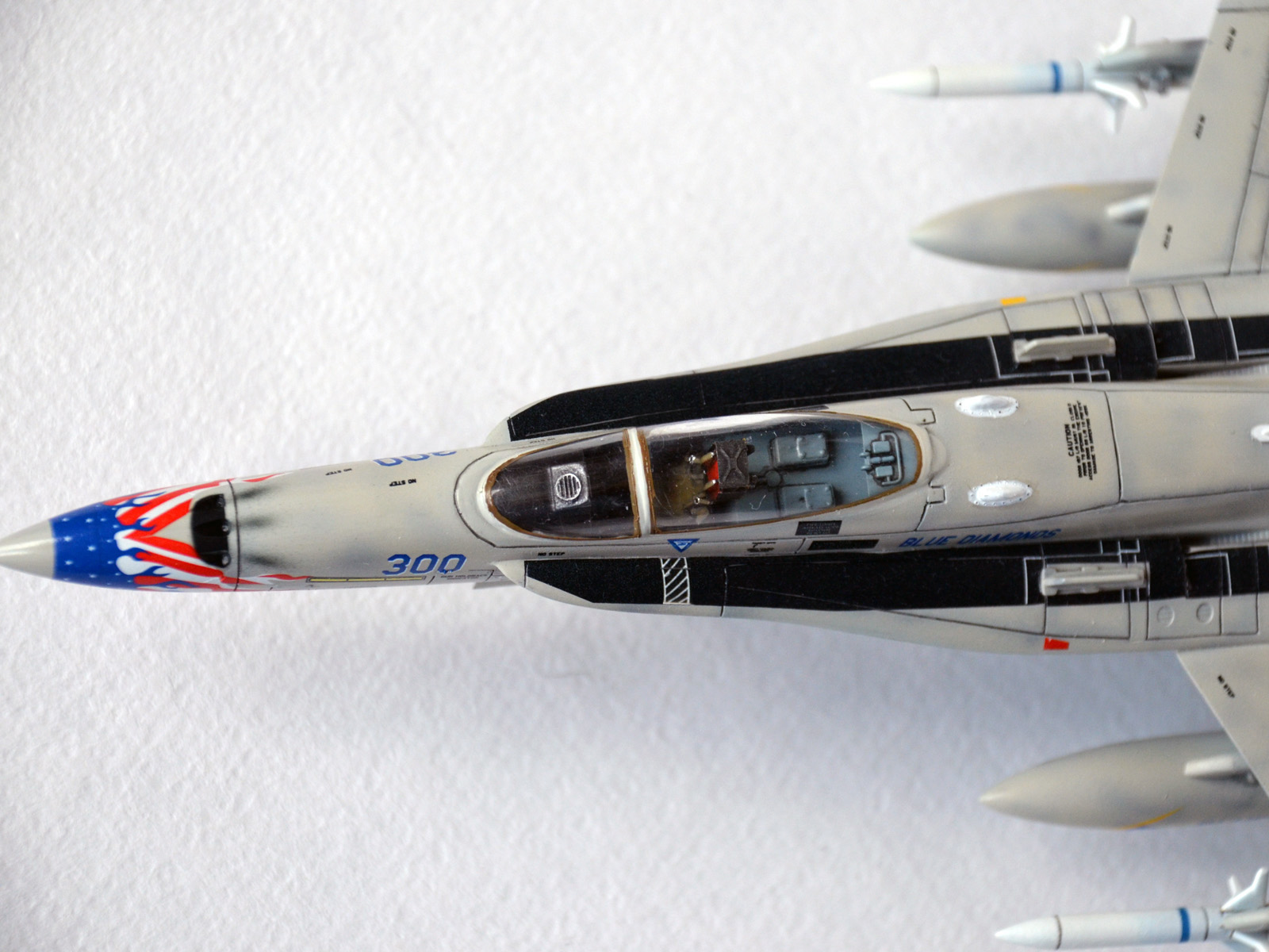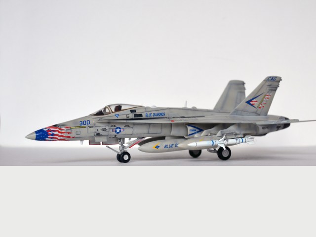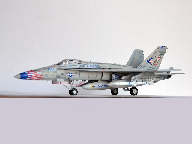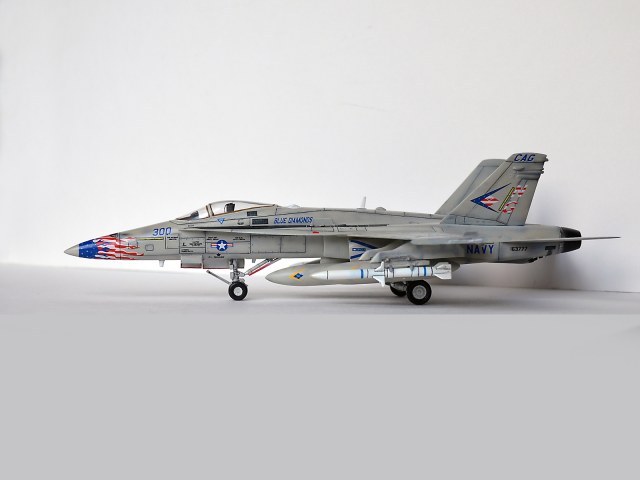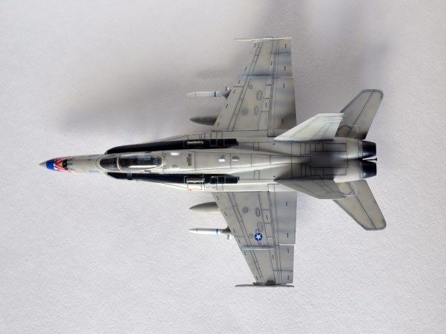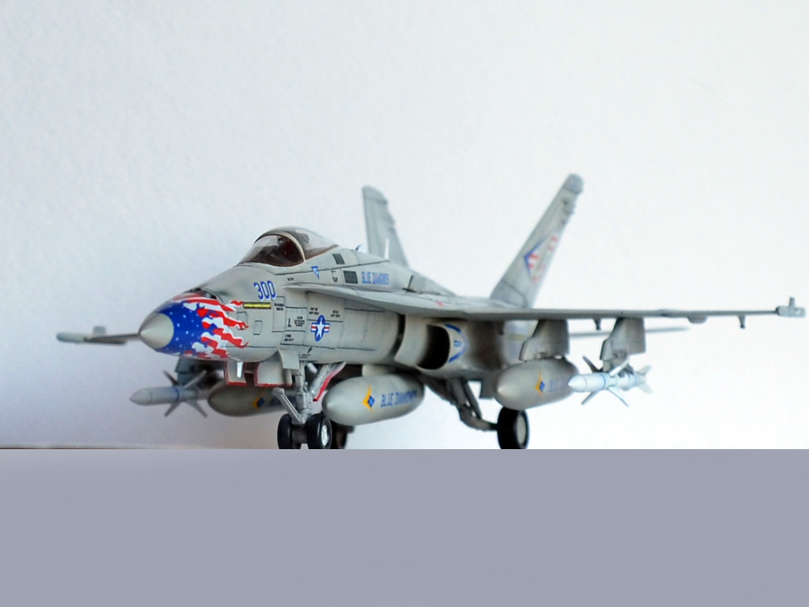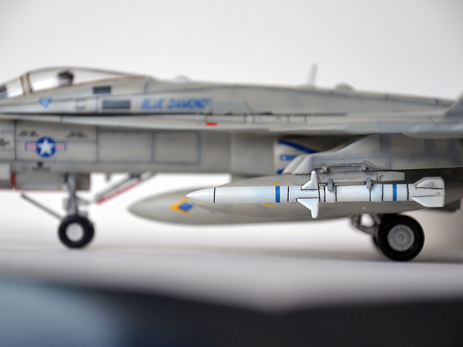 К чему это всё? Оригинал в стандартном, двухцветном камуфляже и это видно даже на фотографии, особенно если знать где проходит граница цветов. Есть стандартная схема камуфляжа для F/A-18, не считая всяких агрессоров и топ ганов, а так-же "экспериментальных" камуфляжей. Нет у американцев никакой темно-серой и просто серой схемы. Есть выгоревшие машины, машины которые подкрашиваются во время похода и так далее, но в целом схема стандартная.