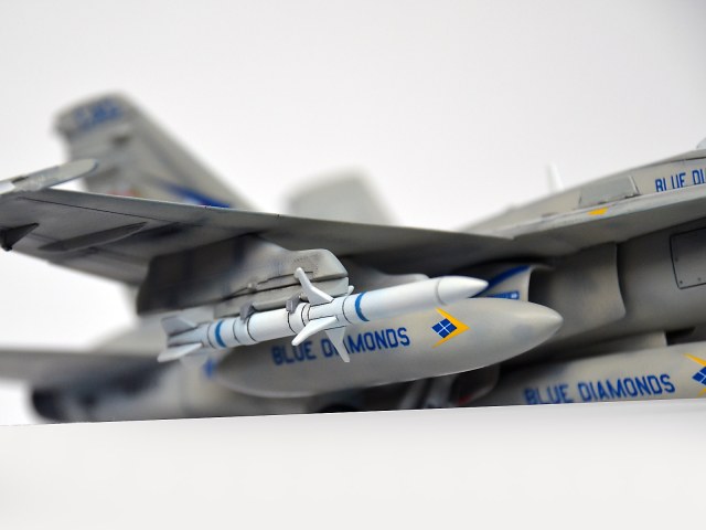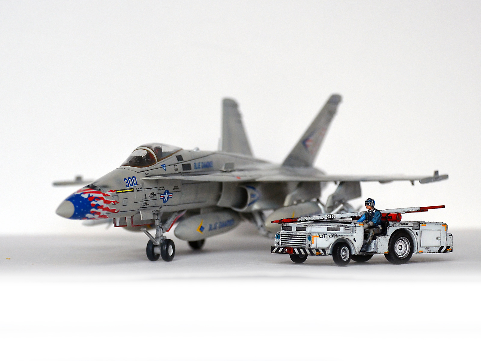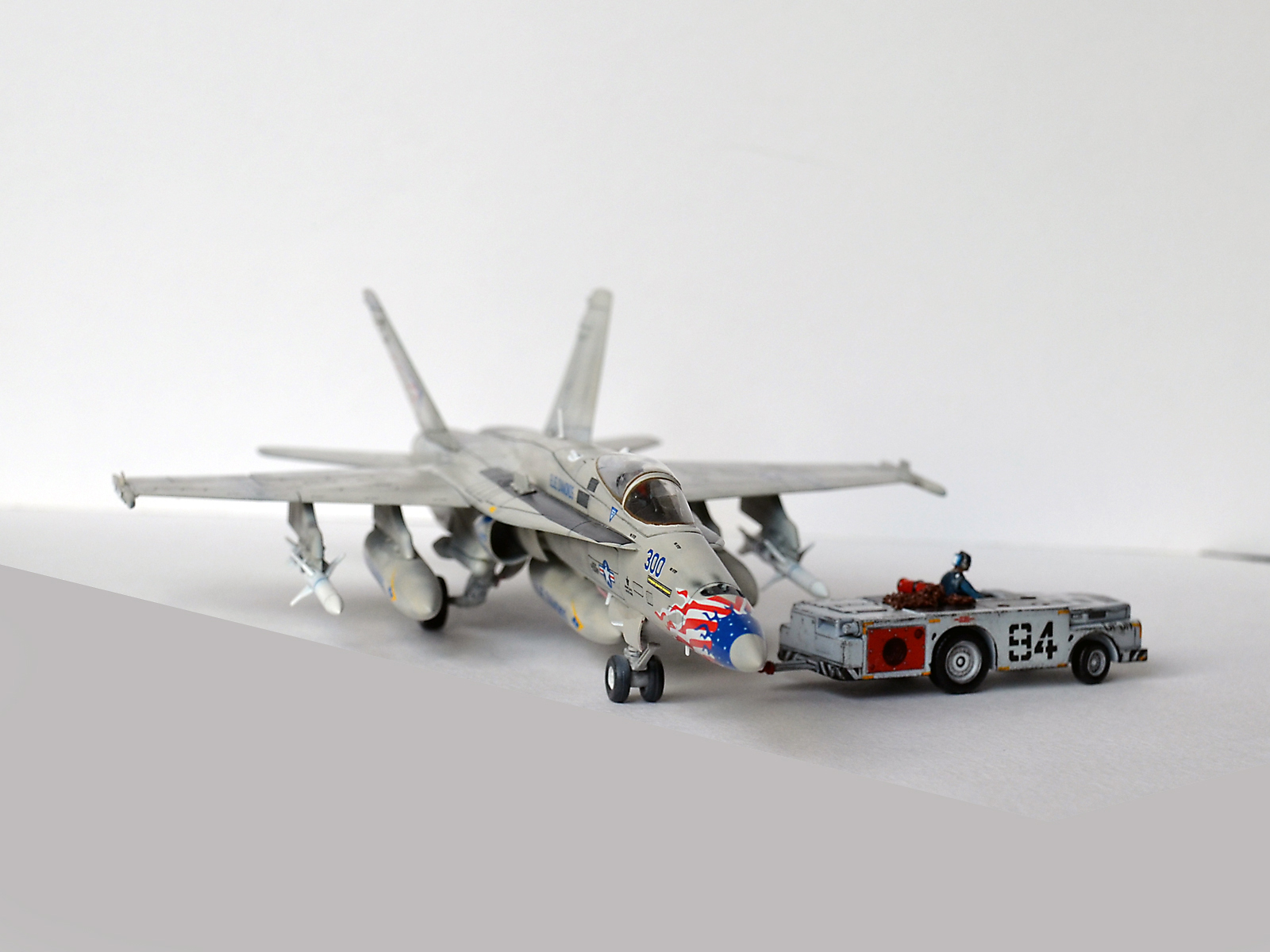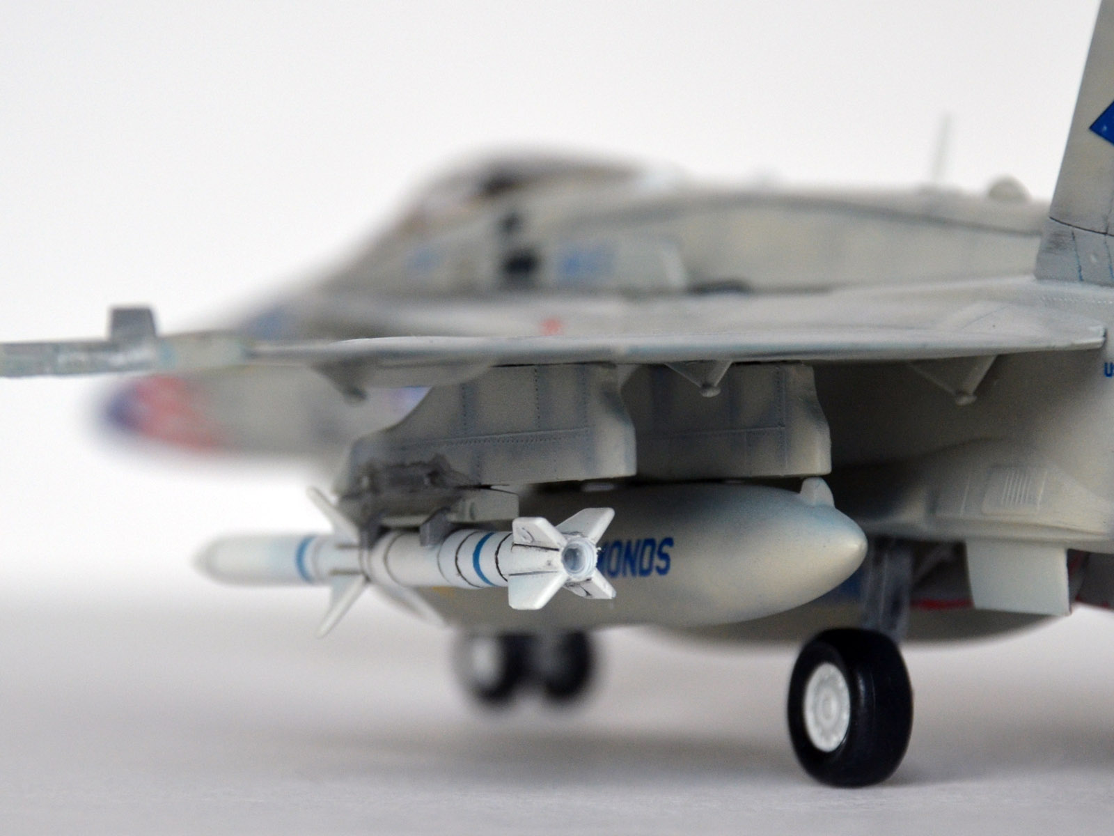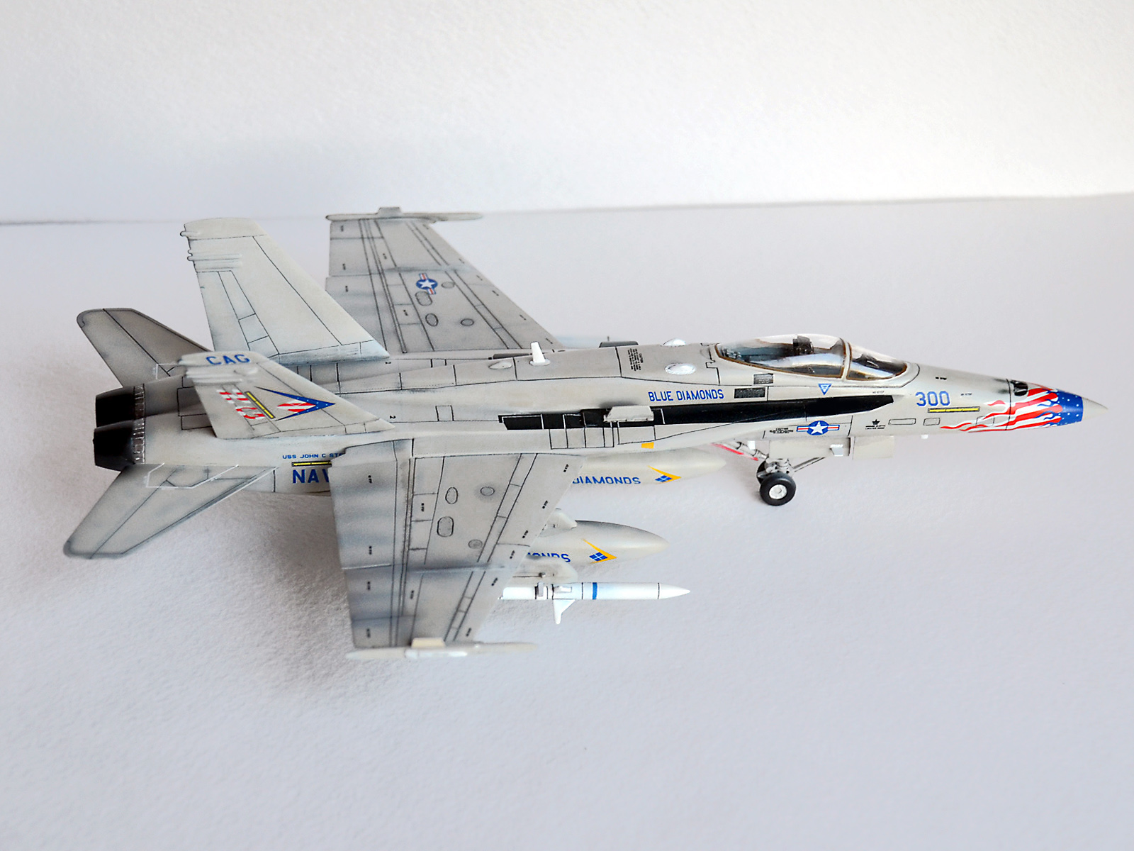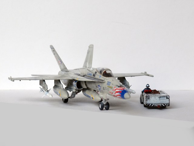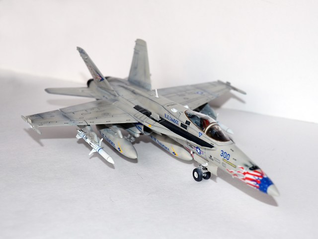 К чему это всё? Оригинал в стандартном, двухцветном камуфляже и это видно даже на фотографии, особенно если знать где проходит граница цветов. Есть стандартная схема камуфляжа для F/A-18, не считая всяких агрессоров и топ ганов, а так-же "экспериментальных" камуфляжей. Нет у американцев никакой темно-серой и просто серой схемы. Есть выгоревшие машины, машины которые подкрашиваются во время похода и так далее, но в целом схема стандартная.