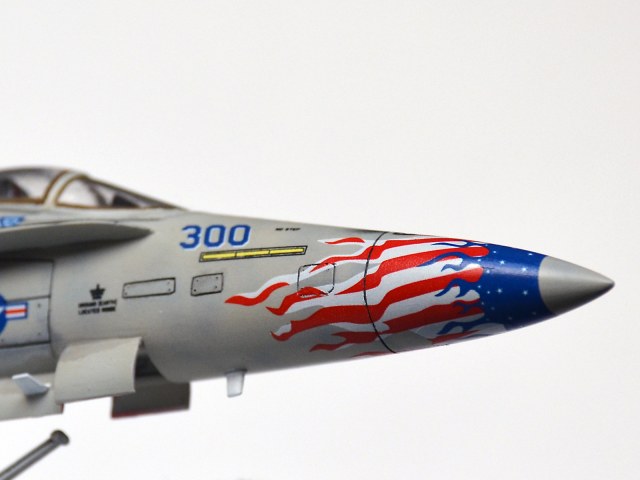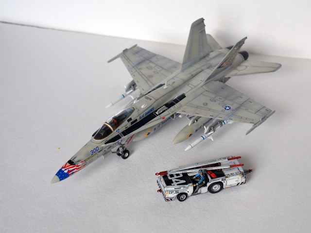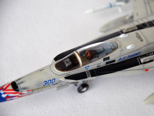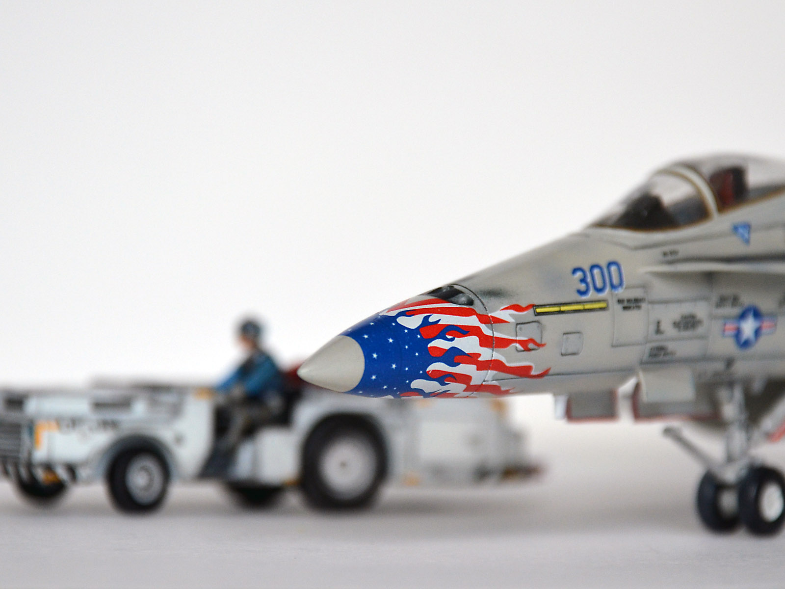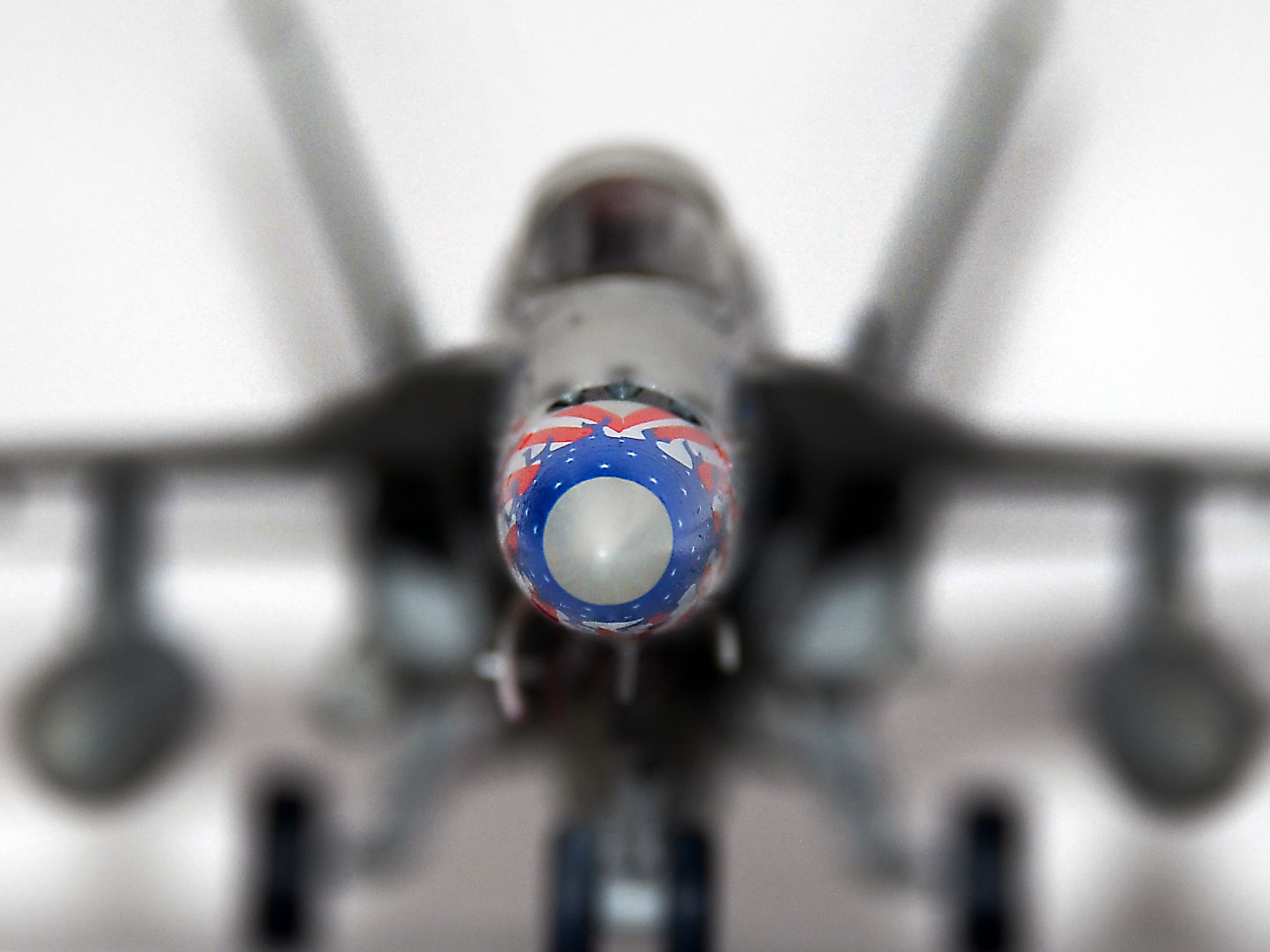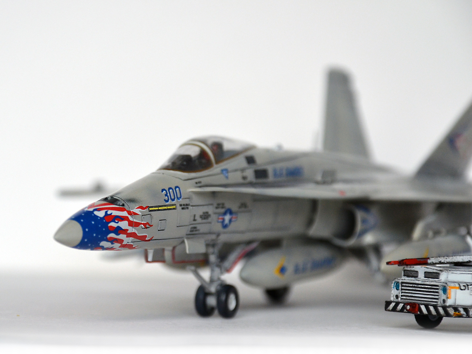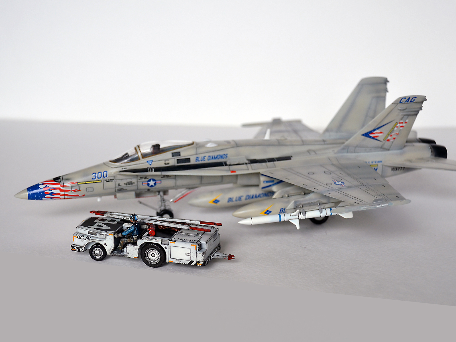 К чему это всё? Оригинал в стандартном, двухцветном камуфляже и это видно даже на фотографии, особенно если знать где проходит граница цветов. Есть стандартная схема камуфляжа для F/A-18, не считая всяких агрессоров и топ ганов, а так-же "экспериментальных" камуфляжей. Нет у американцев никакой темно-серой и просто серой схемы. Есть выгоревшие машины, машины которые подкрашиваются во время похода и так далее, но в целом схема стандартная.