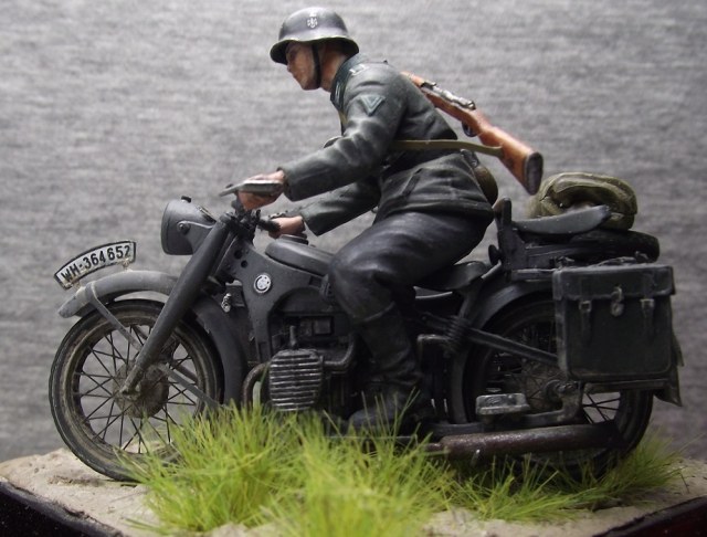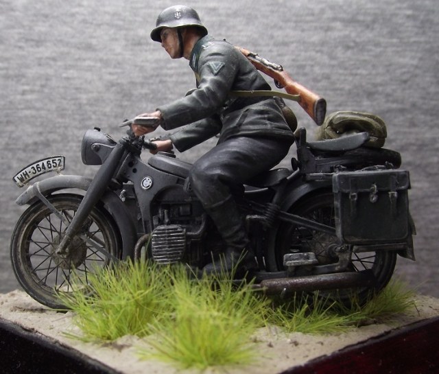 В данном случае окраска мотоцикла и немца несколько одинакова. В жизни такое вряд-ли возможно. Проблема легко решается тонировкой