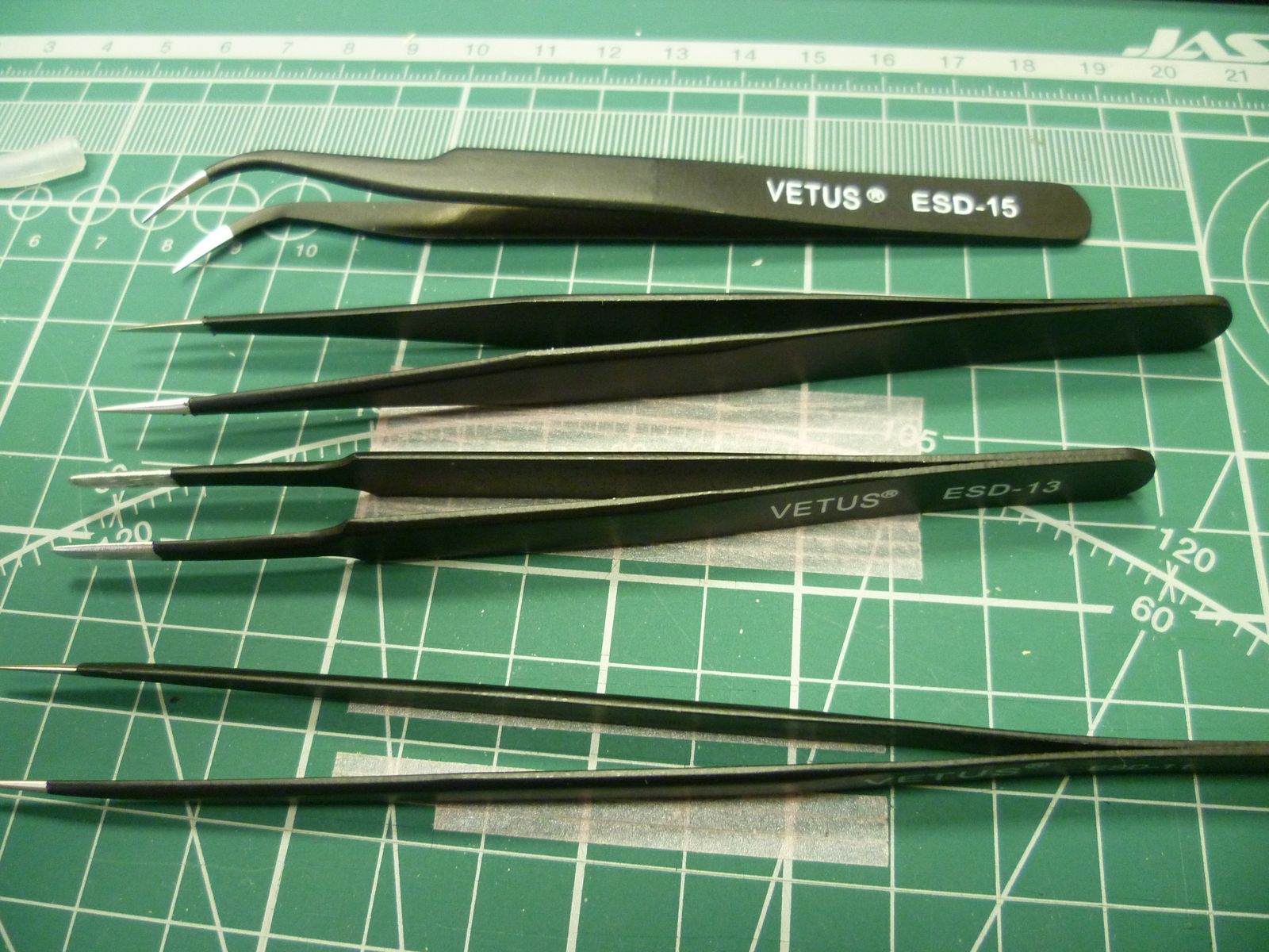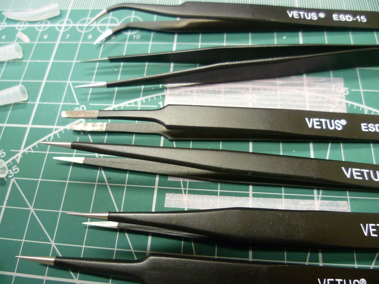 Заказал набор из 8 штук, пришли. Пинцеты хорошие, попадались такие китайцы, что как жесть просто гнулись. Но, как говорится, лучшее - враг хорошего... По сравнению со старыми (уже и затупились, и в клее, в том числе и ЦА, а отжигать - не выход) новые Ветус какие-то... толстые, что ли... И толщина и ширина губок больше, выглядят массивнее и на ощупь жёстче. А как увидел плоский пинцет - так вообще офигел. Вот для сравнения 12й и 13 номер снял (у меня разных фирм, но маркировка ST-12 и TS-13, новые Ветус - чёрные). Короче, несколько не то, что ожидал