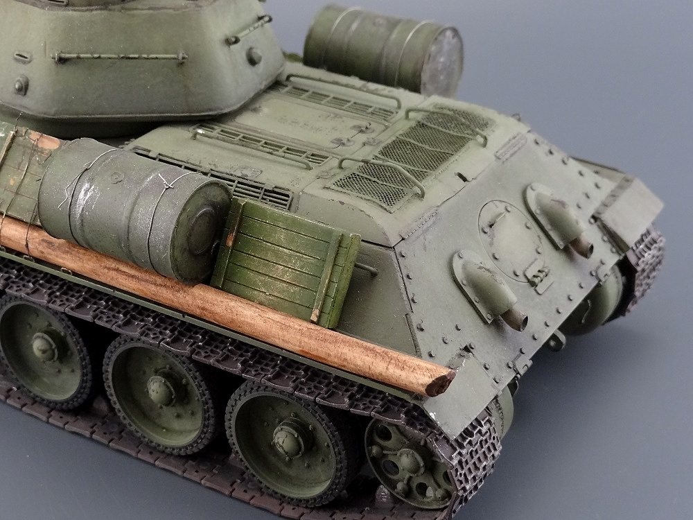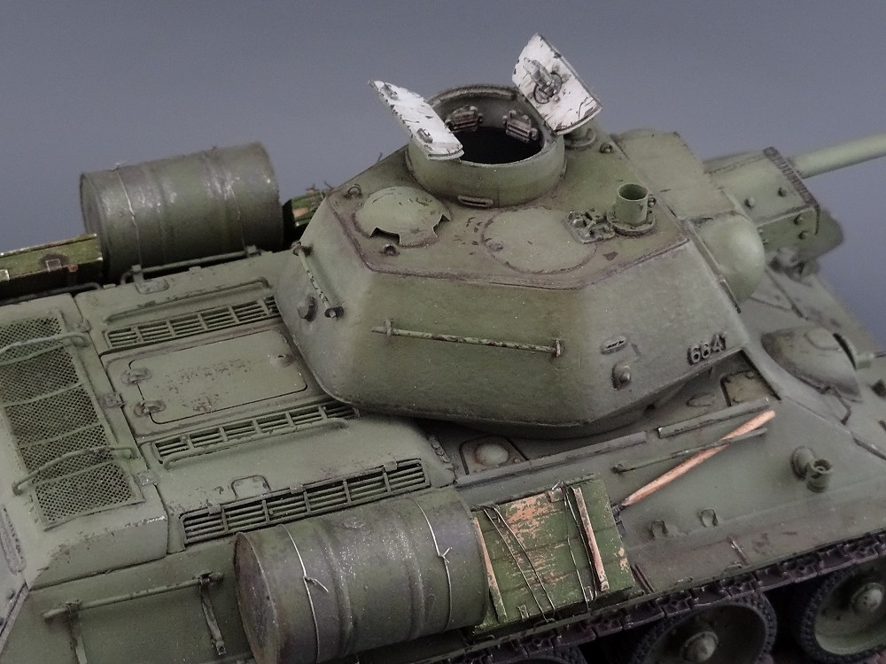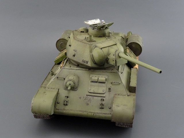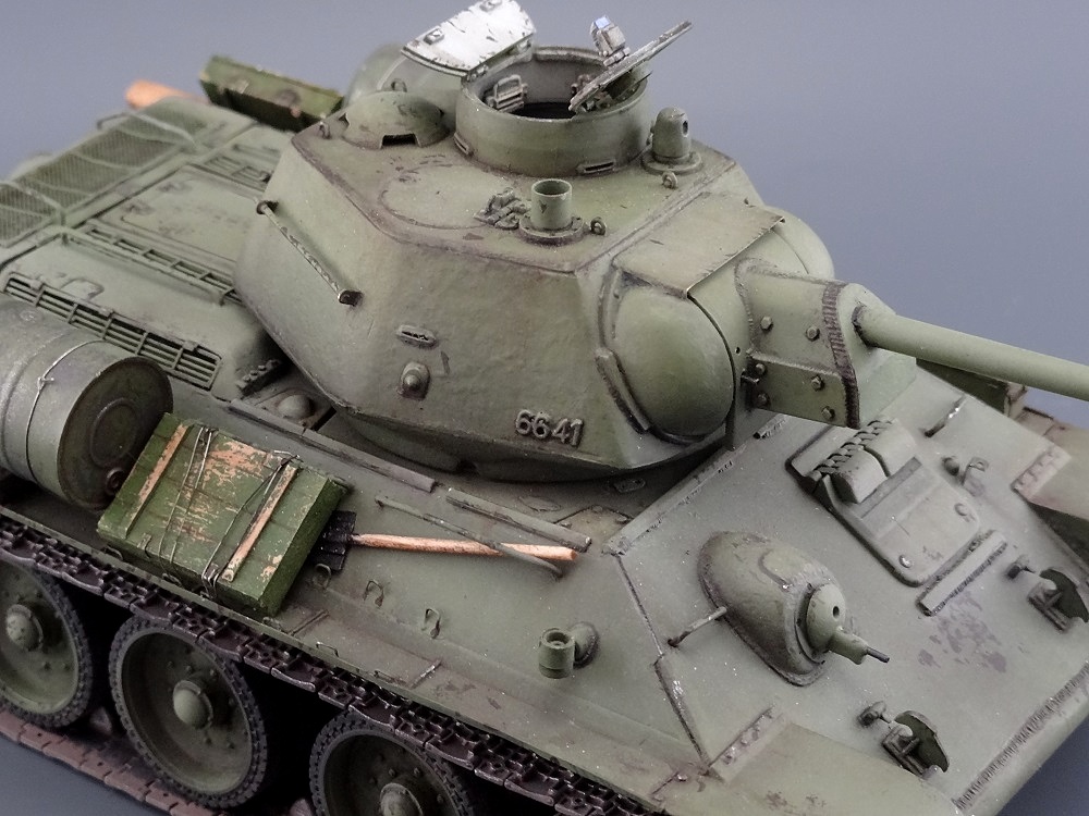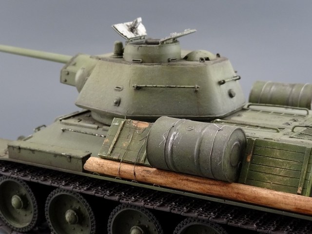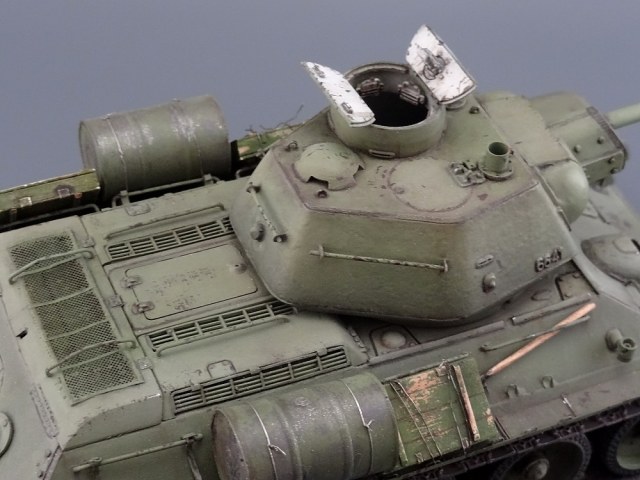 Есть, правда, пара мелочей - нескруглённые реснички мехвода, характерные для послевоенных танков, толстый стакан антенны и залитый люк заряжающего.
