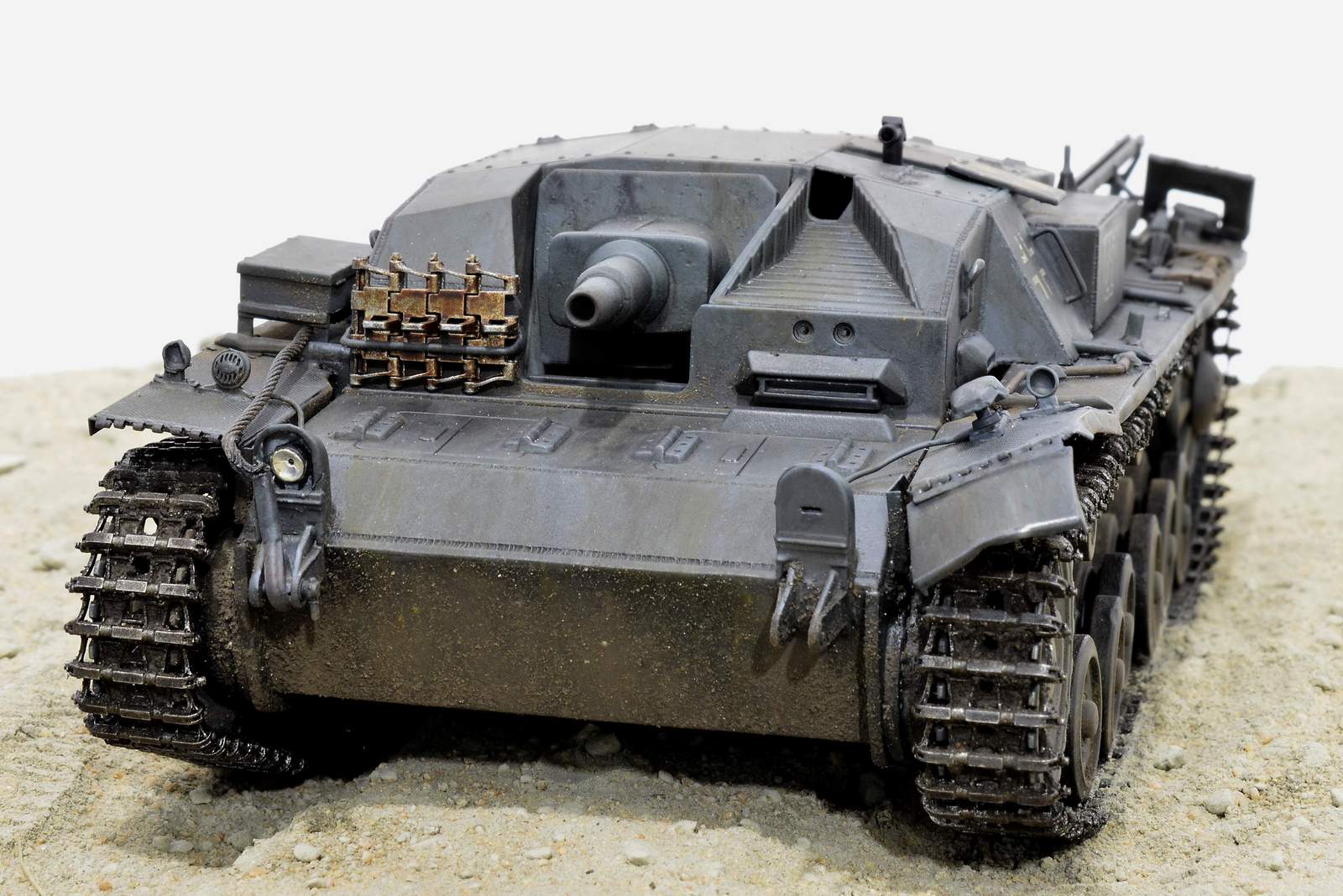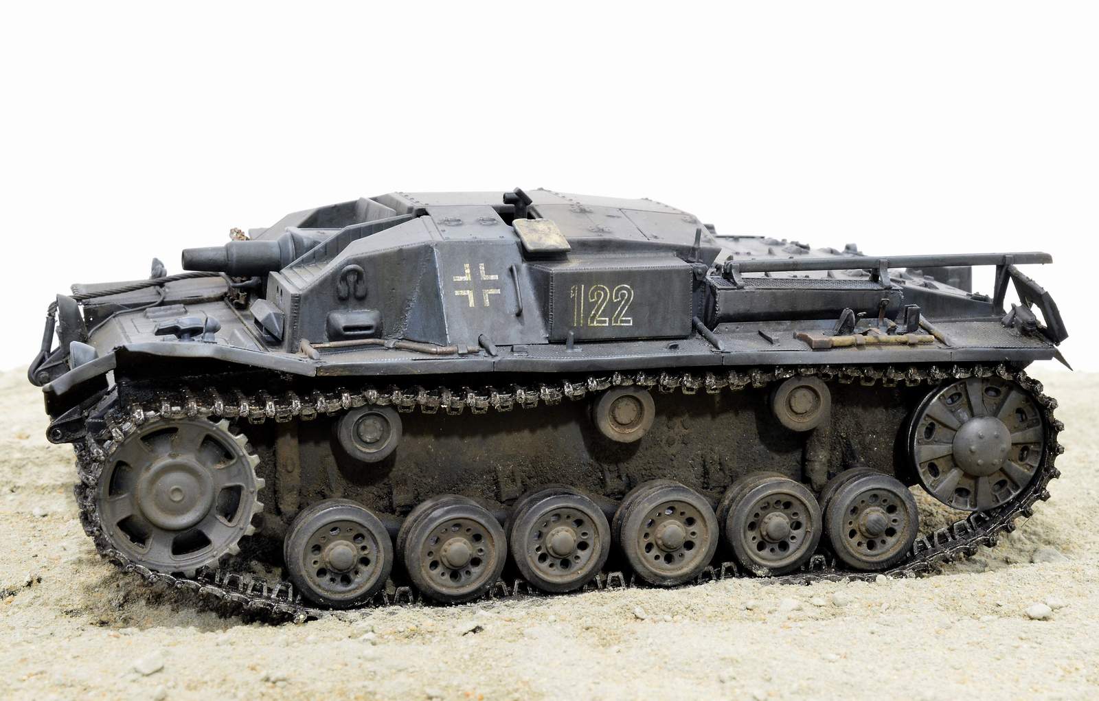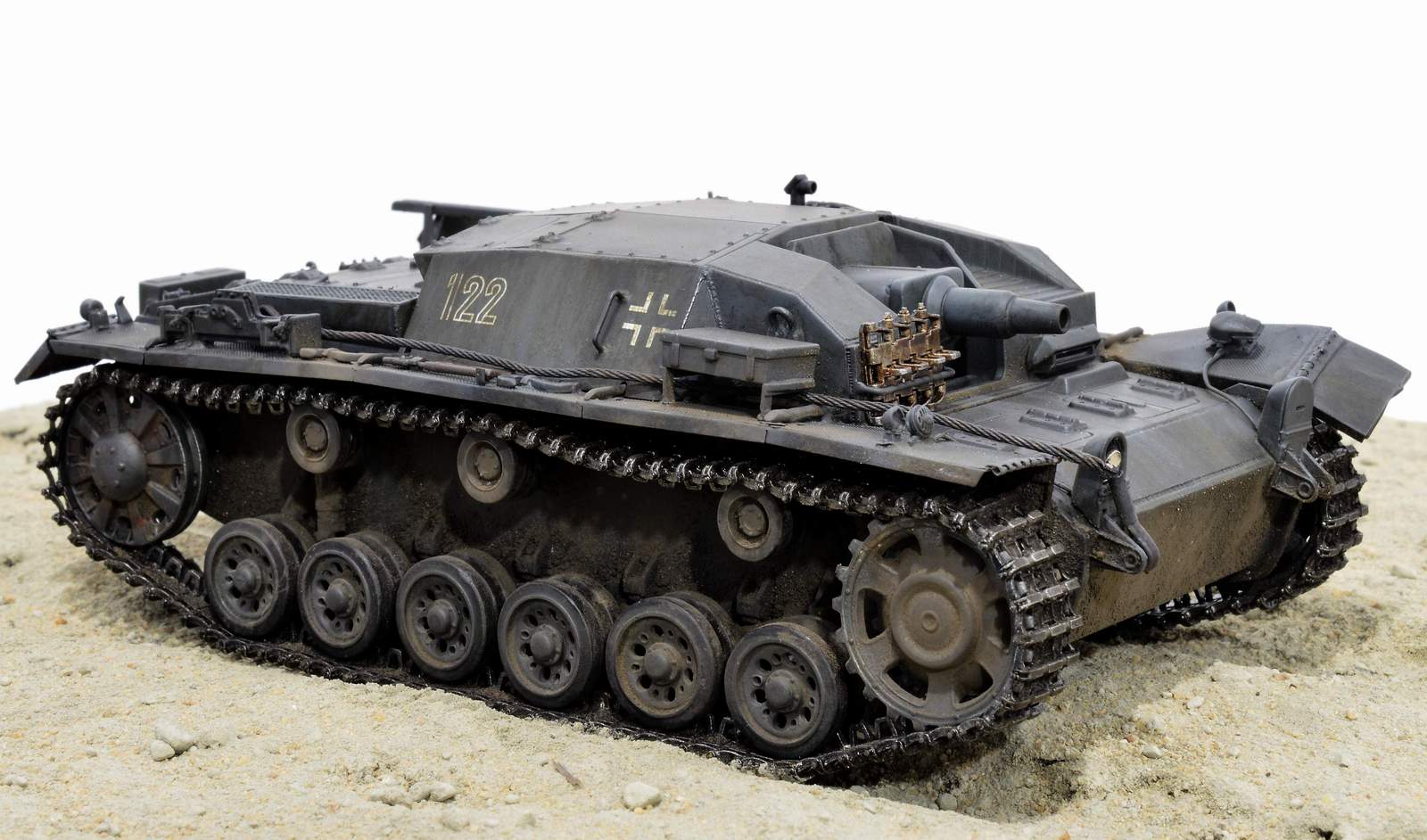 Выставляю на всеобщее обозрение самоход от ЗВЕЗДЫ StuG III Ausf. B. Непервый раз делаю эту модель, но даётся достаточно сложно. Литники очень толстые, много облоя, но бороться можно. Вся модель почти из коробки, в матчасть не углублялся, добавил только сварные швы, в некоторых местах даже «перестарался». Добавил траки Мастер Клуб, надгусеничные полки Part, фара Эльф, звёздочка Friulmodel AW-02 . При установке надгусеничных полок появилась некоторая переразмеренность, поэтому подгонять пришлось довольно долго.
