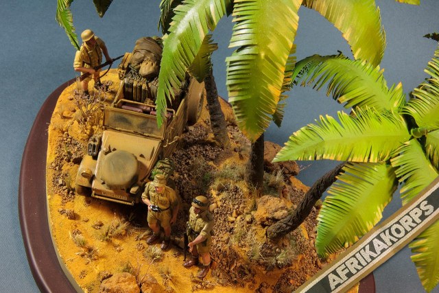 В стройке участвовал kubelwagen от Tamiya и фигуры Mиниарта. Из допилов : крепления для канистр, пружины на спинках водительского и пассажирского сидениях, ремни на оружии. Использован чуть-чуть перепиленный набор смолы от "типаBlackdog"... долго не мог определиться с выбором ветрового стекла , выбирал между зачехленным и поднятым. Краски и эффекты Vallejo, Mig, Tamiya и Modelmaster. Было несколько трагических моментов, взлетов и падений(буквально=)), но итогом своей работы я доволен.