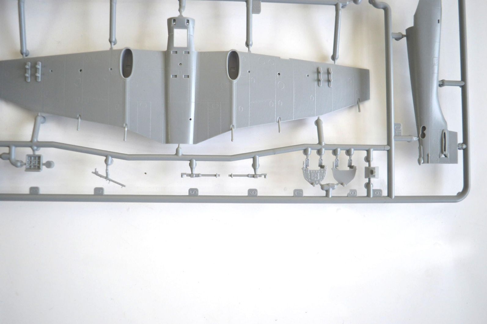 В модели заявлены 75 деталей, пусть будет так, пересчитывать лень :) Отливки достаточно хорошего качества, правда, кое-где заметил маленькие утяжины. Пластик с какими-то серебристыми брызгами, то ли нарушение температурного режима, то ли так и должно быть. Расшивка тонкая, но очень мелкая, и в некоторых местах уже пропадает. Имхо, если не прорезать, подслоями грунтовки и краски пропадет совсем. Фонарь дан только в закрытом варианте, он тонкий, прозрачный и достаточно тонким переплетом.