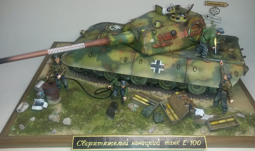 Привет всем коллегам - моделистам. После летнего отпуска выкладываю свою очередную работу. Всем известный бумажный танк Е-100, который был изготовлен в конце войны в 2 экземплярах, да и то одни корпуса, без башен. Прочитал , что Трамп башню ( которую он даёт на своей модели ) просто выдумал !!!! Мол там планировалась башня от Мауса ( которую кстати даёт Драгон )...правда ли это ????. Но всё равно очень интересный танк...и можно дать волю фантазии....всё равно в реалии такого танка не было ...а только на бумаге :)))))). Сам кит простенький, собирается легко и без проблем, от себя добавил проводку к ПНВ и цепь. Танкисты от Академии, хоть и написаны что 35...но мне кажется что это 32...с обычным Тигром , смотрятся гигантами....а с этим более-менее....:)))). Подставку делал сам из картона , почва - гипс, трава - сан.тех.лен и сухой укроп :))) Указатели и маркировка на танке - моя фантазия :). Добавил всякой мелочи для калорита. Всем приятного просмотра :)))