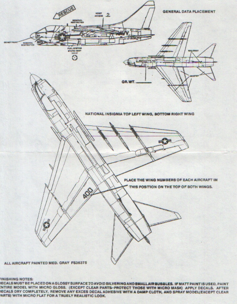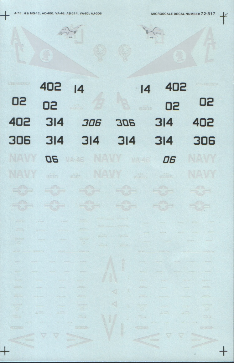 Декаль на три разных борта модификации А-7Е, но все в окраске малой заметности. Полный комплект обозначений на три модели.