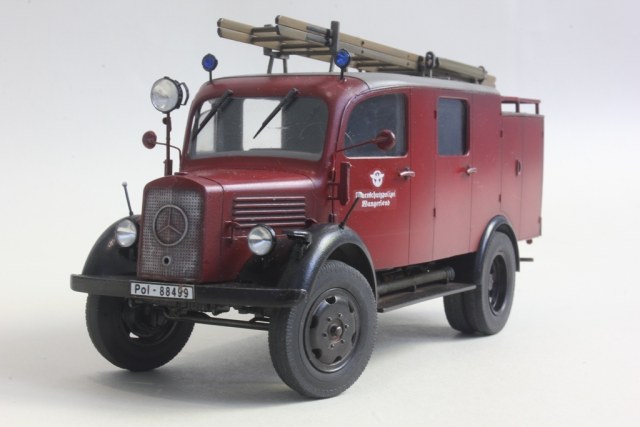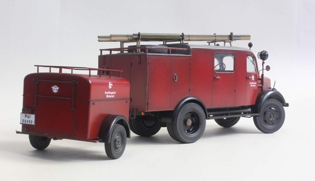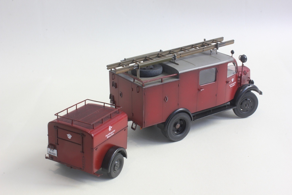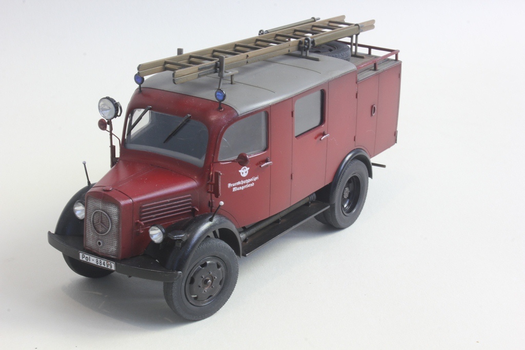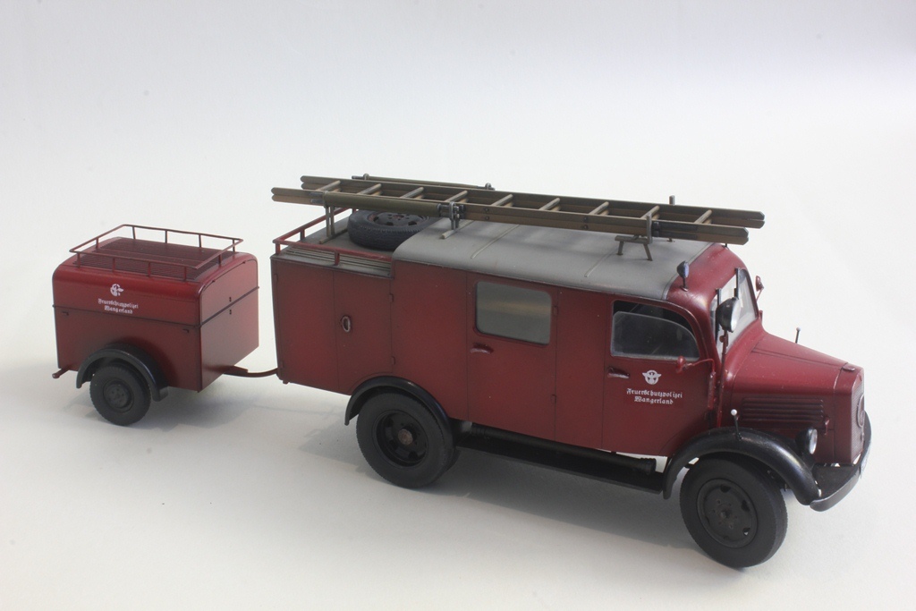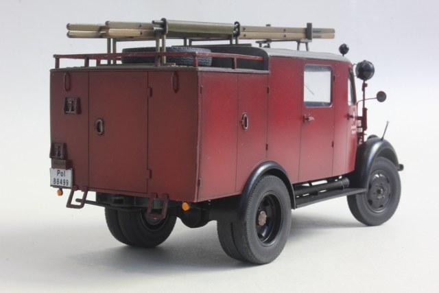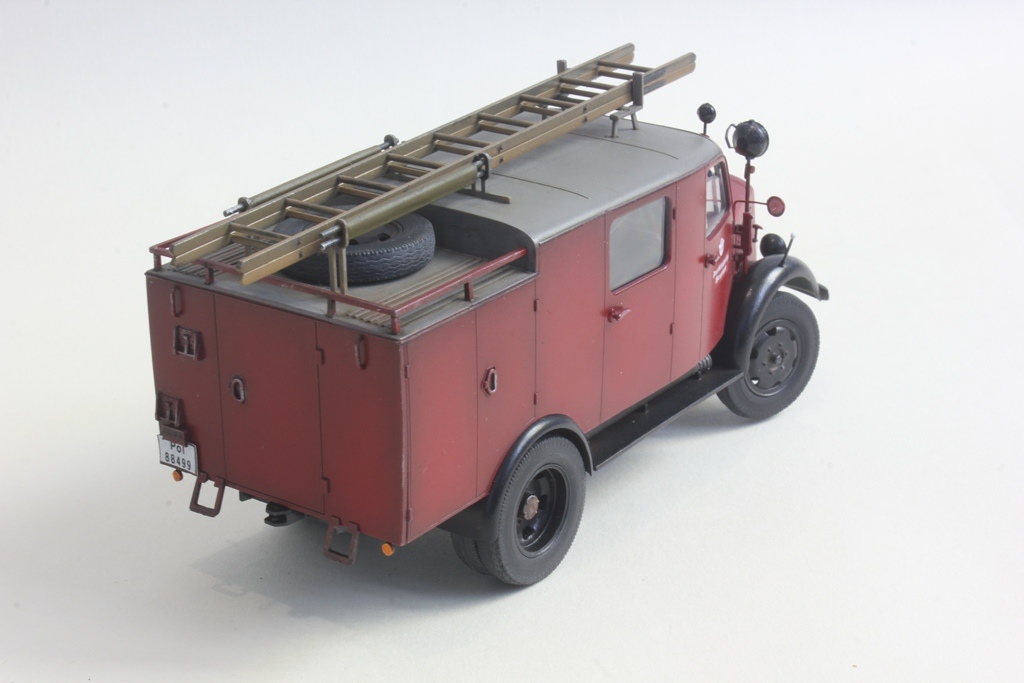 При такой маркировке и госномерах он, к сожалению, просто обязан быть темно-зеленым. Номера и эмблема на машине довоенные полицейские (в III Рейхе пожарная служба относилась к полицейскому ведомству), а полицейские машины тогда были зелеными.