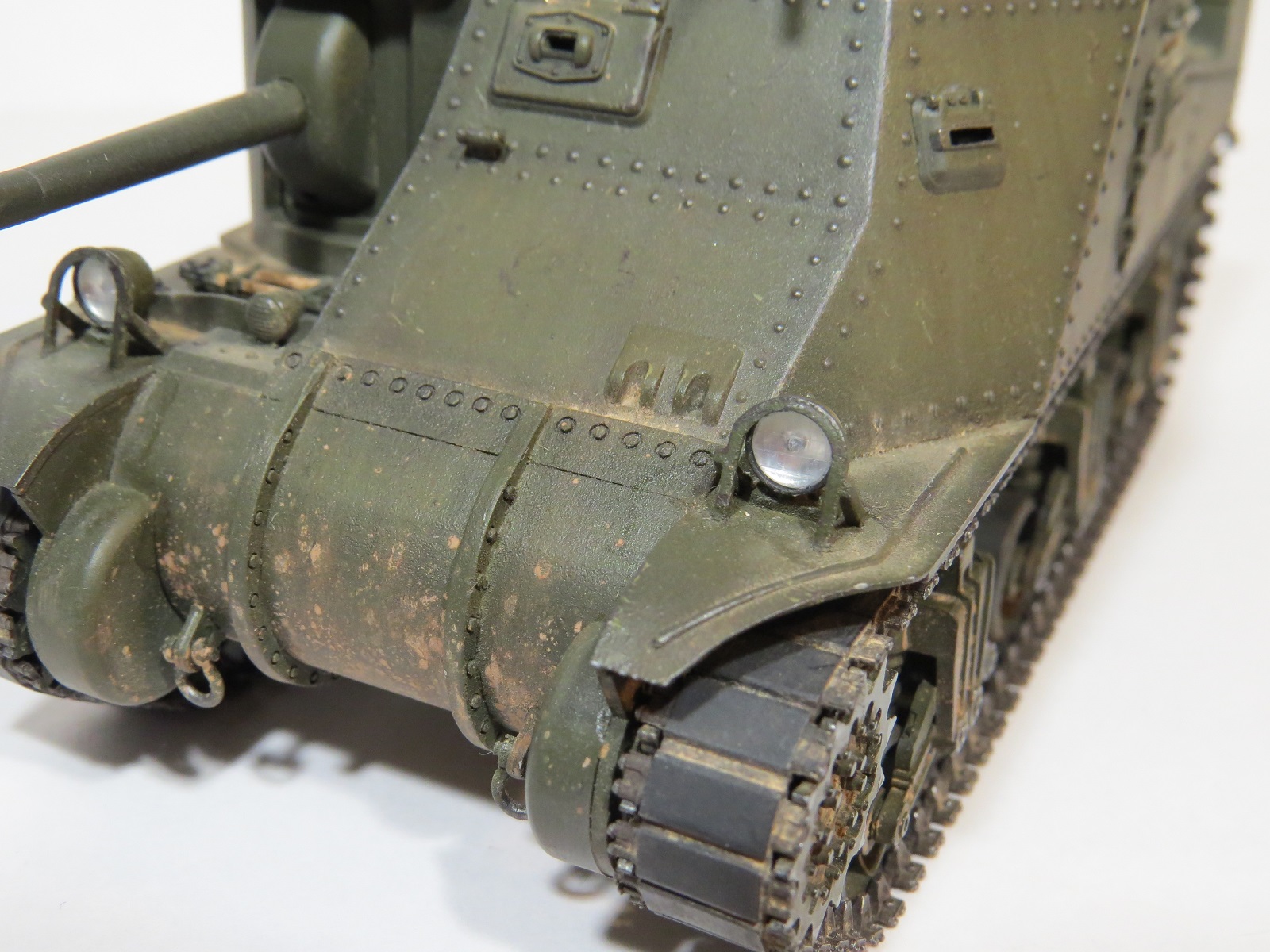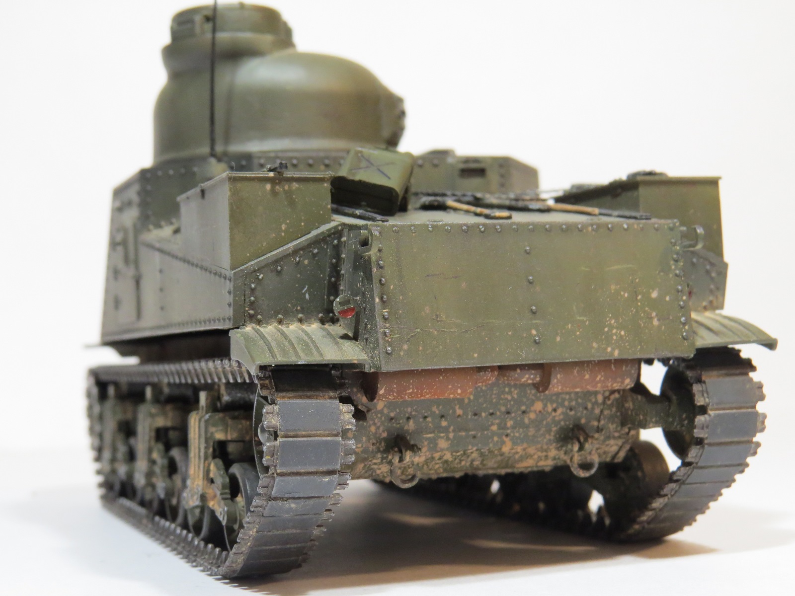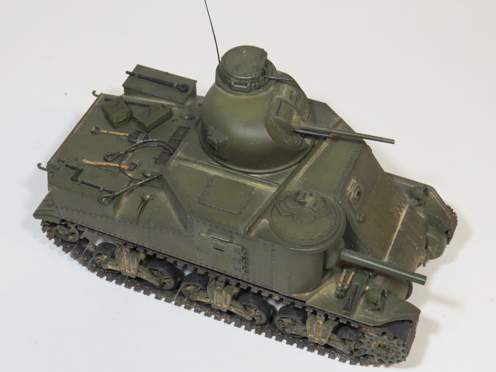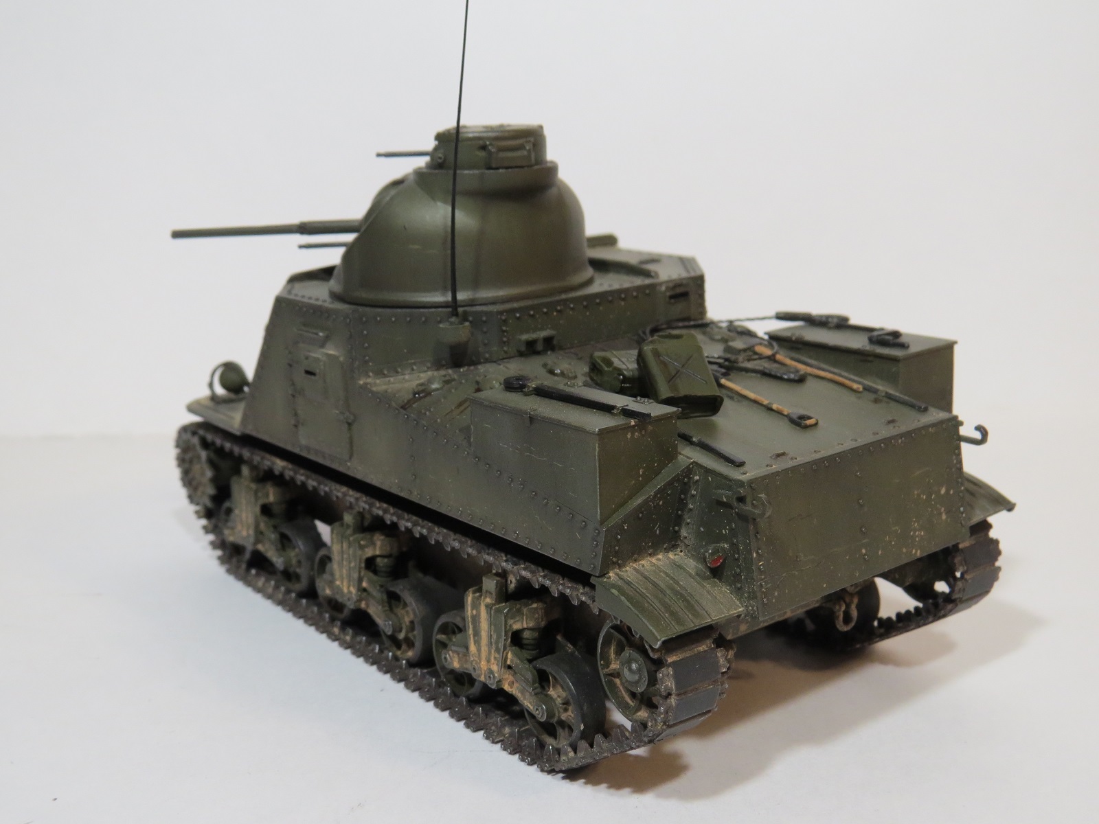 Перейдём к покраске. Красил я его акрилом Tamiya(XF-60 Olive drab)-базовый цвет, выстветления-(XF-62 Olive drab+XF-57 Buff);фильтры, смывка-MIG;сколы-краска Vallejo (70822);пигменты-MIG(на ходовой делал фиксером,на корпусе пыль втирал насухо).Потеки масла-морилка цвета ДУБ.,патрубки ржавые-также пигмент
