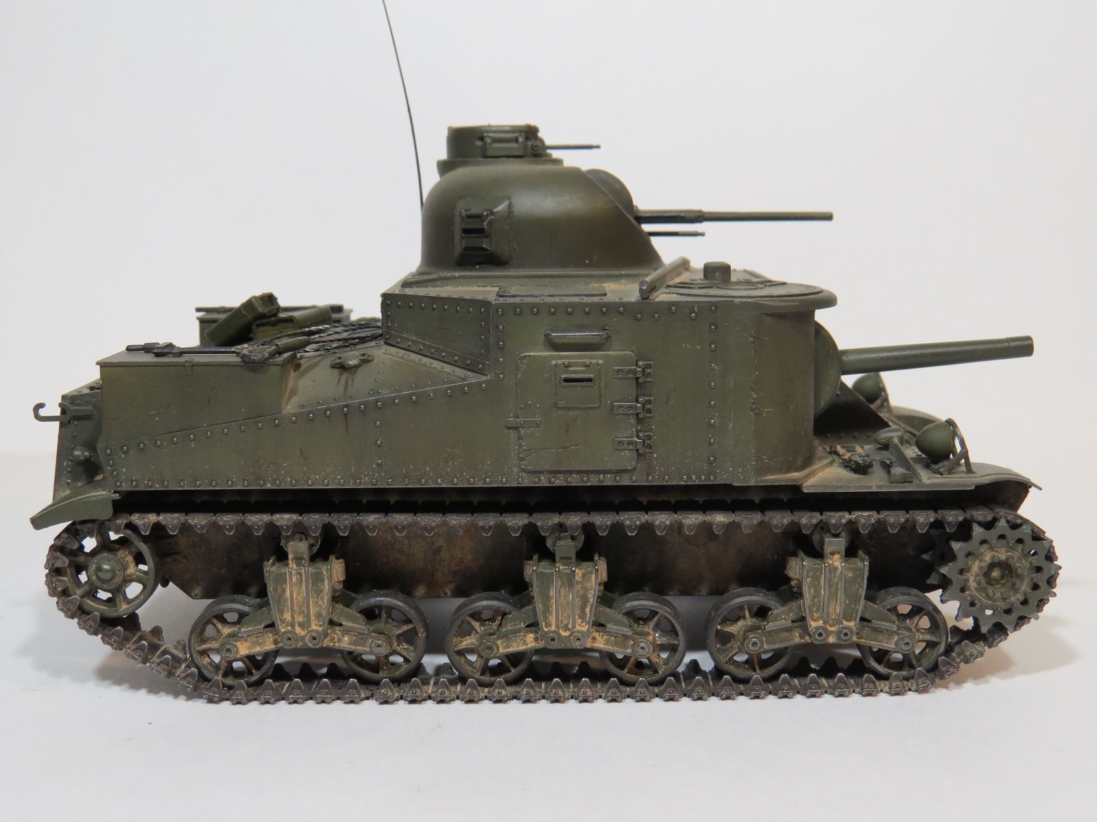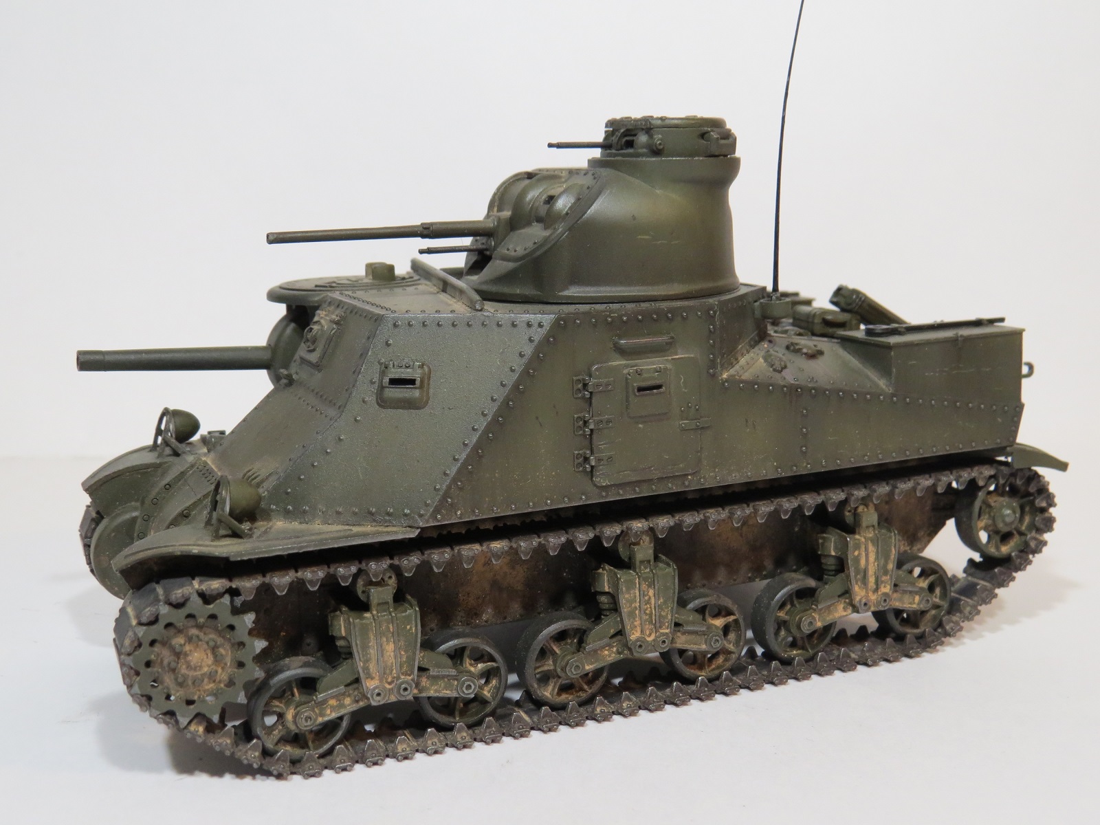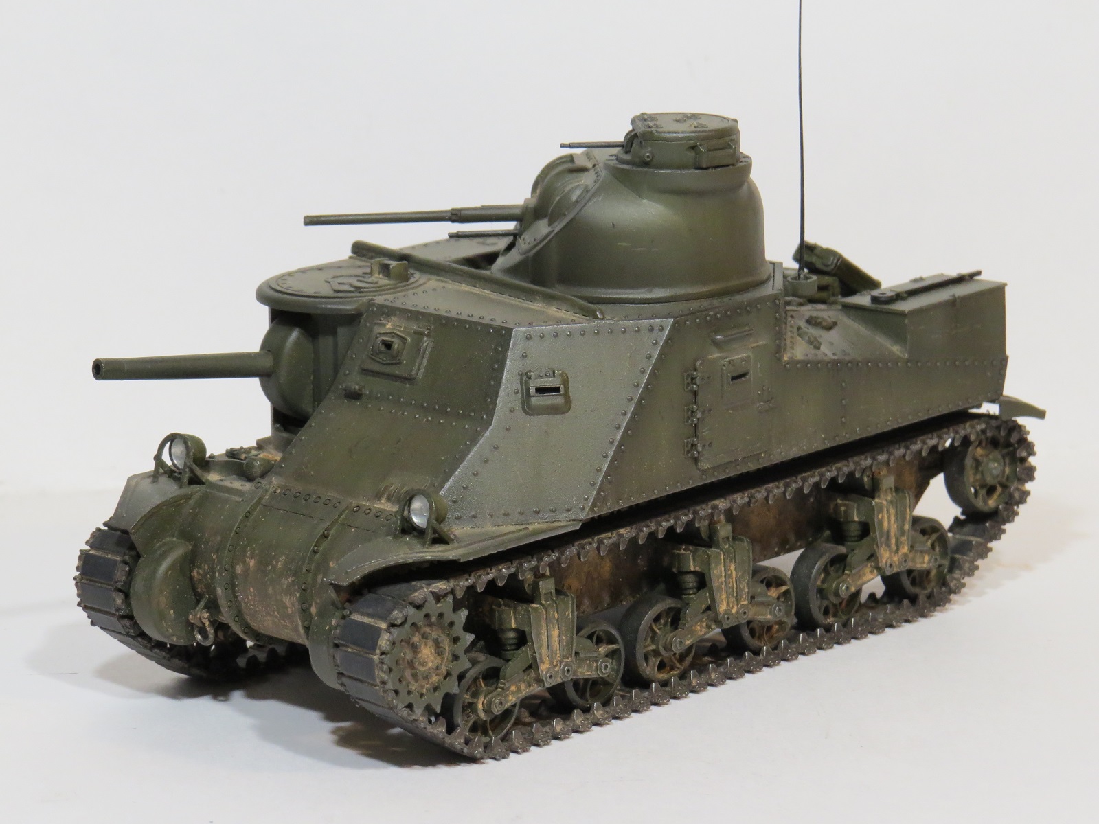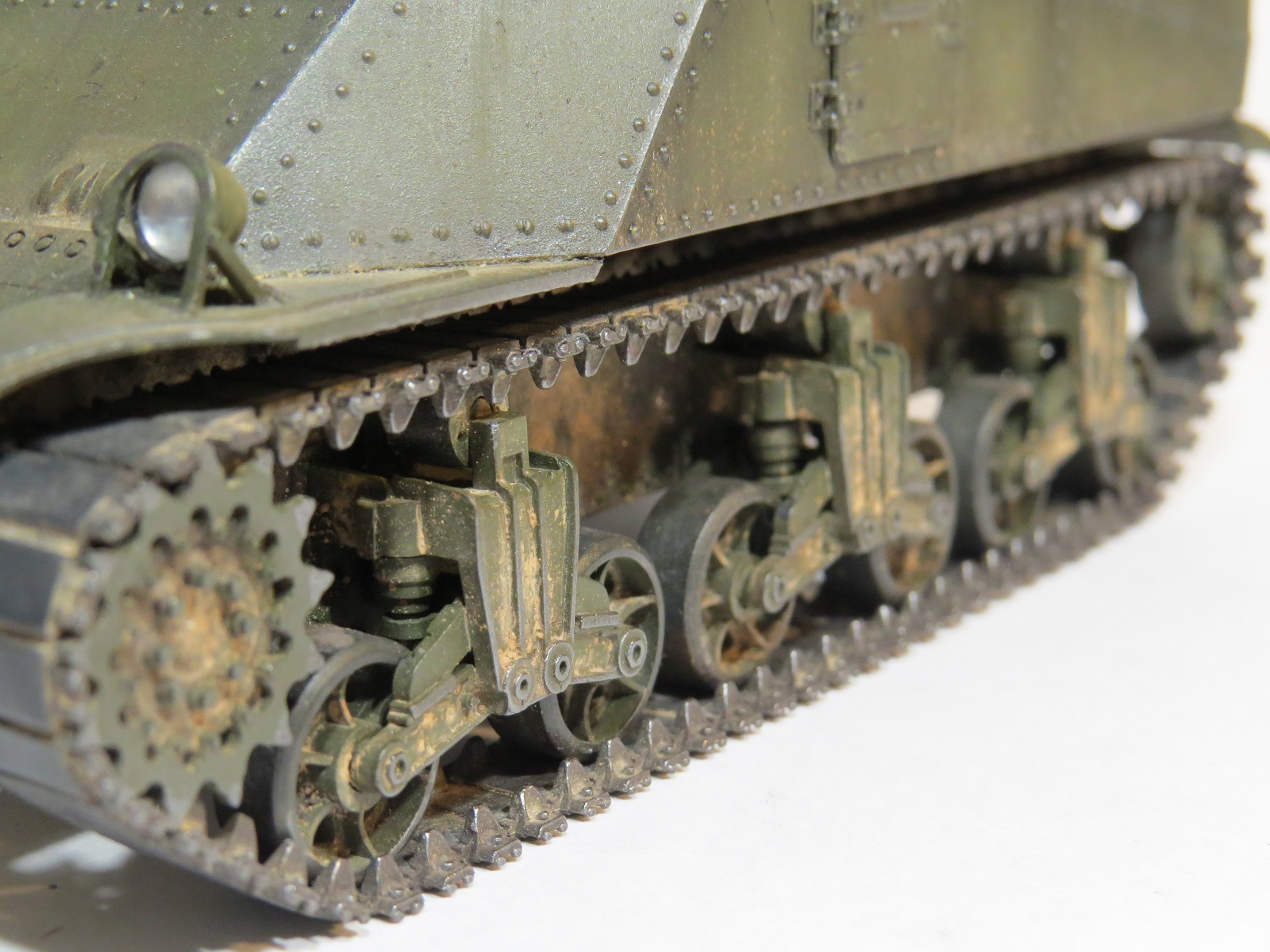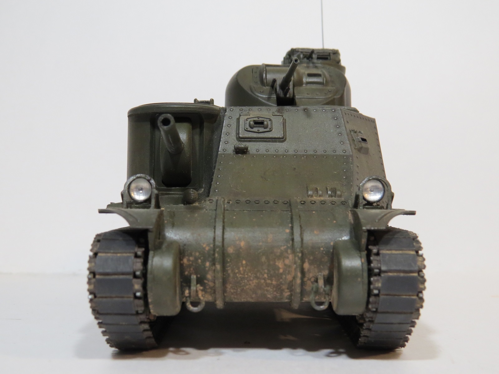 Перейдём к покраске. Красил я его акрилом Tamiya(XF-60 Olive drab)-базовый цвет, выстветления-(XF-62 Olive drab+XF-57 Buff);фильтры, смывка-MIG;сколы-краска Vallejo (70822);пигменты-MIG(на ходовой делал фиксером,на корпусе пыль втирал насухо).Потеки масла-морилка цвета ДУБ.,патрубки ржавые-также пигмент