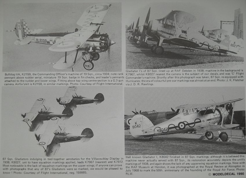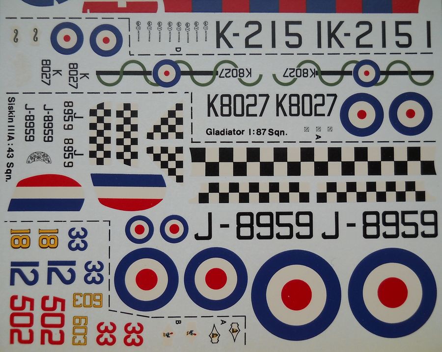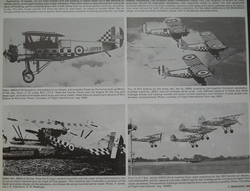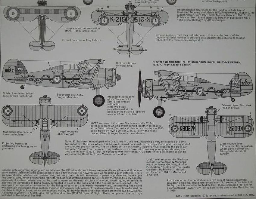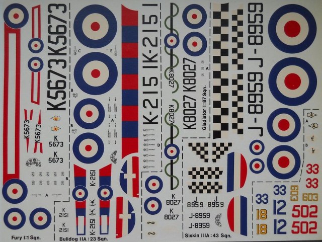 Декальот Modeldecal (масштаб 1/72, номерпокаталогу 31а) содержитпоодномувариантуна Hawker Fury I, Bristol Bulldog IIA, Gloster Gladiator I, A.W. Siskin IIIA.