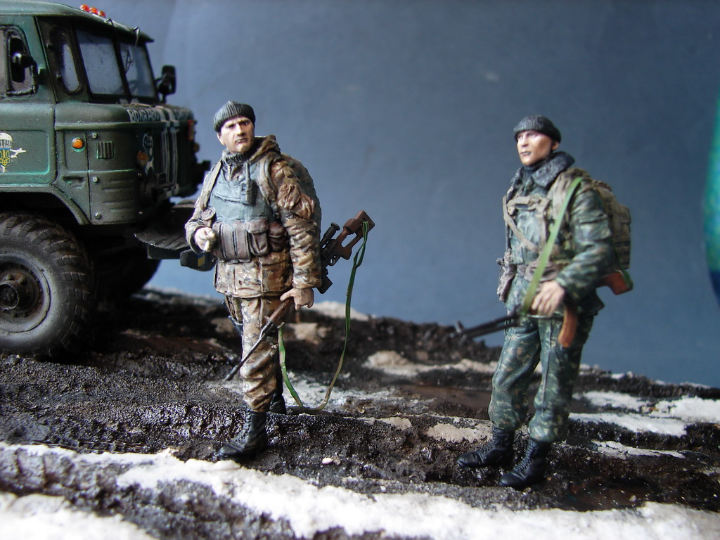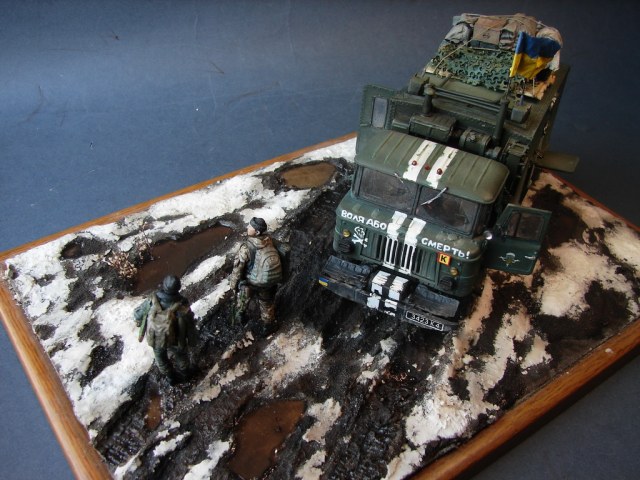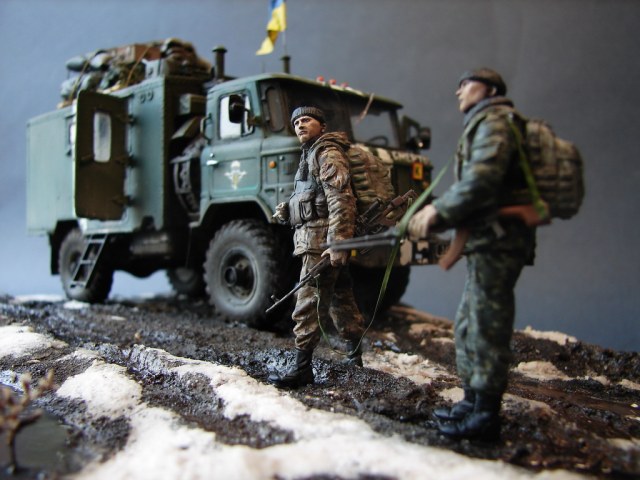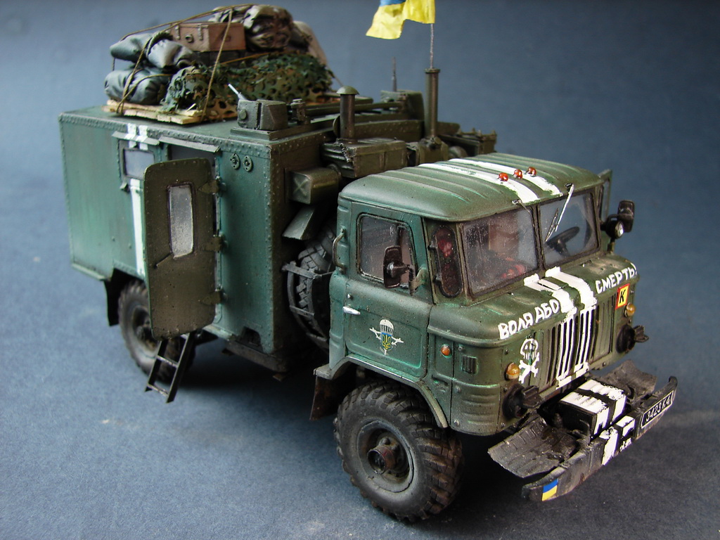 Практически все сделано "с нуля".От основы осталась рама и частично-кабина.Кунг и все остальное сделано заново.Колеса-исправлены ступицы.Фигуры-"Танк"
