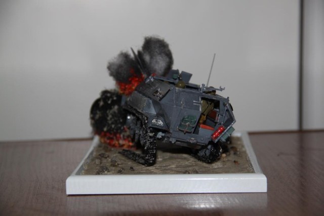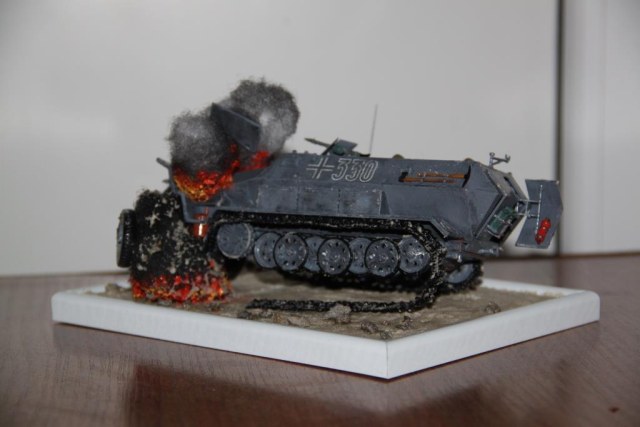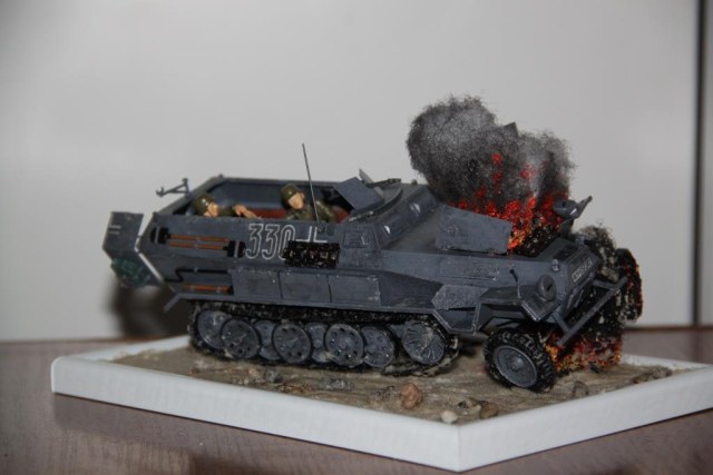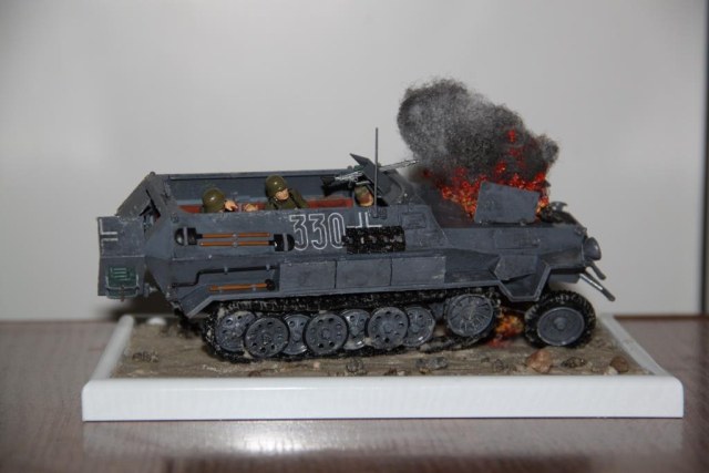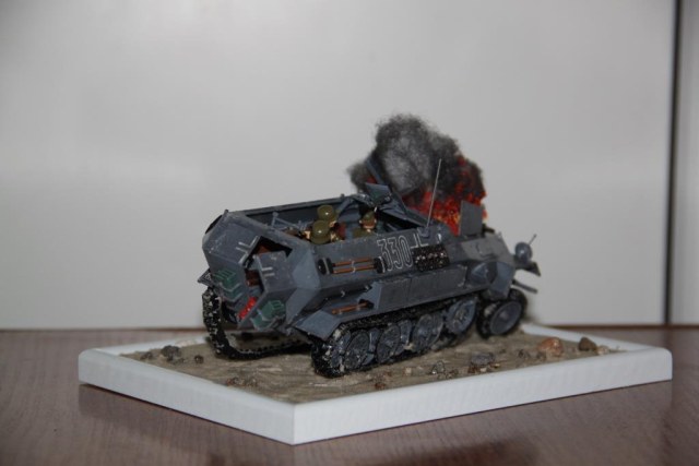 По легенде, Ханомаг подорвался на фугасе, осколки пробили топливную систему и в моторном отсеке тут же загорелось топливо.