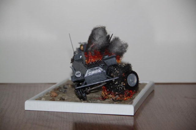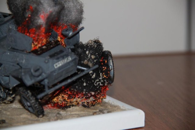 Взрыв и огонь действительно хорошо получились, понравились. Но при этом солдаты блестят, покрашенны они однотонно, лиц у них почти нет, основание какое-то... простоватое, что ли. На будущее, при создании диорамы нужно уделять внимание всем элементам. Или сначало тренироваться в росписи фигурок, затем работать с техникой и ландшафтом, потом уже всё это собирать в диораму. Я думаю, что после отработки и улучшения навыков у вас будут получаться хорошие диорамы! Успехов в работах.