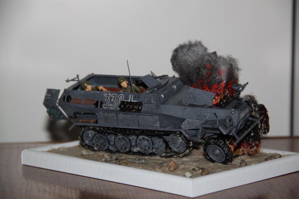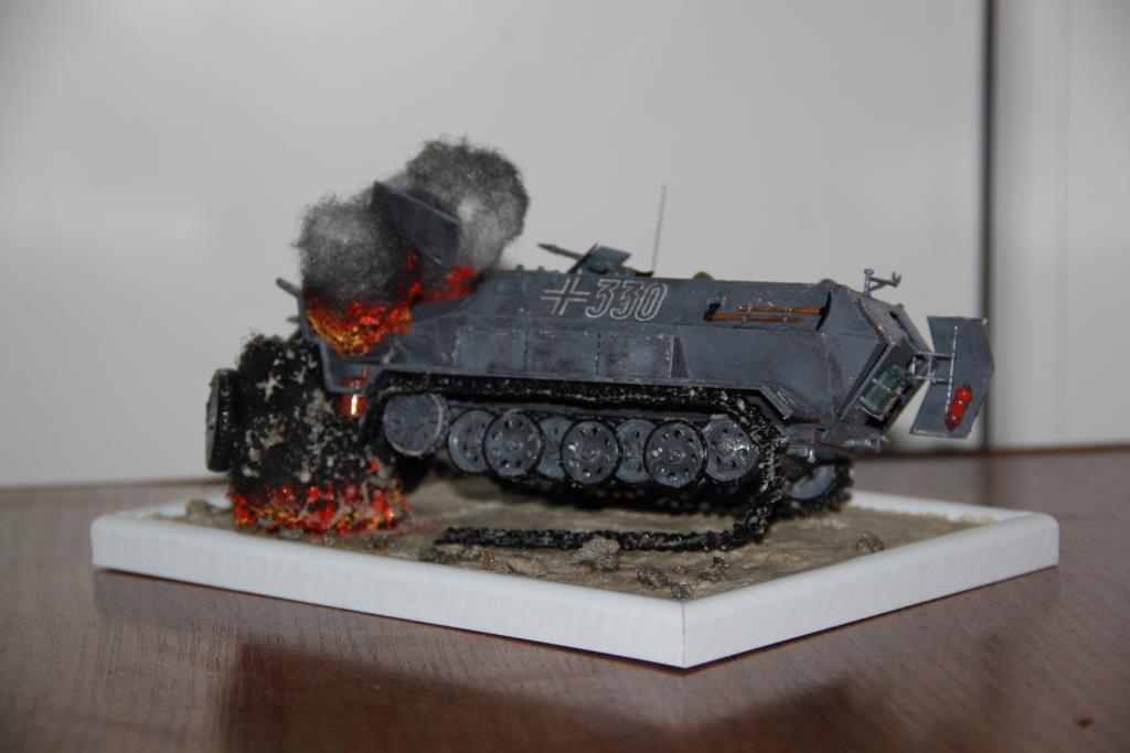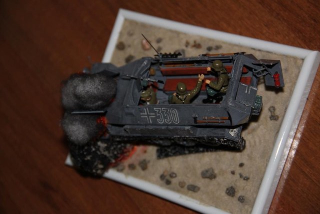 я сначала думал что это 72-й масштаб, но оказался 35-й. слабенько, задумка хорошая, но слабенько. взрыв и огонь очень хорошо получились, но в остальном прям бяда-бяда-огорчение... наверное повторюсь с коллегами, но блеск сразу портит всё! используйте матовый лак. на месте взрыва должна образоваться вотронка взрывной волной, а у Вас он как бы из воздуха образовался. ну окрас однотонный, смывки нет. переходите на аэрограф, сразу модели будут другими, побольше терпения и перед каждой новой идеей диорами покапайтесь по фоткам, много почерпнёте полезного и интересного.