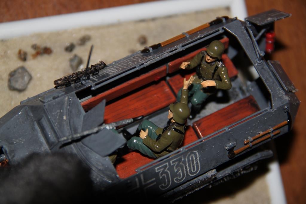 Спасибо! Будем стараться. В данной экспозиции основное внимание уделялось ханомагу. Попробывал применить тонировку к водителю, на мой взгляд получилось не очень, хорошо что не видно! Поэтому остальные солдаты не тонировались. Основа - эксперемент с кварцевым песком, на мой взгляд, если бы не камни, то был бы просто ужас.