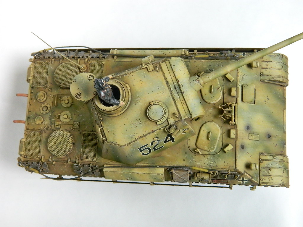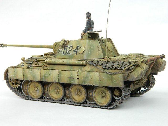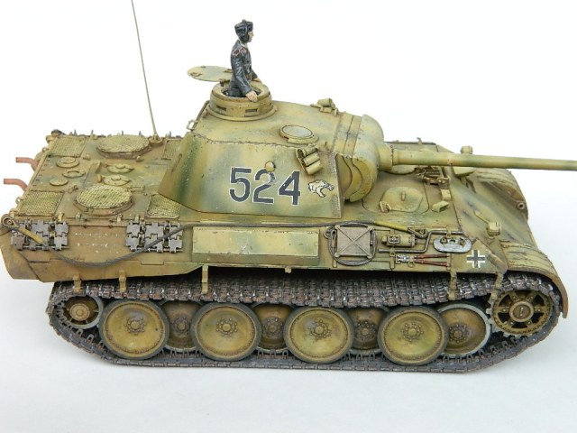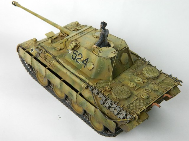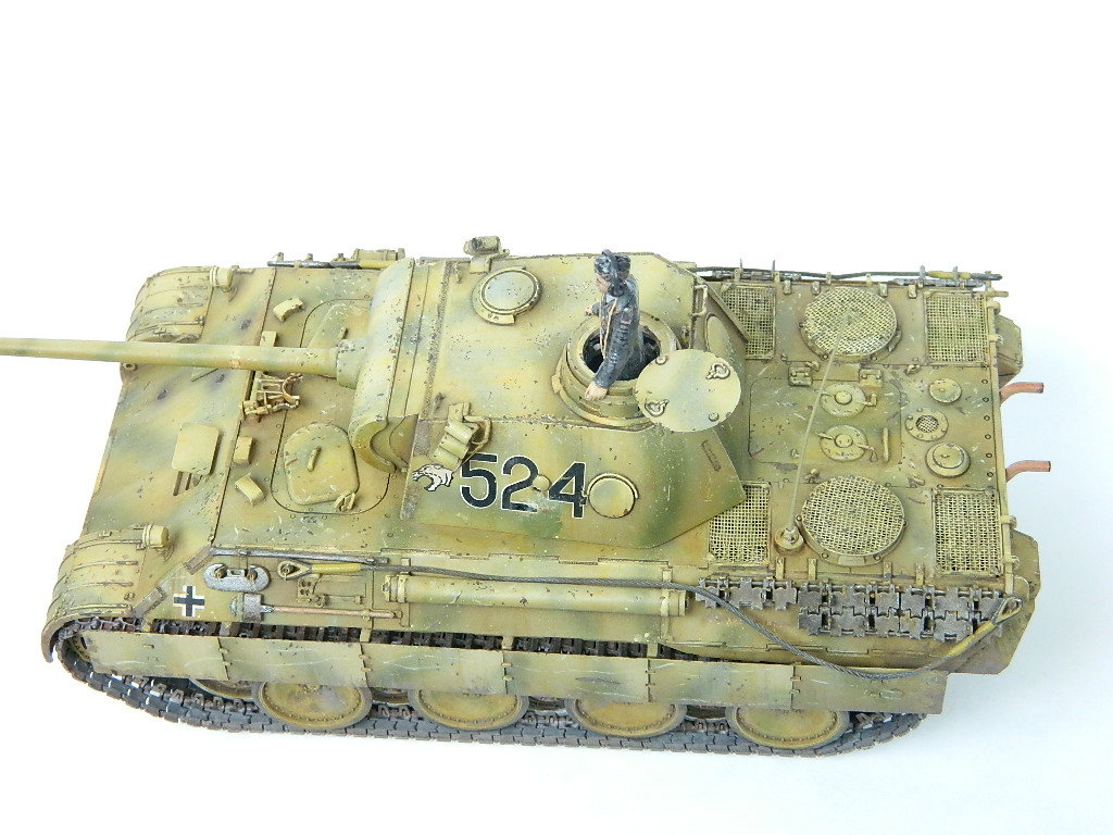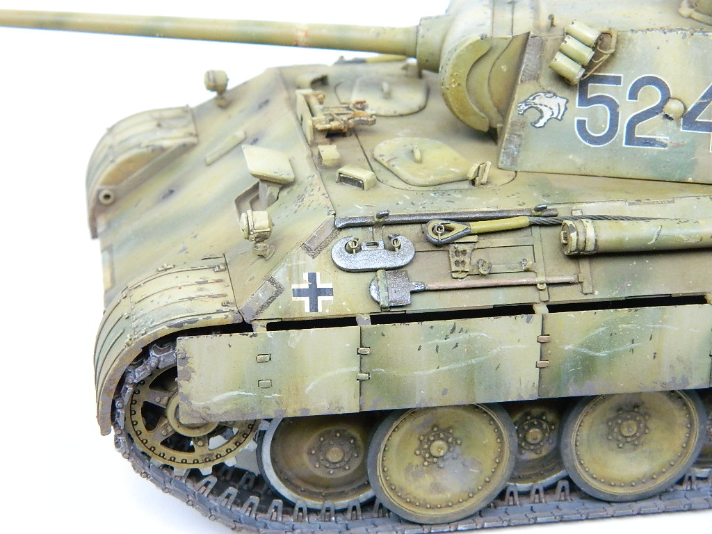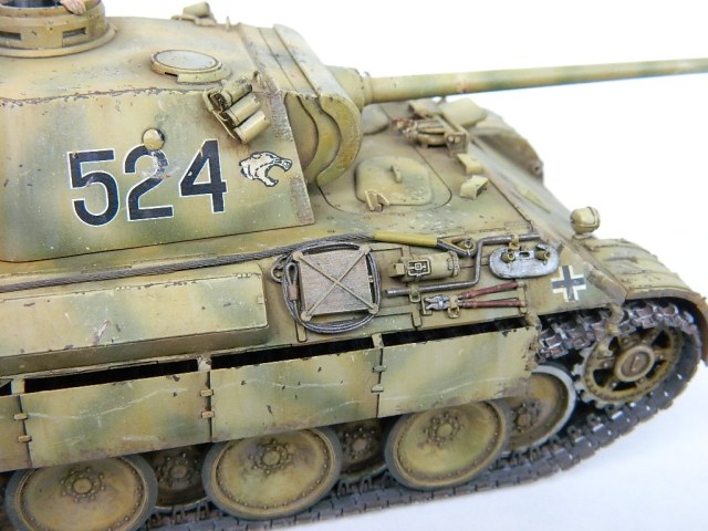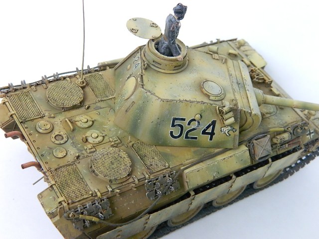 По легенде пантеры при наступлении попали под огонь замаскированных 85-мм зениток.К сожалению,пробить лобовую броню они не смогли,но у 524-й заглох мотор и был ранен радист,вдобавок советский пулемётчик метко выпустил половину ленты по прицелу,лишив машину возможности отстреливаться(кстати,такой же "борьбой" с танками занимался Василь Быков,что впоследствии и описал в автобиографической повести "Мёртвым не больно").При эвакуации русские опять открыли огонь,но,хоть и с потерями,но оттащить большинство повреждённых танков всё же удалось. Ремонт был закончен аккурат к началу отступления. Вот такой посечённый снарядами,пулями и осколками танк и была попытка изобразить.Щель между ВЛД и НЛД пусть будет результатом сдвига первого под ударами снарядов.