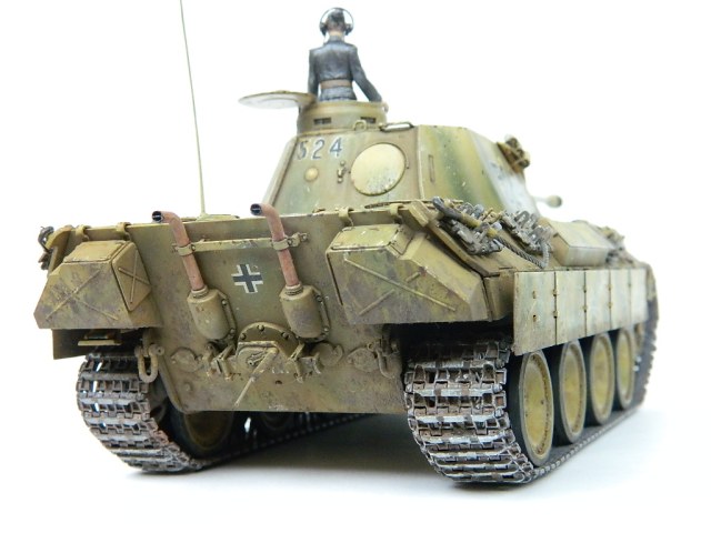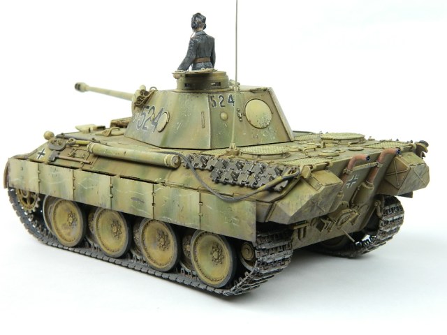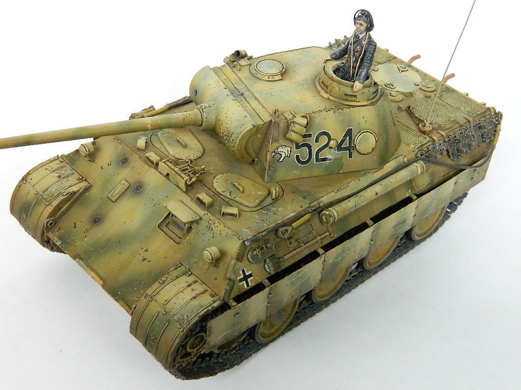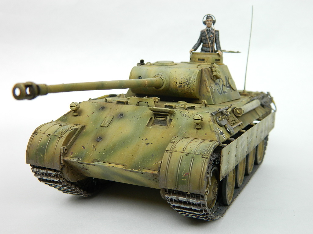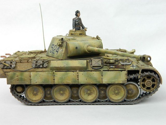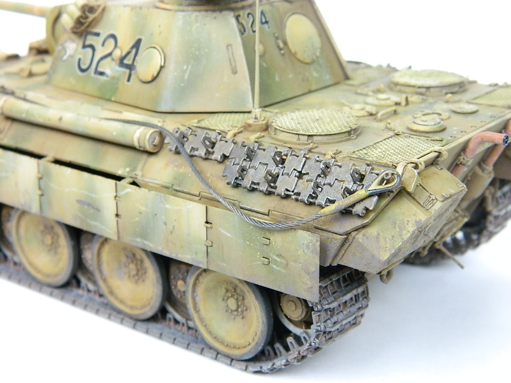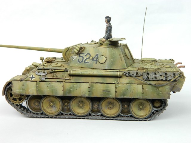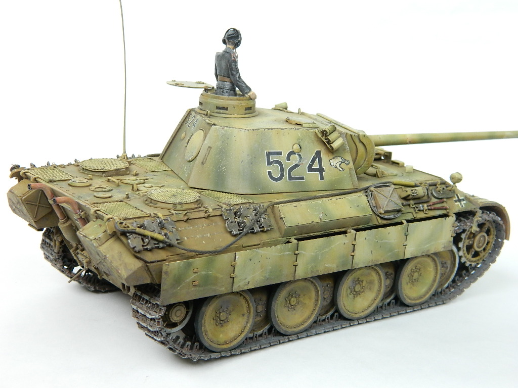 По легенде пантеры при наступлении попали под огонь замаскированных 85-мм зениток.К сожалению,пробить лобовую броню они не смогли,но у 524-й заглох мотор и был ранен радист,вдобавок советский пулемётчик метко выпустил половину ленты по прицелу,лишив машину возможности отстреливаться(кстати,такой же "борьбой" с танками занимался Василь Быков,что впоследствии и описал в автобиографической повести "Мёртвым не больно").При эвакуации русские опять открыли огонь,но,хоть и с потерями,но оттащить большинство повреждённых танков всё же удалось. Ремонт был закончен аккурат к началу отступления. Вот такой посечённый снарядами,пулями и осколками танк и была попытка изобразить.Щель между ВЛД и НЛД пусть будет результатом сдвига первого под ударами снарядов.