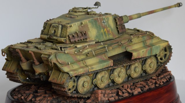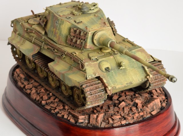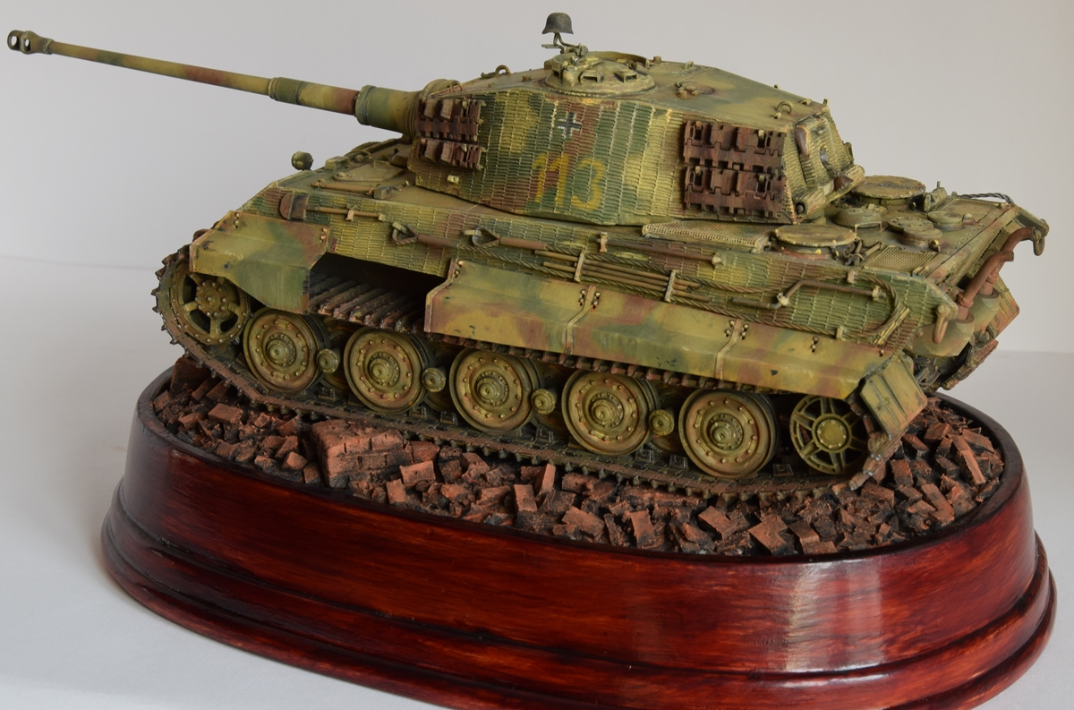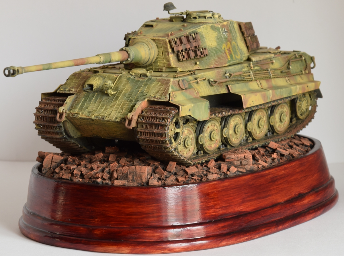 Сильная работа. По отдельности понравились и танк, и кирпичи. Очень редко критикую модели (не считаю себя достойным), но- при неплохо переданой низкокачественной полупрозрачной краске конца войны, навряд ли краска, используемая для нанесения тактического номера имела такие же характеристики укрывистости- я думаю,что она была явно ярче. Но это скорее претензии не к Вам, а к производителю. И еще бросаются в глаза АБСОЛЮТНО ровные гусеницы, а ведь по идее, он стоит на неровной поверхности. Но в целом- очень понравилось и окраска танка и грунт.