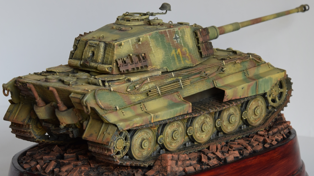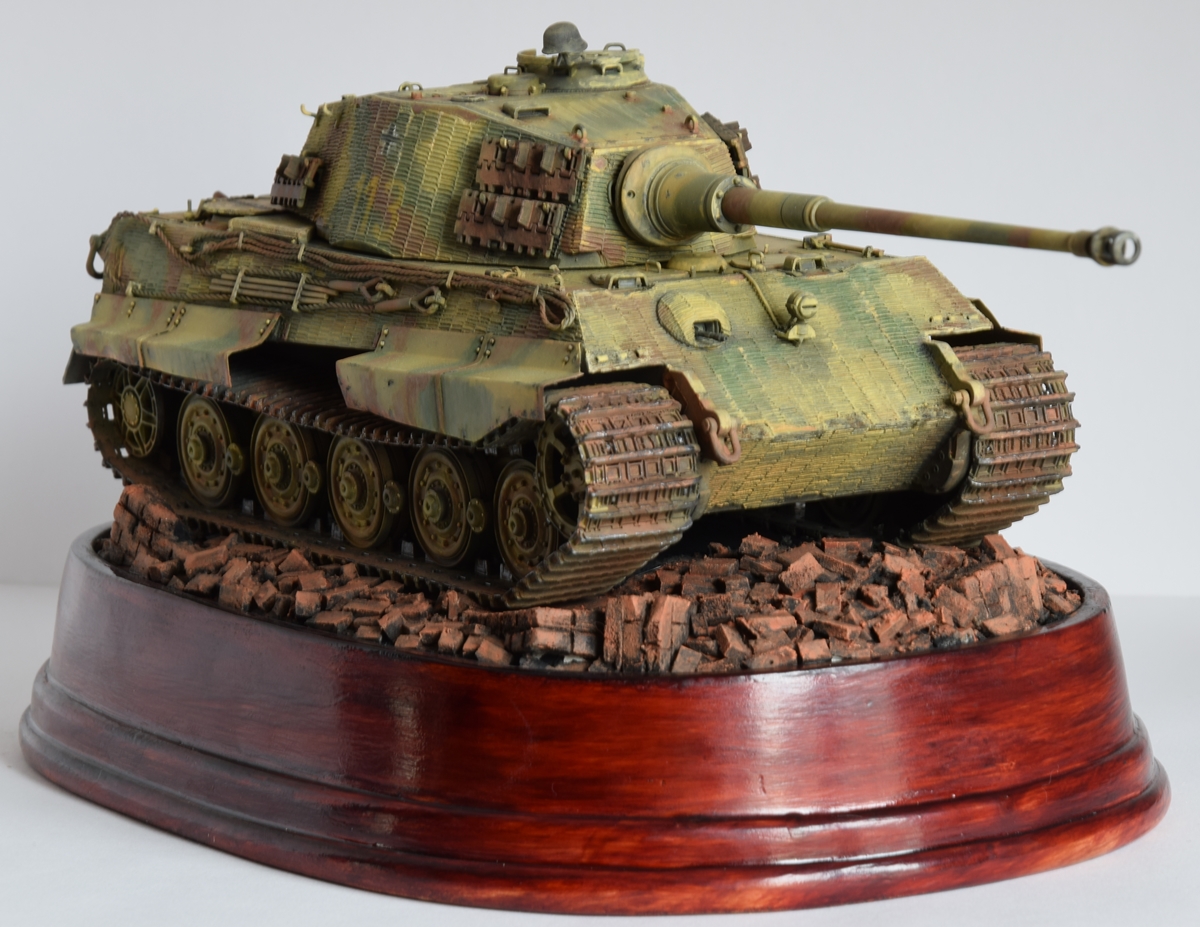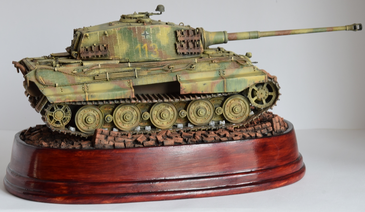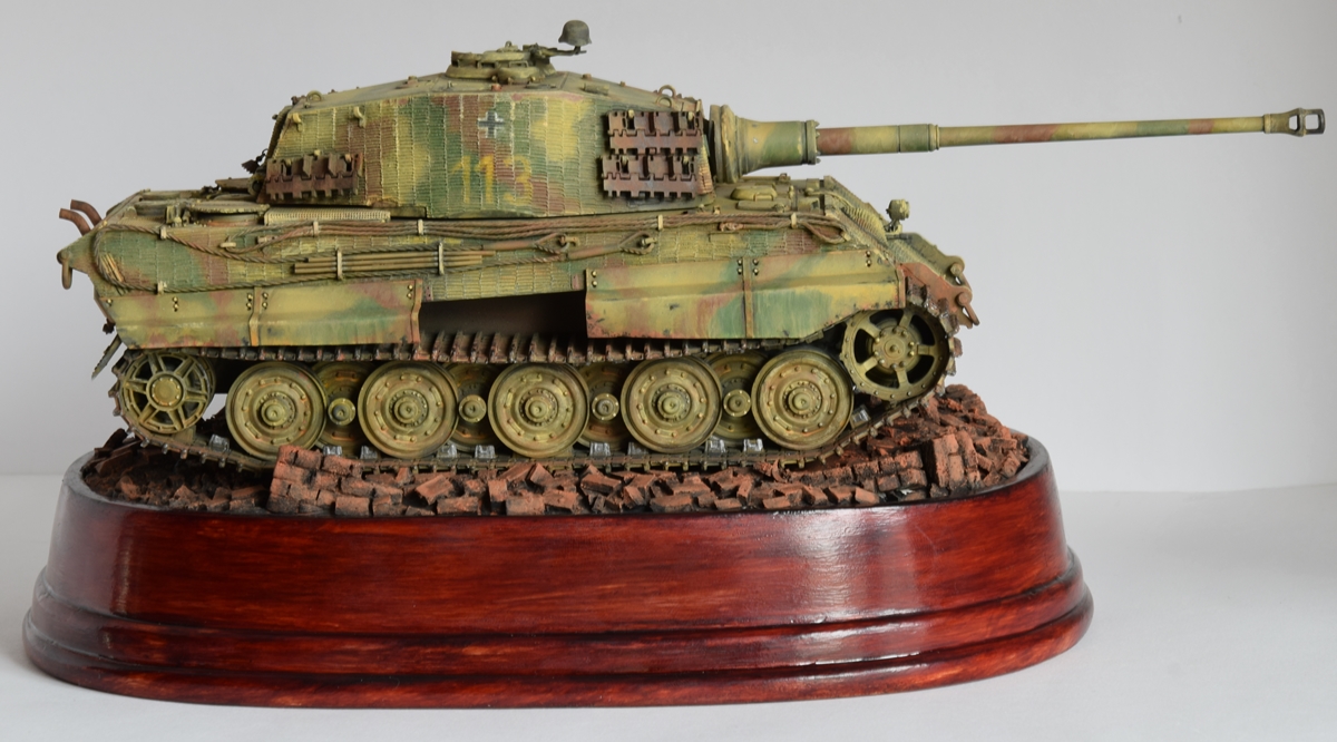 Здравствуйте. “ Королевский тигр” от Dragon,сборка с небольшими дополнениями. Из фольги сделаны бортовые экраны, родные тросы заменены на капрон, ну и основание. Окрашено художественными темперными красками